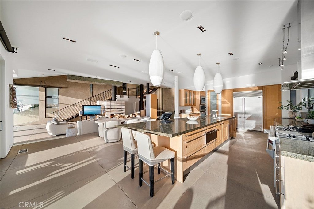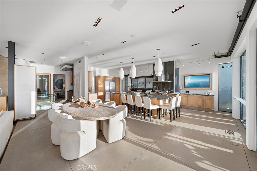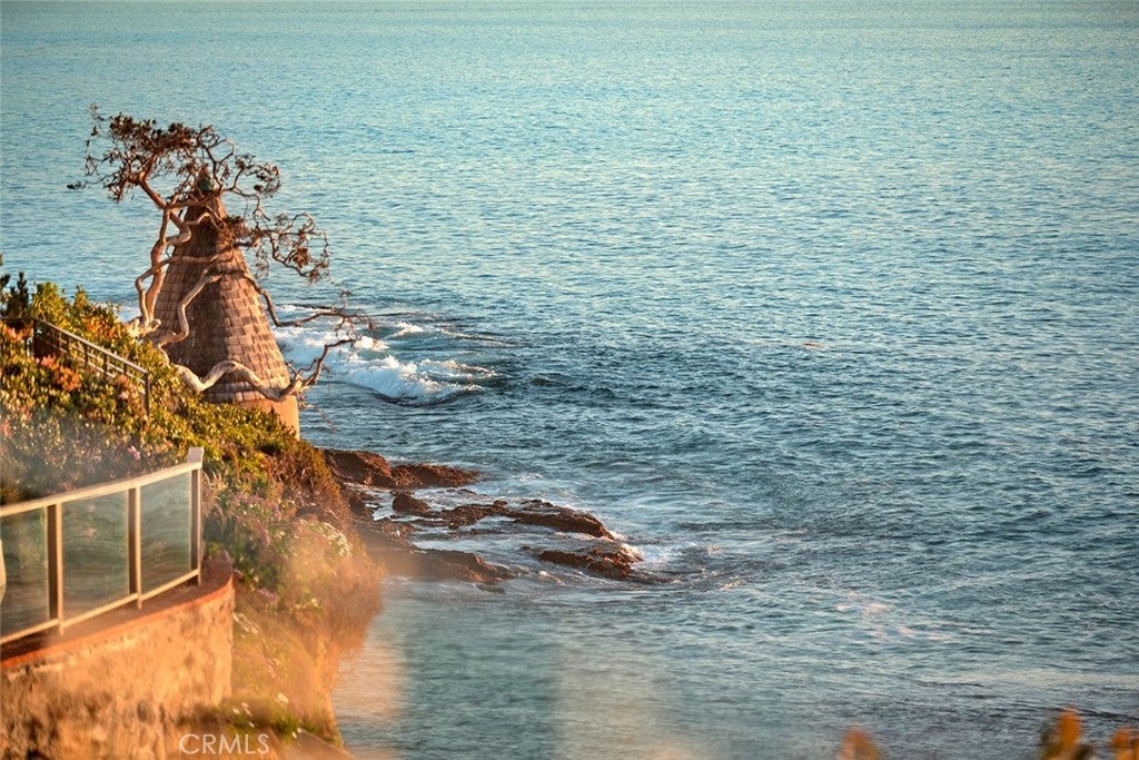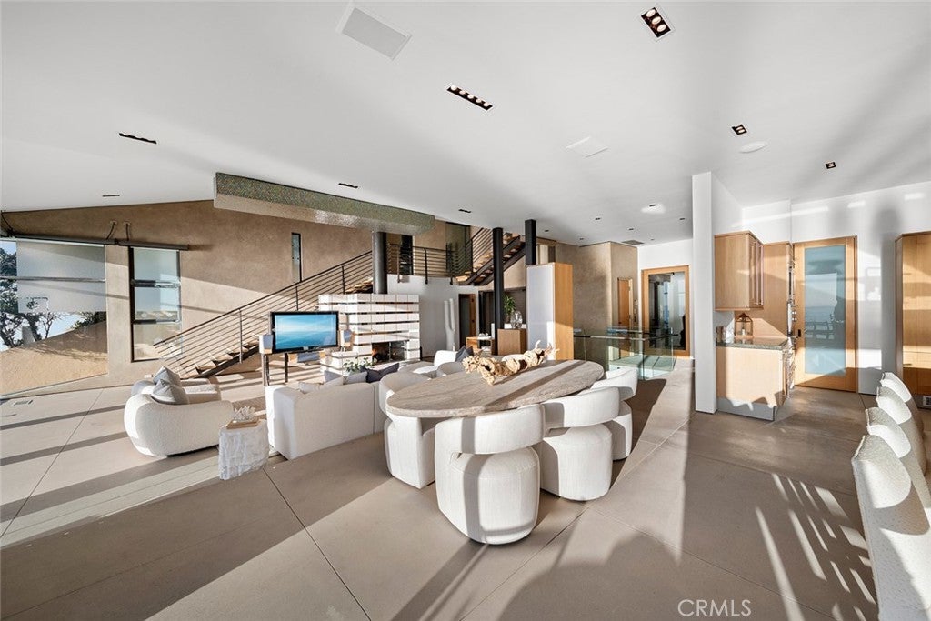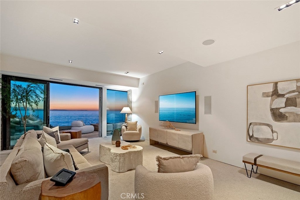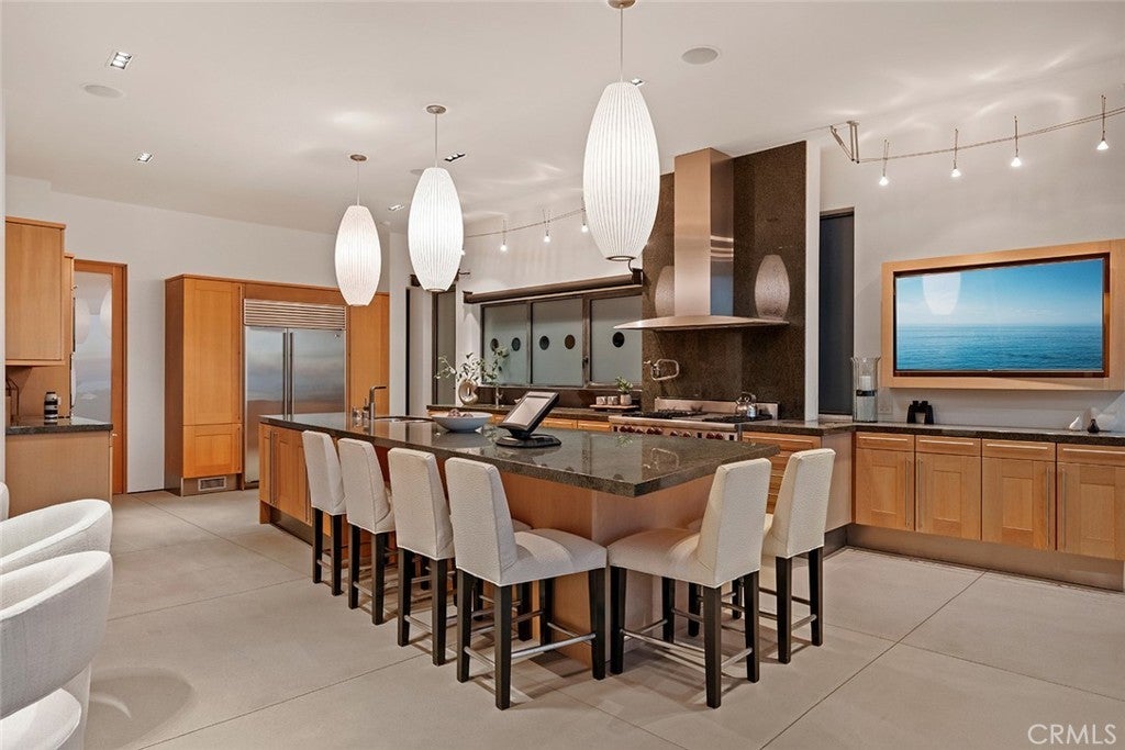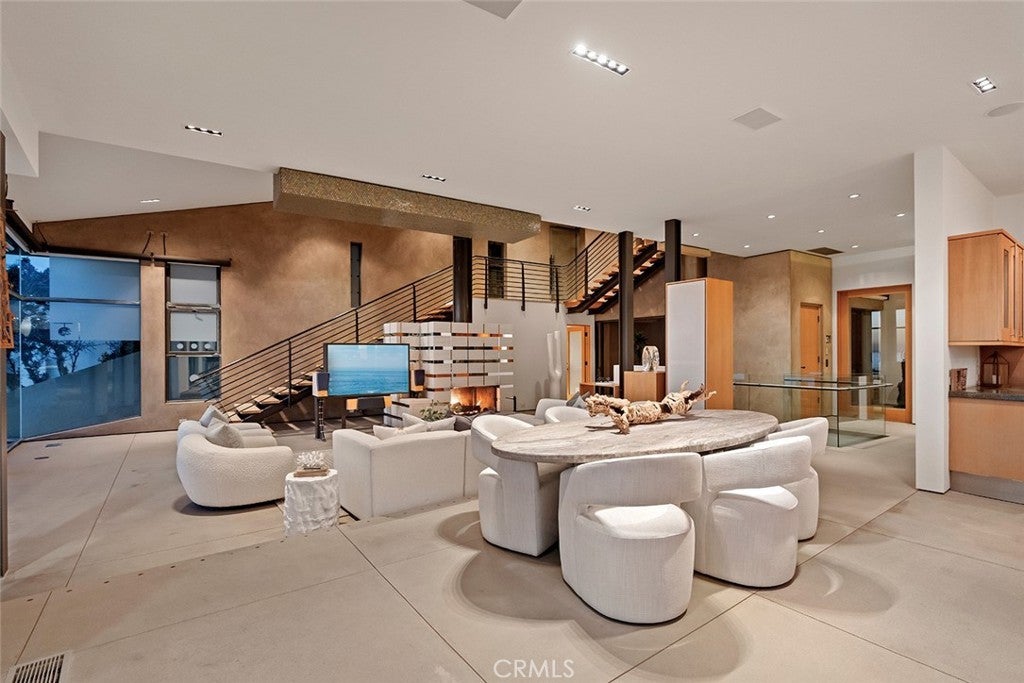 Cima Della Roccia is masterfully designed by iconic architect, Mark Singer. This striking oceanfront residence is perfectly positioned, showcasing sweeping Pacific Ocean, Catalina Island, and sunset views. Located in coveted Victoria Beach, this contemporary coastal estate captures the essence of Southern California living in one of the region’s most sought-after enclaves. Thoughtfully oriented to embrace uninterrupted white water coastlines, the approximately 5,300-square-foot home offers five bedrooms and multiple outdoor living spaces and decks, all tucked within a peaceful neighborhood. Beyond a private entry, a sculptural floating staircase leads to a dramatic double-height great room wrapped in walls of glass looking out to the sea. A statement fireplace anchors the space, with generous sitting and dining areas, a wet bar and a beautifully appointed chef’s kitchen with premium finishes. Special features include an oversized island which creates an effortless environment for entertaining. Sunlight fills the interiors, which open seamlessly to both a courtyard patio and an expansive ocean-view terrace. A versatile bedroom, currently styled as an office, completes this main level. The upper floor primary suite is devoted entirely to the breathtaking coastal and sunset views featuring a spa-inspired bath, private deck and dual closets. Enjoy exceptional privacy and romantic evenings! On the lower level, a secondary great room with bar flows to a spacious oceanfront patio with fire pit, ideal for relaxed gatherings. Two of the three guest bedrooms on this floor also enjoy full panoramic ocean views. Crafted with refined modern materials including steel, poured concrete, and natural stone, the residence is further enhanced by an elevator, smart home technology, and a two-car garage. This spectacular, yet convenient Laguna Beach location offers world-class resorts, boutiques, golf, restaurants, and pristine beaches just moments away.