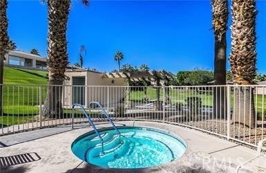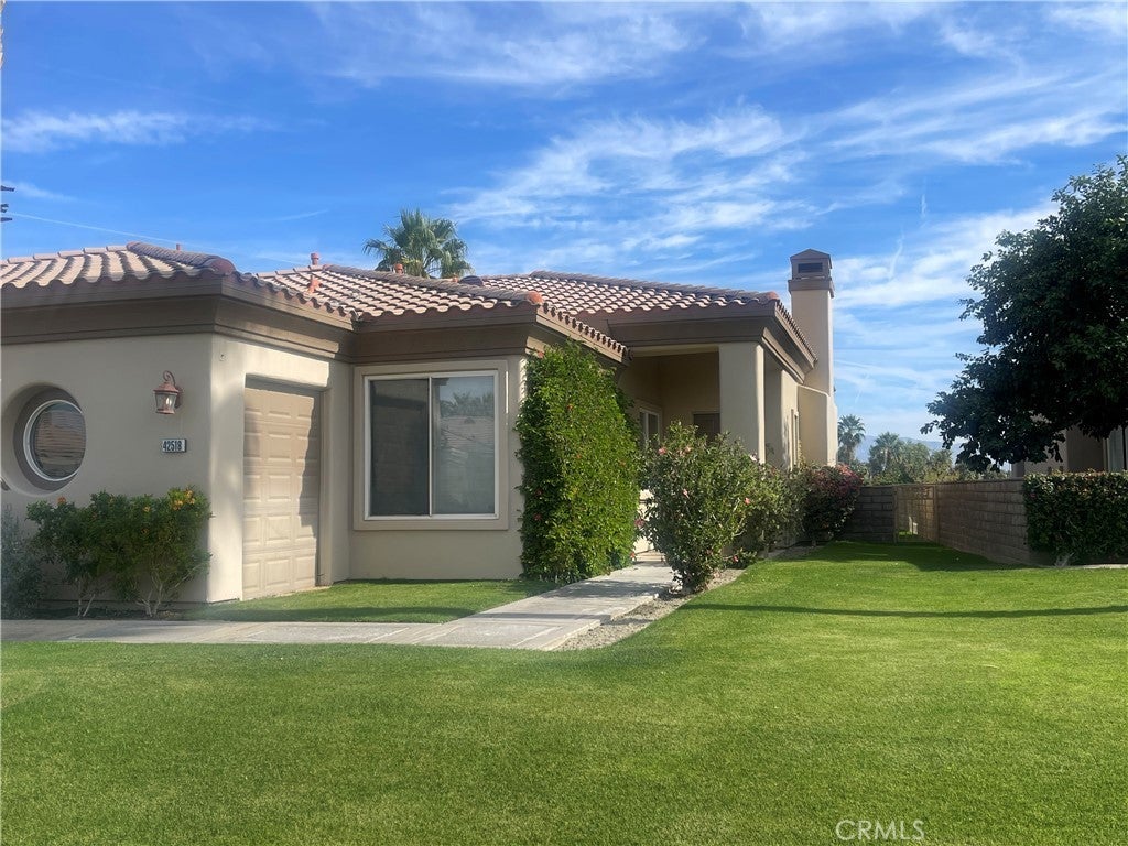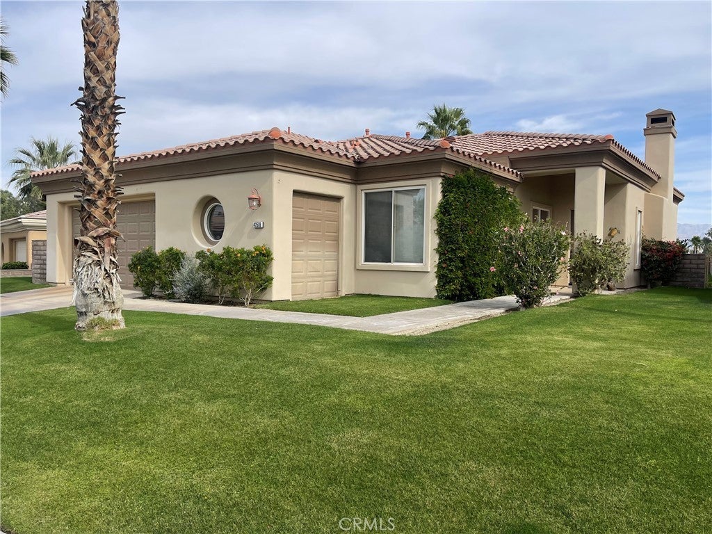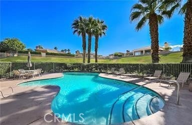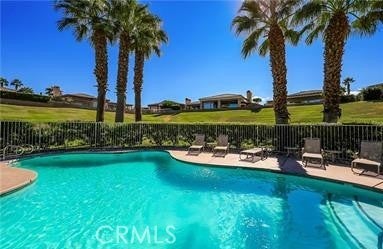 Welcome to Bellissimo, a quiet, gated community of 52 homes within guard gated Bermuda Dunes Country Club. This 3 bedroom, 3 bath home overlooks the common area, heated pool and spa and adjacent outdoor shower. Open concept living area with sliders opening to a relaxing patio with mountain views. Living area with fireplace, kitchen with granite countertops, many cabinets, high-rise kitchen island also with granite countertop with barstool chairs, gas cooktop and separate dining area. Primary bedroom (w/ensuite) with sliders opening to gorgeous mountains views. Separate laundry closet with washer/dryer. Two car garage with adjacent golf cart garage. HOAs include security, cable TV, internet, landscape maintenance of both front and rear of the home and the open area and pool/spa. This lovely home is steps away from Bermuda Dunes Country Club (memberships available). Bermuda Dunes Country Club's considered one of the most distinguished & prestigious golf clubs in Coachella Valley. Fabulous restaurants/shopping nearby. A MUST SEE!