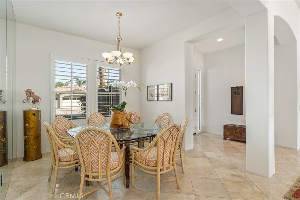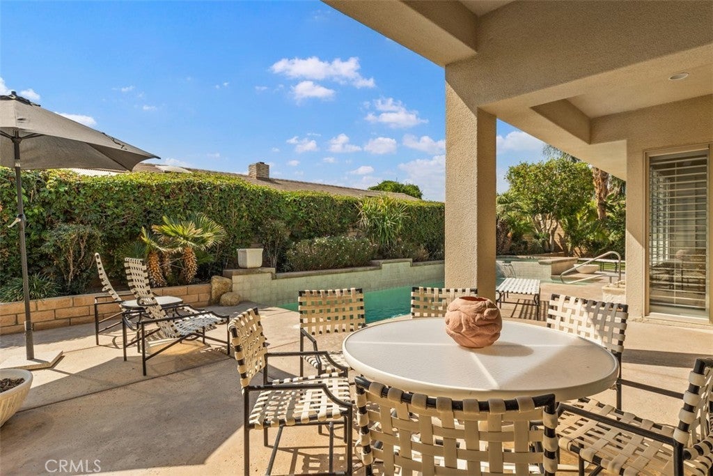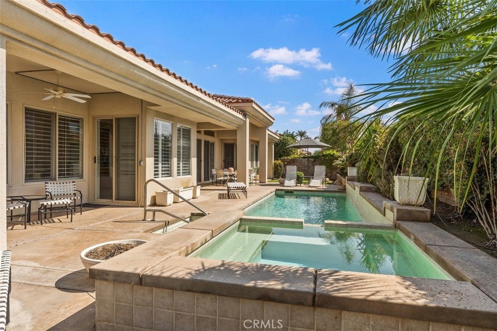 This single-story home in the exclusive Sundance Community offers the perfect desert lifestyle. With 3 bedrooms one of which has been converted to his/hers office and 3.5 baths, this residence provides an ideal floor plan. The primary suite is privately situated on one side of the home and the two additional en-suite rooms are located on the other, one of which can easily be converted back to a bedroom. Entertain with ease in the formal dining and living areas, or opt for casual gatherings in the family room, which seamlessly connects to the kitchen and breakfast nook. The south-facing backyard is an entertainer's dream, featuring a heated pool and hot tub, perfect for relaxing while enjoying peaceful views of the Eisenhower Peak and Santa Rosa Mountains. The outdoor space is enhanced by fruit trees and newly planted landscaping. Adding to the convenience is a spacious 3-car garage, complete with built-in storage and durable epoxy flooring. Conveniently located in a small, gated community, Sundance offers easy access to the IW Club, tennis tournaments, hotels, and a variety of restaurants.