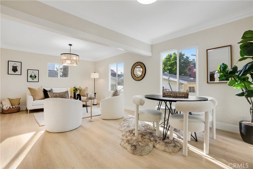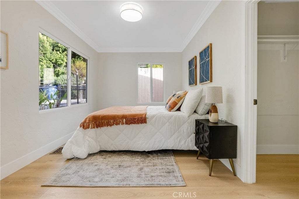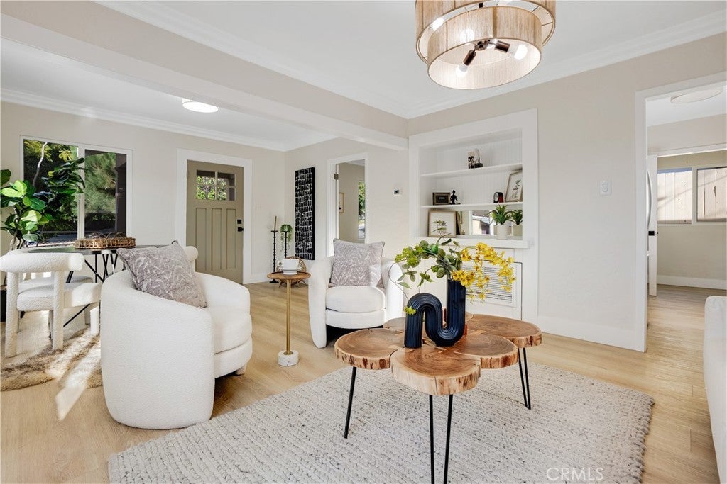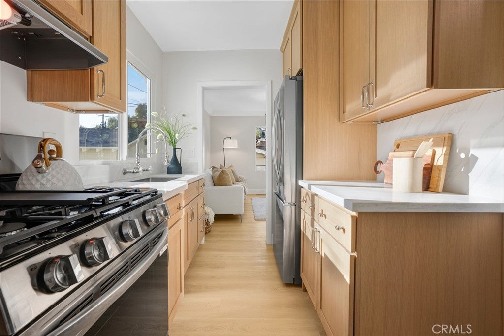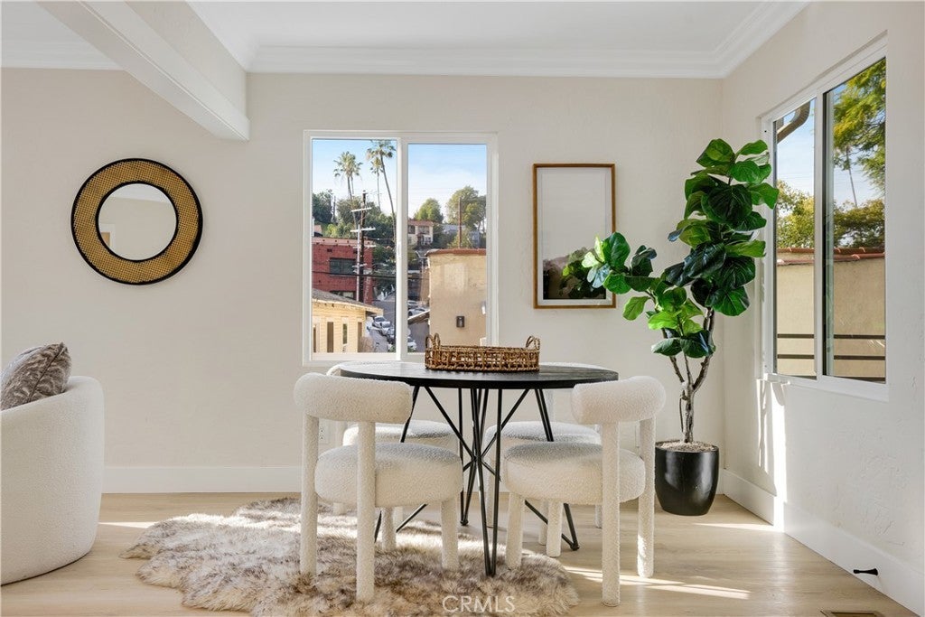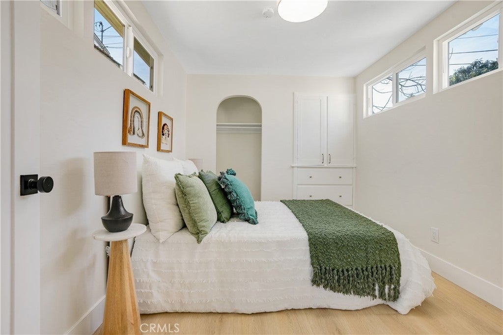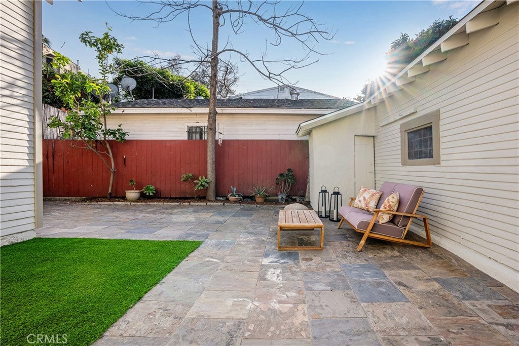 Tucked into the hills of Elysian Heights, this beautifully restored bungalow blends classic California character with refined modern design. Extensively updated while honoring the integrity of the original home, it offers a rare opportunity to own a century-old residence in true turnkey condition. Natural light moves easily through the open living and dining spaces, creating warmth and flow throughout. The interiors have been thoughtfully reimagined with cohesive finishes and a balanced mix of vintage charm and contemporary detail. The fully renovated kitchen features custom oak-tone cabinetry, mitered-edge stone countertops, and new stainless steel appliances. The bathroom has been redesigned with floor-to-ceiling blue vertical stack bond tile and black hexagonal flooring, delivering a clean, timeless aesthetic. Modern comforts include central air conditioning, energy-efficient windows, indoor washer and dryer hookups, and a brand new roof, providing the ease of updated living within a character-rich home. Set behind a private gated drive, the property offers rare three-car parking and a detached garage with a new roof and door, ideal for flexible use as a studio, gym, or additional storage. The backyard extends the living space outdoors, offering privacy within one of Echo Park’s most desirable hillside enclaves. Just moments from sought-after Eastside destinations including Echo Park Lake, Dodger Stadium, Canyon Coffee, and Downtown Los Angeles, offering both convenience and retreat in one of the Eastside’s most dynamic neighborhoods. Public records reflect a 1-bedroom home. Property functions as a 2-bedroom with the second bedroom featuring direct exterior access to the private backyard. Approximately 759 square feet per professional floor plan. Buyer to verify all information, including square footage.