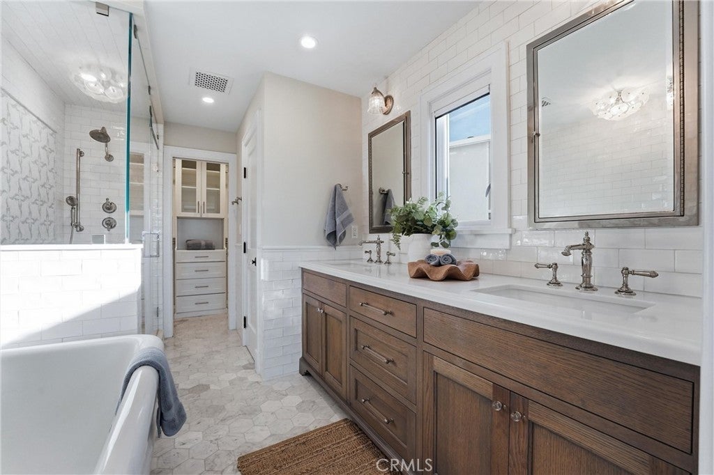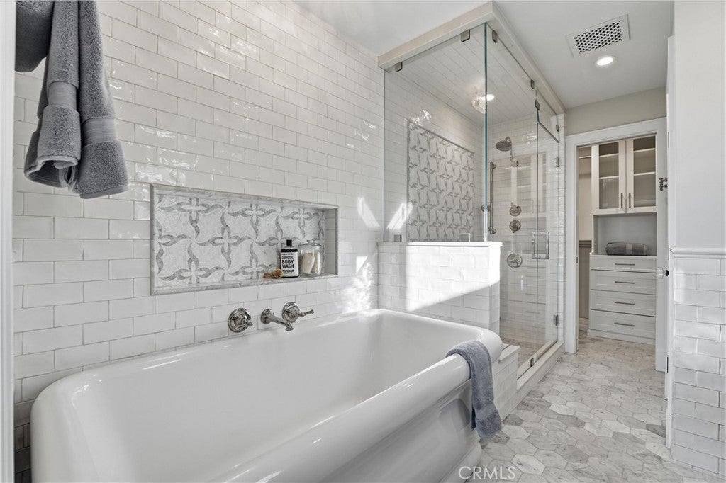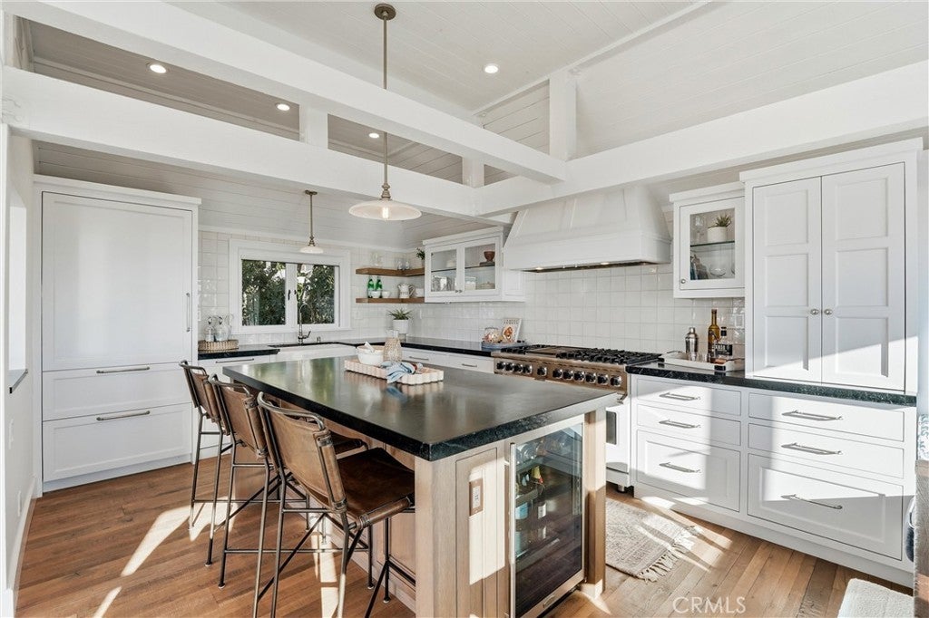 Just several blocks from world class beaches, this exceptional ocean-view coastal cottage blends timeless elegance with relaxed Laguna Beach living. Remodeled by award-winning designer Andra Miller, the home pairs classic East Coast charm with elevated California style and beautiful views of the Pacific coastline, creating a residence that feels both refined and relaxing. Approximately 2,200 square feet, the 3 bedroom, 3 1/2 bath residence features a thoughtful split-level layout that maximizes light and privacy, living far beyond its footprint with warmth, character, and intention at every turn. The entry level includes the primary suite, secondary bedroom with custom bookshelves and private bath, and a laundry room. The lower level offers a private guest suite with a private bath, Douglas fir–lined walk-in closet, and direct garage access. A spacious 2-car garage with storage cabinets, Level 2 electric car charger, provides added convenience and functionality. The primary bath is a spa-inspired bath with freestanding soaking tub, heated marble flooring, dual vanities, walk in closet and a steam shower. Beautiful ocean views from the primary Bedroom. The top floor includes a designer kitchen open to the living and dining areas and features a soapstone island, custom cabinetry with glass uppers, farmhouse sink, custom banquette, built in beverage refrigerator and premium appliances including a six-burner Viking range with griddle and a Sub-Zero refrigerator with dual temperature drawers. There is also direct access to your private deck providing indoor outdoor living. Ocean, Catalina Island and north coast views command this part of the house, making it an unforgettable setting for both quiet mornings and sunset gatherings. Refined details throughout include French oak floors, shiplap panelling, custom built-ins, crown molding, marble-appointed baths, designer tile, custom storage and cabinetry and curated lighting, all thoughtfully selected to elevate the home’s coastal aesthetic. Moments from beaches, fine dining, galleries, public art exhibits, and village shops. This is not just a home, but it is a rare opportunity to experience the very best of Laguna Beach living.