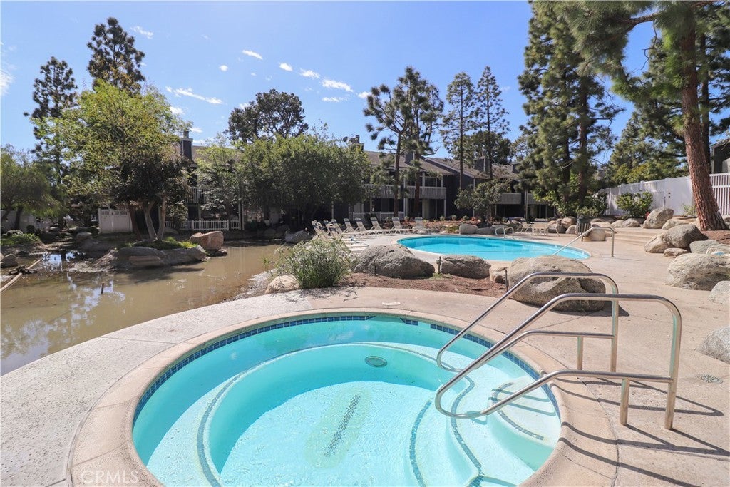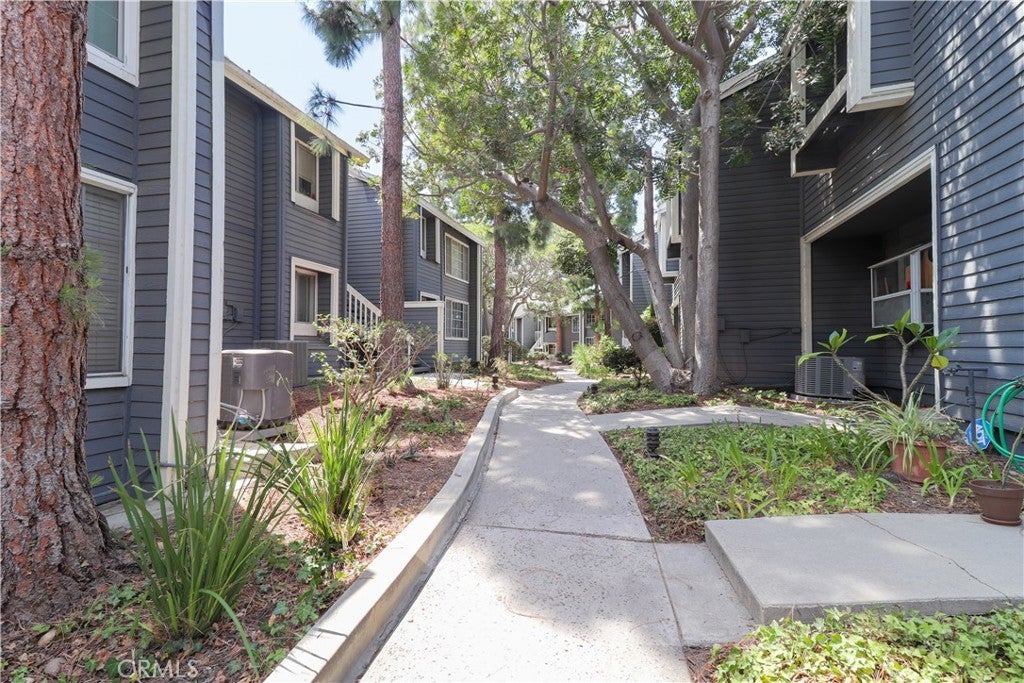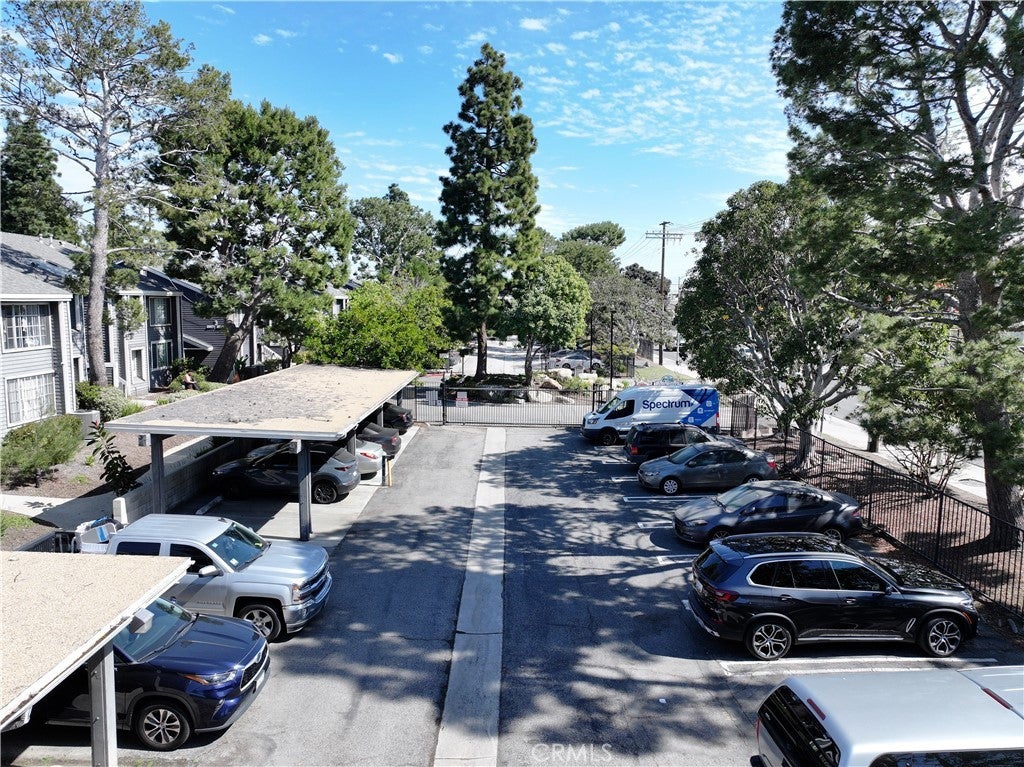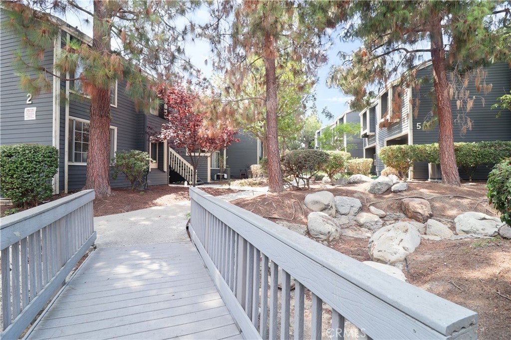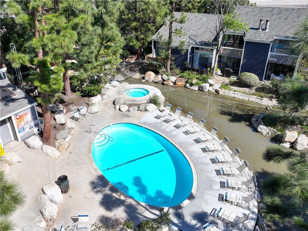 Charming 2-bedroom, 1-bath condo on the 2nd floor. Soaring cathedral ceilings create a bright and spacious feel throughout. The inviting living room and primary bedroom both open to a private balcony overlooking serene tree-lined grounds and swimming pool area. The kitchen features refurbished cabinets, new quartz countertops, a cozy breakfast counter, and plenty of storage. Appliances include refrigerator, stove, new dish washer and in-unit laundry set. The second bedroom has plenty of natural light and conveniently adjacent to bathroom and living areas. Located in a highly desirable community, residents enjoy exceptional HOA amenities—2 sparkling pools, relaxing spa, water-filled creeks and lush landscaping. Includes one covered parking space (#449) plus one uncovered space (#437). With its move-in-ready condition, fantastic location, and easy freeway access, this condo is a true value opportunity not to be missed!