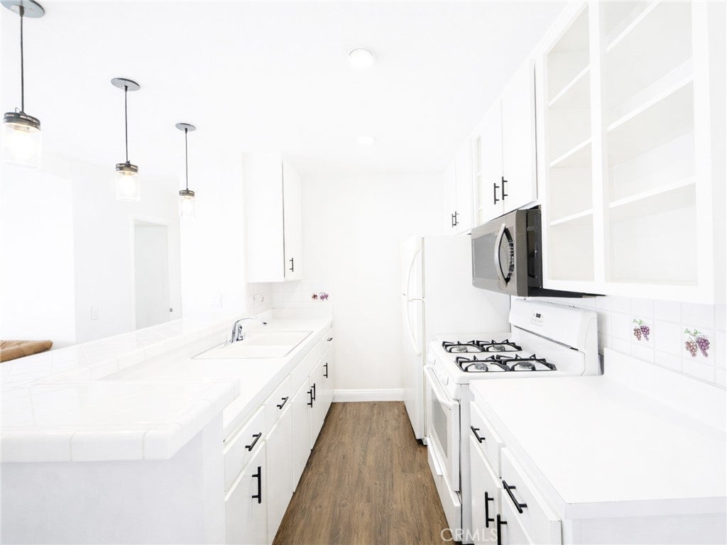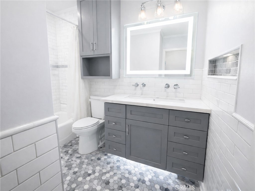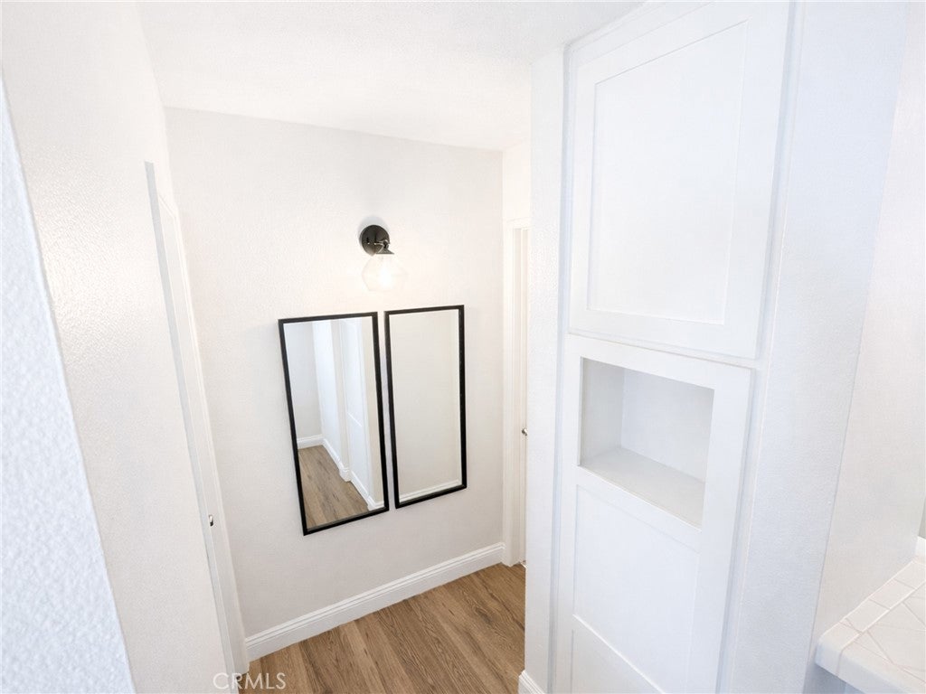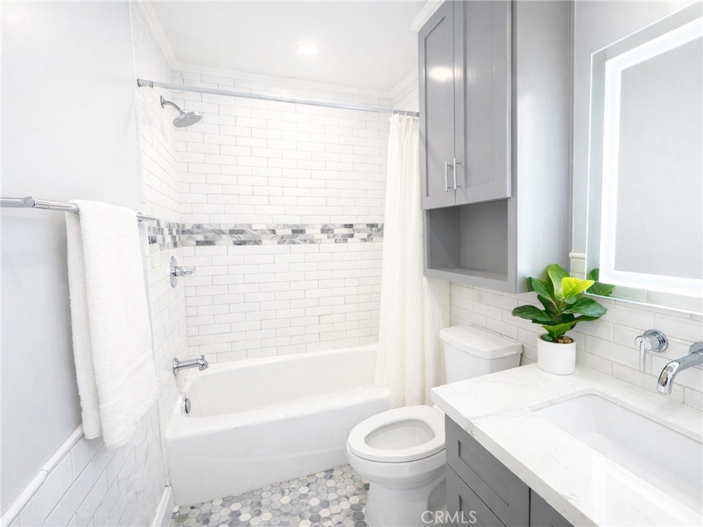 Welcome to this charming upstairs 1 bedroom, 1 bath condo in the desirable gated community of Los Olivos in La Mirada. This condo features an open living room to kitchen floor plan that creates a bright and spacious feel. The bathroom has been completely remodeled with new tile, modern cabinetry, contemporary trough-style sink, updated fixtures, and stunning LED lights and mirror that add elegance and functionality. The large bedroom offers a high vaulted ceiling and a spacious walk-in closet, providing plenty of storage. Central air conditioning and heating keep the home comfortable year-round. The Living room has large glass sliding doors that open to your private balcony. HOA dues are an affordable $330 per month, covering water, trash, exterior maintenance, and beautifully maintained grounds. This unit is conveniently located near the community's amenities, including the pool, spa, tennis/pickleball courts, clubhouse, and community laundry room. Don't miss out on this wonderful opportunity to enjoy comfortable condo living with great amenities! Complex is FHA Approved.