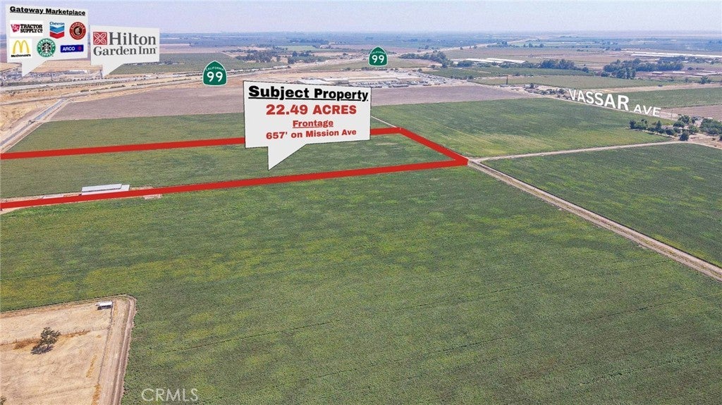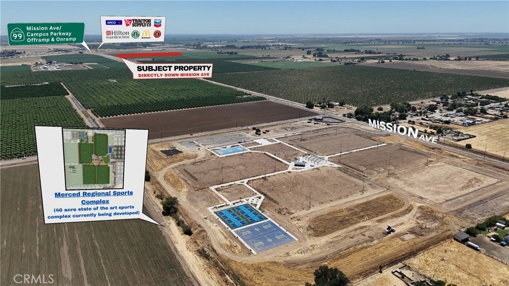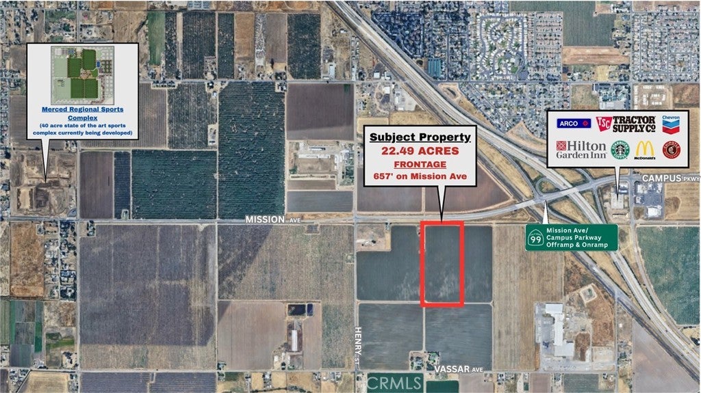 Location, Location! This 22.5+/-acre parcel is part of a 161+/- acre family ranch in the path of development and the City of Merced's Sphere Of Influence, which could be purchased together or separately. It is strategically located w/in close proximity to Hwy 99 and the newly developed Campus Expressway overpass, a direct route to UC Merced. The property is also located within the "Merced Vision 2030" SUDP Boundary, making it well positioned for future growth demand. Future possibilities could include commercial, industrial or residential development for this underserved market area. Also, in close proximity is the Gateway Marketplace, the newest regional commercial development project currently underway. The Gateway Marketplace includes major retailers such as Tractor Supply, Starbucks, McDonald’s, Arco, Chevron and a Hilton Hotel/Convention Center. The city of Merced just broke ground on a 40-acre sports complex just down Mission Ave, dubbed Community Park 42, a major REGIONAL sports complex, allowing for large scale tournaments, concerts, and events. Land running along Mission Ave is quickly becoming the object of attention as residential communities and city infrastructure is being brought further south to accommodate the city's massive growth and grossly underserved commercial/industrial/residential needs. This parcel is also adjacent to Yosemite Wholesale, a 220,000SF