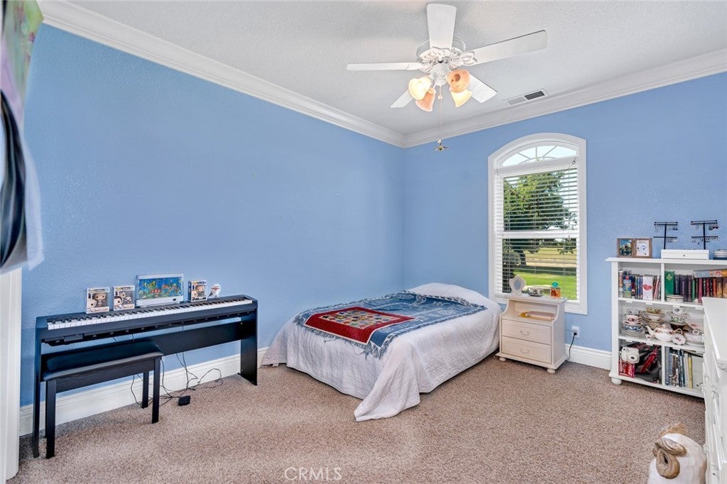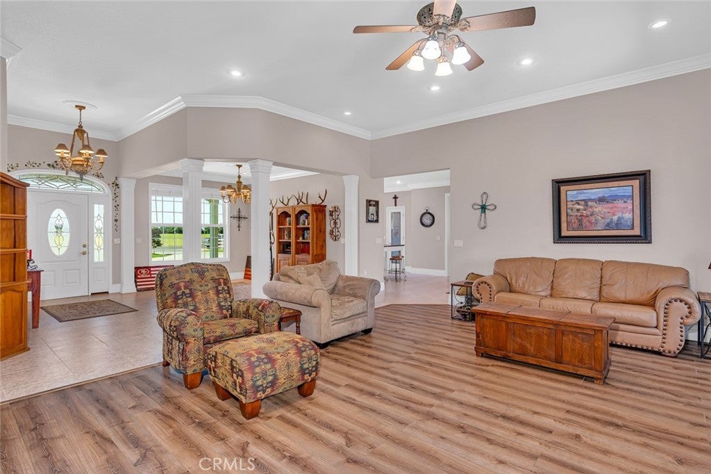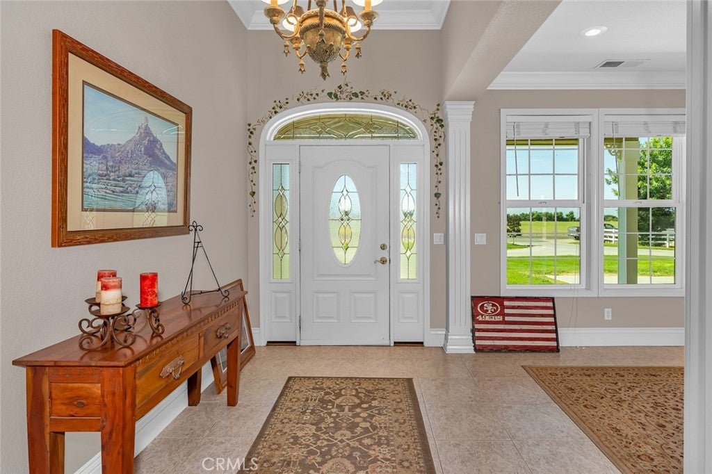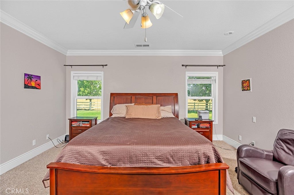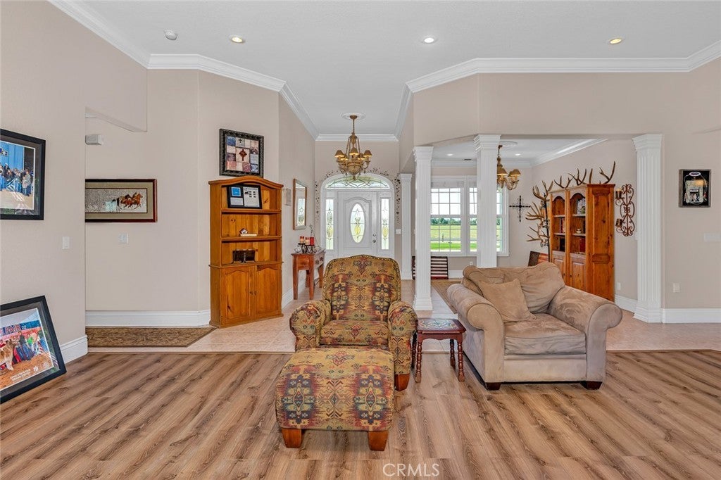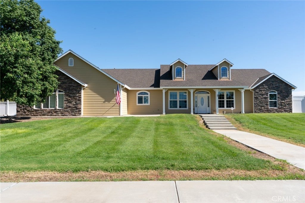 "PRICE IMPROVENT ON THIS OASIS"! minutes from town offers a Beautiful Custom Home On 4.7 ACRES- 4 Large Bedrooms, 3 Baths. plus 2x 6 exterior walls for added insulation- Formal Dining Room-large eat in Kitchen with island - Great Room with fireplace -Wonderful split floor plan with a large Master Bed and bath with great walk-in shower- large soaking tub overlooking cozy fireplace - large walk in closet- double sinks-wonderful laundry room with additional storage and access to outside- Lots Of Custom Woodwork thru-out house. Wonderful Eat-in Kitchen with Granite Counters, Island, Double Ovens, large circle driveway- AND the added option of being in the MID district for irrigation. - Additional pens and stalls for cows and horses -Minutes away from the new Plaza on Mission- minutes from Highway 99 AND so much