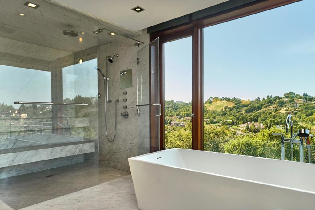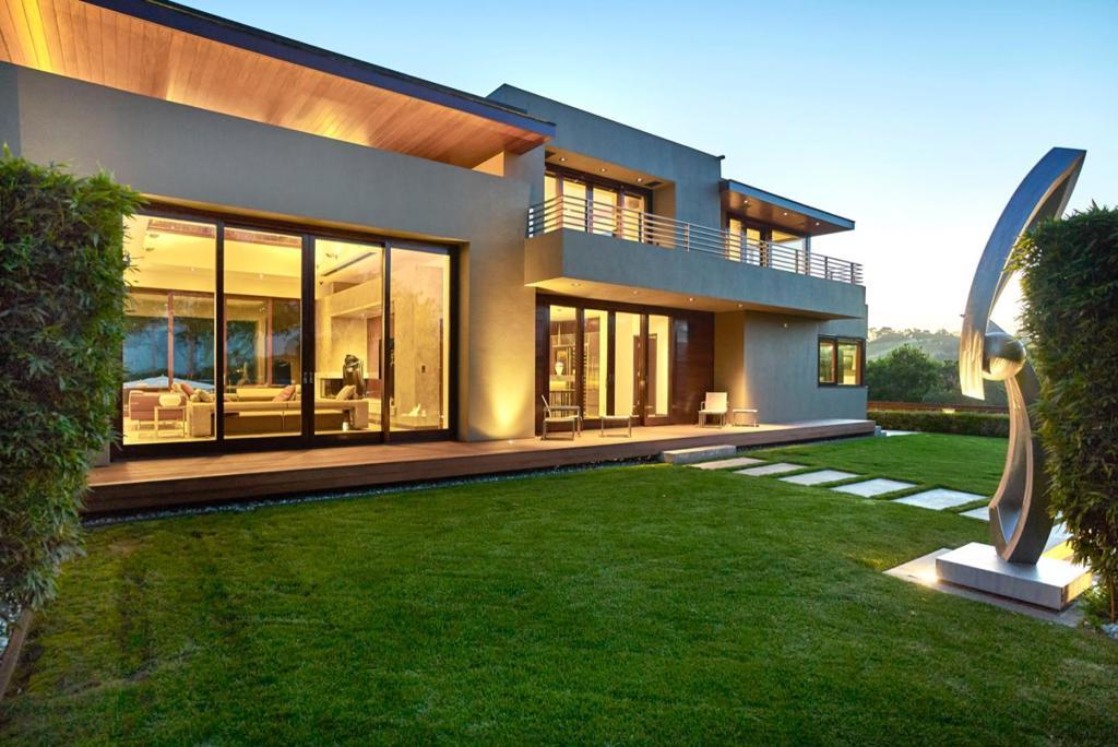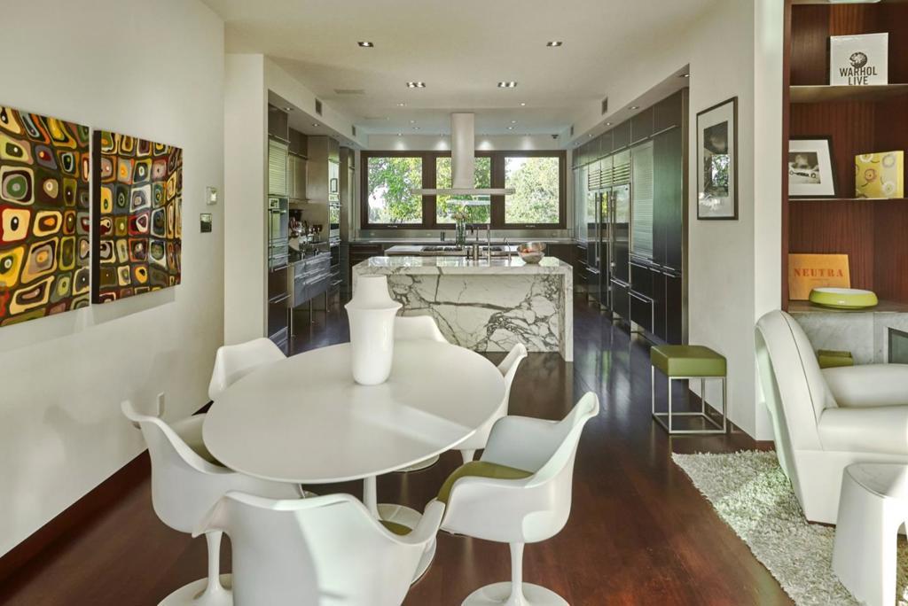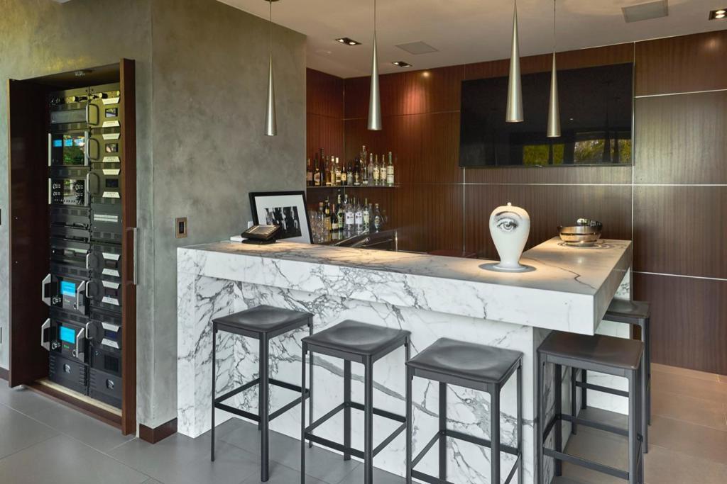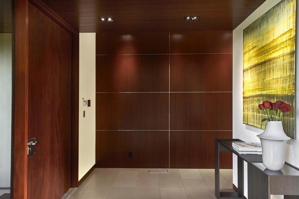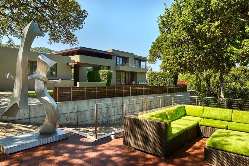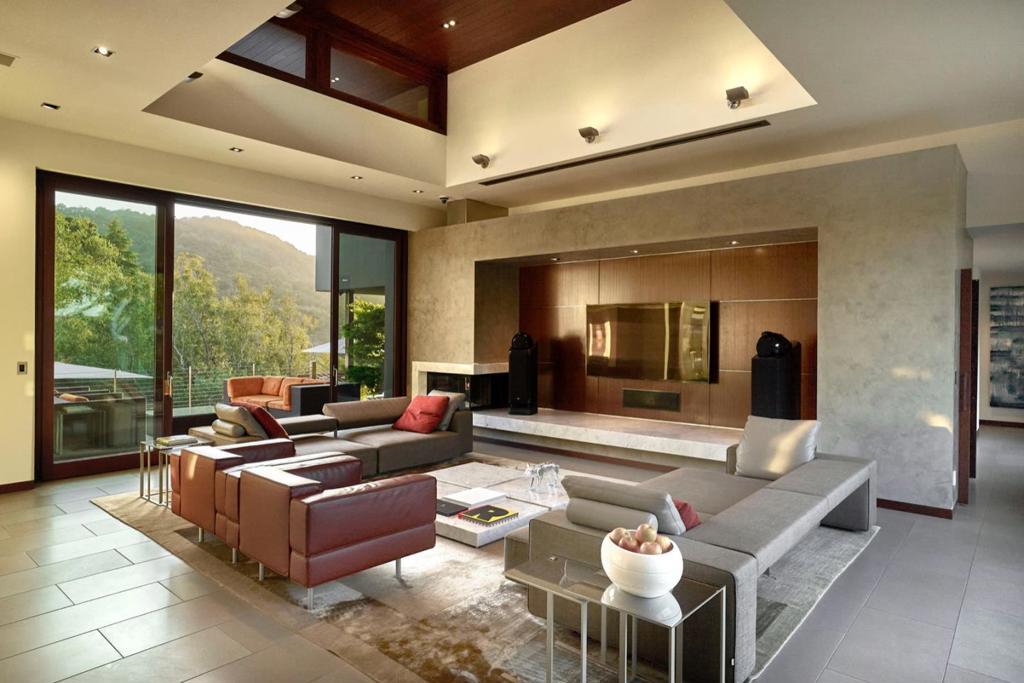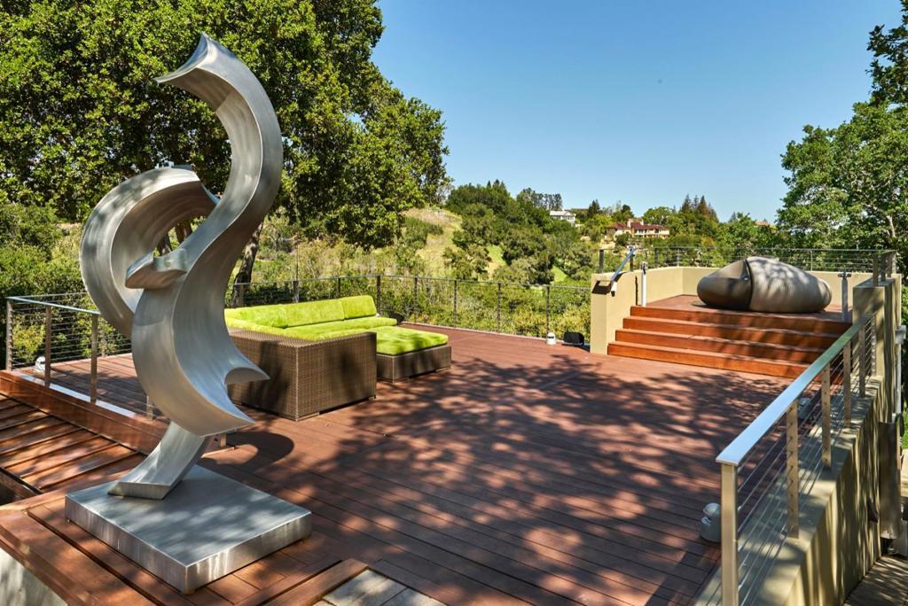 One look at the rendering Swatt-Miers showed me and I said, "that's the house I want!" said owner for the three-story dwelling with its sculptural massing of rectilinear forms and astonishing architecture. Starchitect '' Robert Swatt in turn, translated that vision to reality. Add to this a formidable roster of talented interior designers, a battalion of artisans, contractors, engineers, consultants, and in consultation with Lutron Home Automation, created a smart home befitting this iconic Silicon Valley residence. Considering its mass, the house makes a relatively discrete impression from the quiet street, with much of the structure's bulk atop a knoll and concealed from view via a mahogany wood clad gate. Once encountered straight on, however, the scheme is a tour de force of architectural acrobatics, its breathtaking steel cantilevered overhangs and column-free spans invoking a palpable sense of weightlessness. Inside, details were worshiped and "value engineering " not an option.