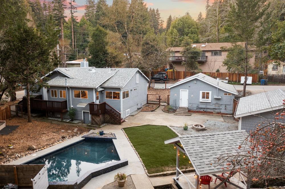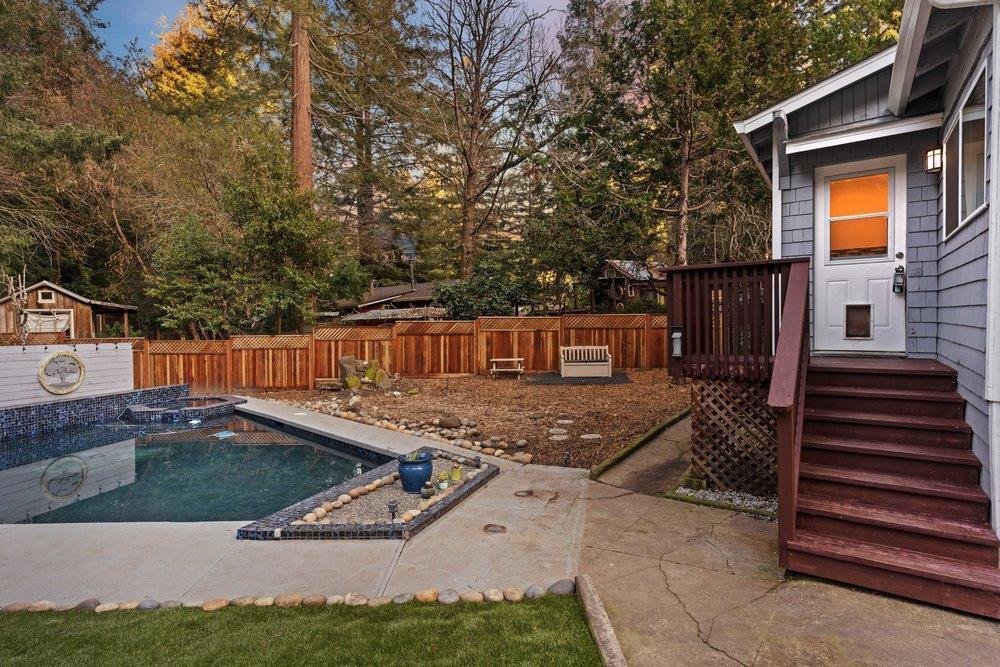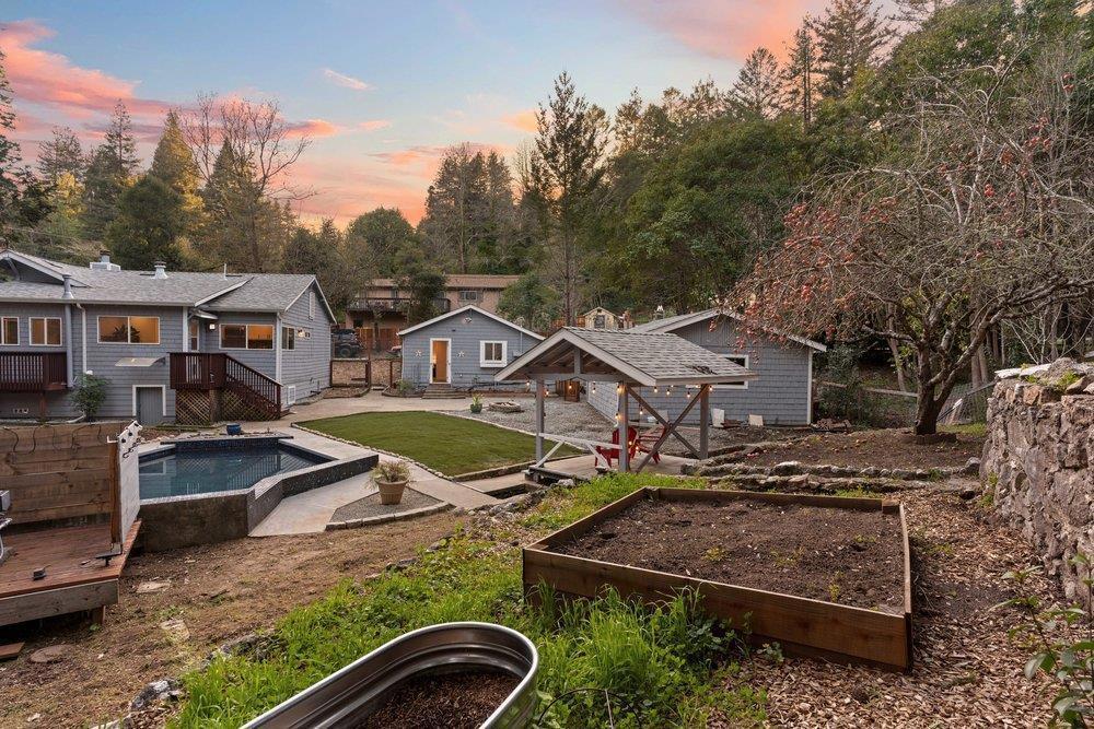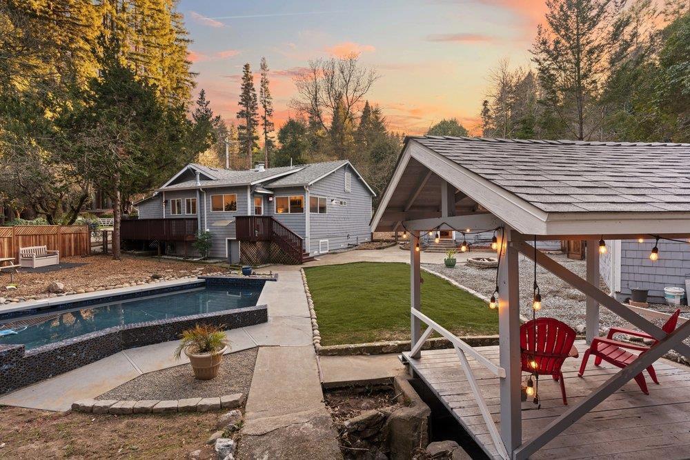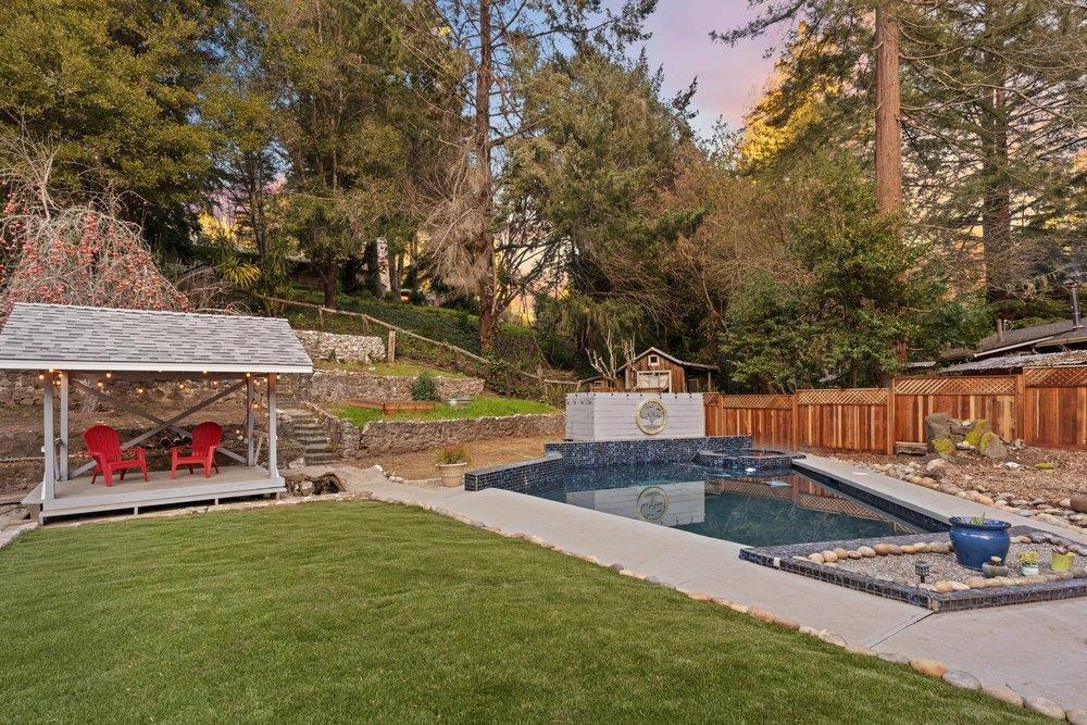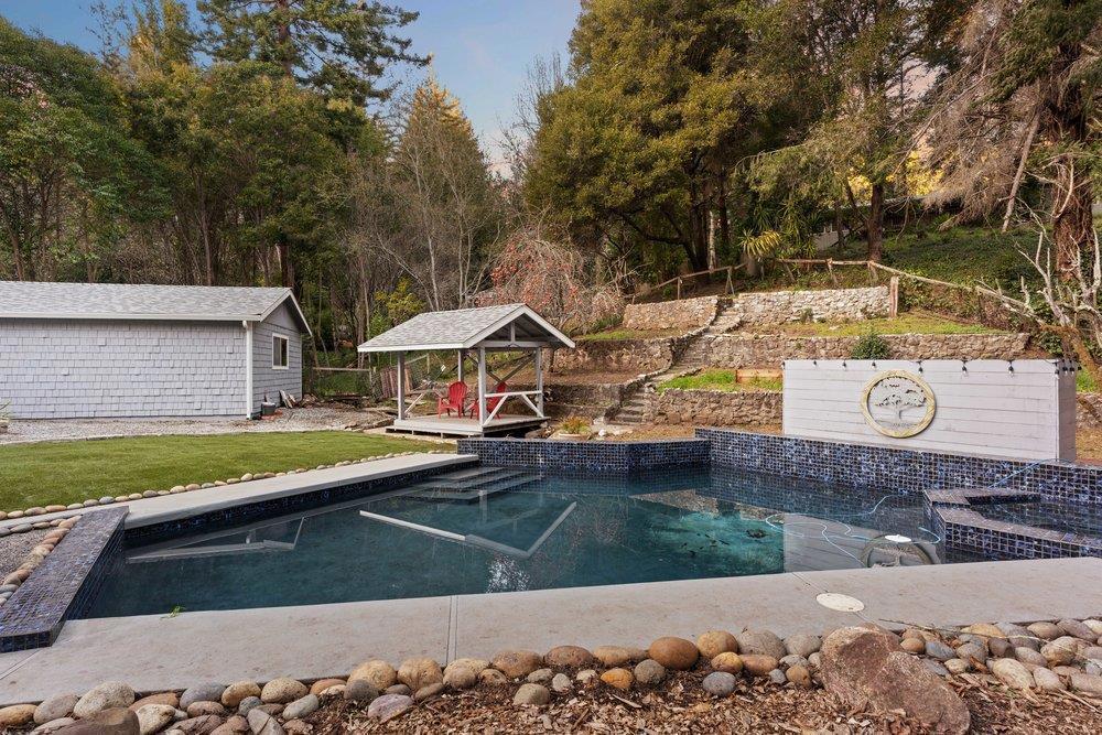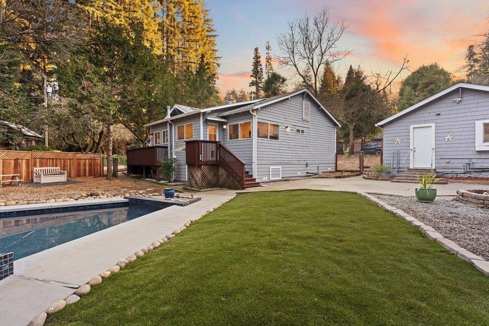 Surrounded by redwood groves in a friendly and quiet neighborhood, this single-level home is a sunny oasis near downtown Felton. Indoors, the thoughtfully designed living rooms fireplace is centered for a cozy yet spacious atmosphere. Host guests for dinner easily with the fully stocked modern kitchen with quartz countertops and a tile backsplash that opens into the sunny dining area. The primary bedroom has a jack-and-jill bathroom and a closet for easy living, while the two others can host guests or be transformed into an office! The spacious ADU has it all: a kitchen, bathroom, bedroom, storage, and a cozy stove! Sun shines down on the fully-fenced yard with two one-hundred-year-old apple trees, a luxurious pool and hot tub(with recently updated equipment), green grass, a pergola, and terraced land perfect for gardening. Spacious detached 2-car garage. Easy access to Feltons bustling center, Henry Cowell Redwood State Park, and historic HWY 9 into Santa Cruz or Silicon Valley.