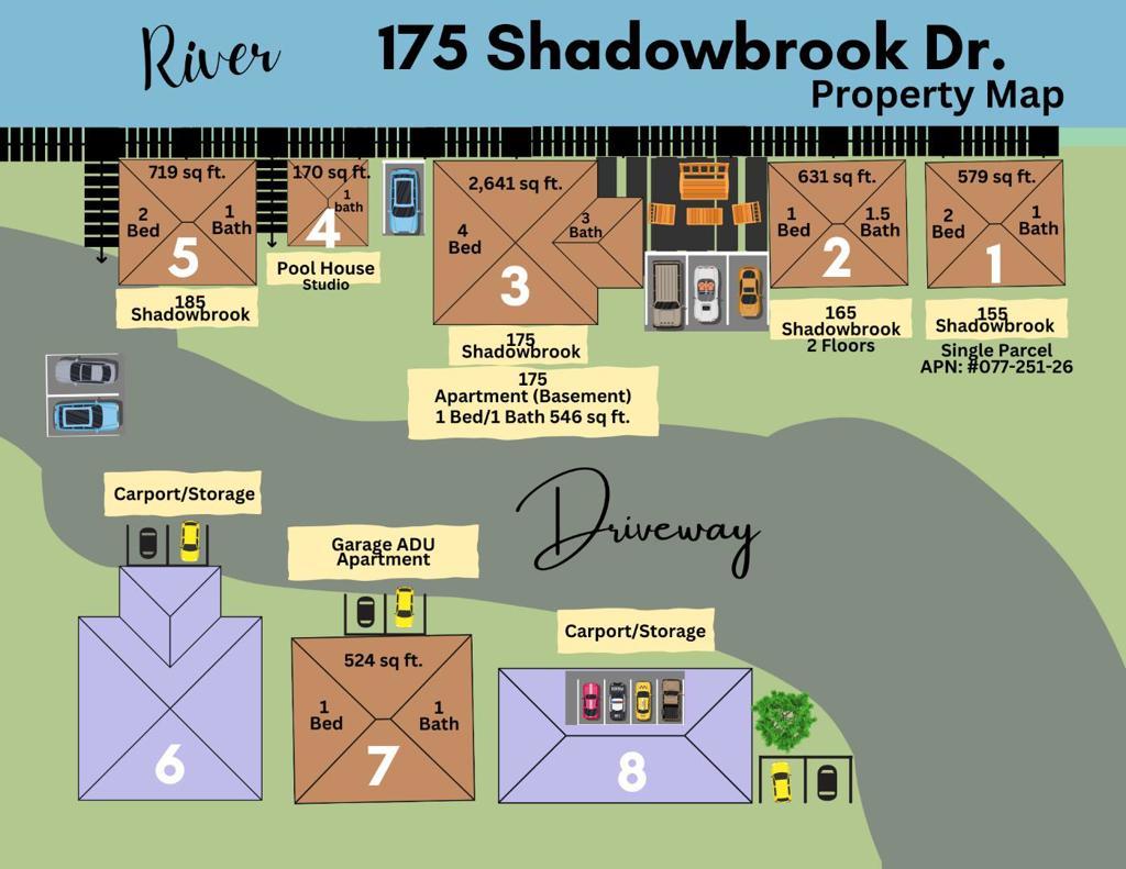 Presenting a unique and compelling investment opportunity, this tranquil neighborhood offers the best in riverside living. This property comprises 6 diverse residential units nestled amidst natural beauty. The 3-story primary residence provides river views and boasts numerous vintage elements. The space offers a sunroom, an updated kitchen with granite countertops and a vintage occidental stove, and a grand living room with a cozy fireplace. Four large bedrooms boast unique features. An array of 5 other dwellings, including a studio/pool house, an apartment with a garage, two 2-bedroom homes, each with a kitchen and living room, and an additional one-bedroom ADU below the main house, provide diverse living options. All units capitalize on the surroundings with large windows showcasing exquisite views. The property's prime location next to Highland Park offers ample outdoor recreational activities; easily hop on Hwy 9 into Felton, Santa Cruz, and Saratoga.