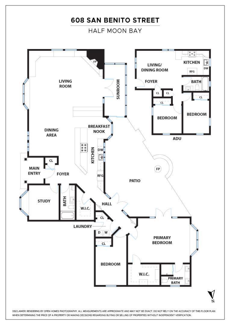 608/608A San Benito -STUNNING Custom Coastal Home built in 2014 w/Permitted Detached ADU/In-law built in 2022 on Double Lot (10,000 sqft). Situated on woodsy Cul-De-Sac two blocks from downtown Main St historic buildings, shops, restaurants and Coastal Trail. Main House: Spacious 2 bedroom; Office/3rd bedroom w/Murphy Bed; 2 full baths with custom cabinets; bright Sun Room - used as Office; Classy oversized Great Room w/Cathedral Ceilings, Fireplace, Sound System and plethora of Built-in Bookshelves; Large Kitchen w/Numerous Custom Cabinets, Leather Finished Granite Countertops, Breakfast Nook and Large Pantry; Anderson Windows and three French Doors w/Plantation Shutters; Tankless Water heater; Radiant Heating, Security and Fire Sprinkler Systems; Recessed Lighting throughout, Large 2 Car Garage w/Attic Storage and Cabinets; Paid SOLAR SYSTEM w/TESLA BATTERY; Beautifully Landscaped Yard w/ Lush Shrubs and Lemon Trees; and Large Patio w/built-in Gas Firepit. ADU Features: Separate Driveway and Fencing for Privacy, 2 bed, 1 bath; Exquisitely designed open concept w/Vaulted Ceilings; Full Size Kitchen w/Quartz Countertops; Washer & Dryer. All-electric Serviced by Solar system. Don't miss the opportunity to own this exceptional coastal property with ADU in a prime location.