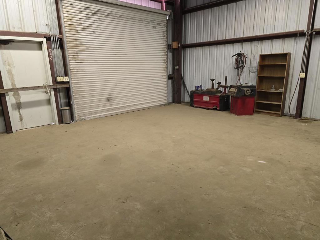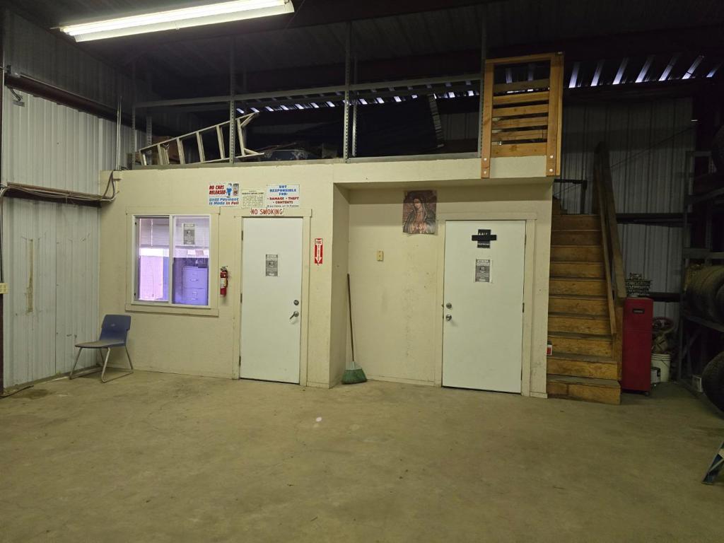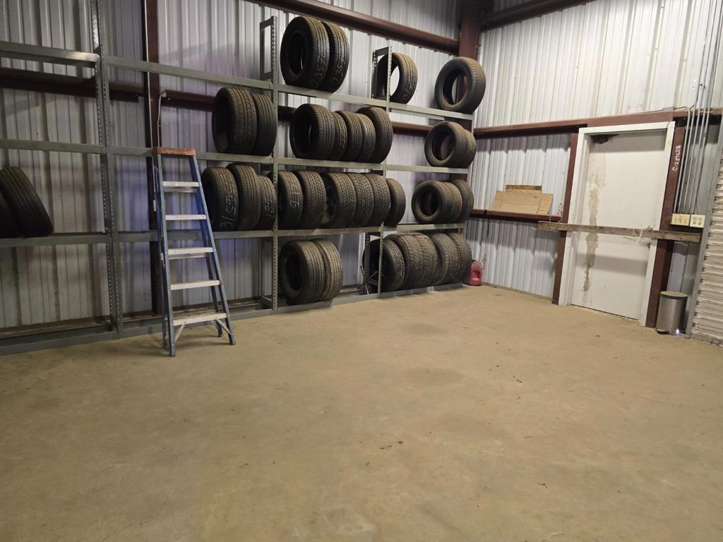 Commercial property with Metal Building, office, Bathroom, upstairs storage, tires, and machine, parking area.