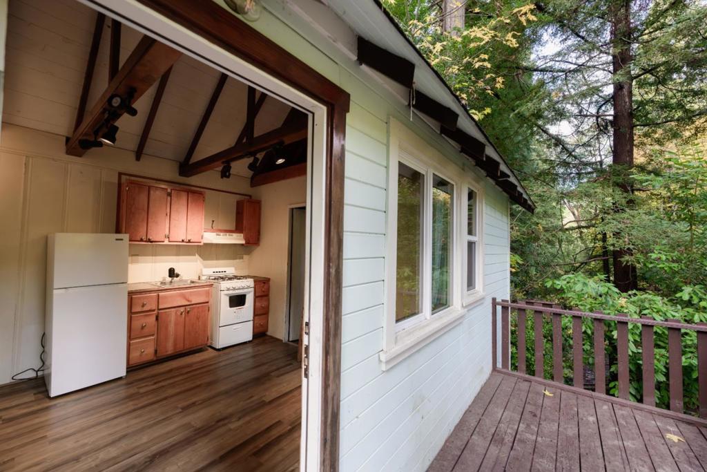 Escape to this enchanting cabin nestled amongst the redwoods. This cozy hideaway is perfect for those seeking tranquility, offering a serene connection with nature. The home boasts a flexible floorplan that has two separate living spaces, each with their own private access. The primary living area features an open concept living/dining/kitchen plus a sleeping loft and cute bedroom suite with 3/4 bath. Features include a bay window, open beam vaulted ceiling and newer luxury vinyl plank flooring. On the bottom level you'll find another cozy bedroom suite, also with 3/4 bath. Meander on down the vintage stone pathway through the redwoods to discover another hidden treasure: a sweet artist studio tucked into the forest at the back of the property. It's the perfect spot for yoga, hobby making or relaxing with a good book! The outdoor living is truly sublime. This beautiful, private lot has a sunny deck which provides a great BBQ spot and the terraced parcel offers level areas for gardening or outdoor play! Located just minutes off of Hwy 9 with easy access and only 4 miles to town and 30 minutes to Silicon Valley. Whether you're seeking a quiet weekend away or an extended stay, this cabin offers an ideal combination of rustic charm and modern comforts. Start making memories today!