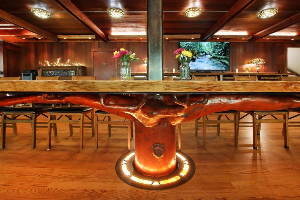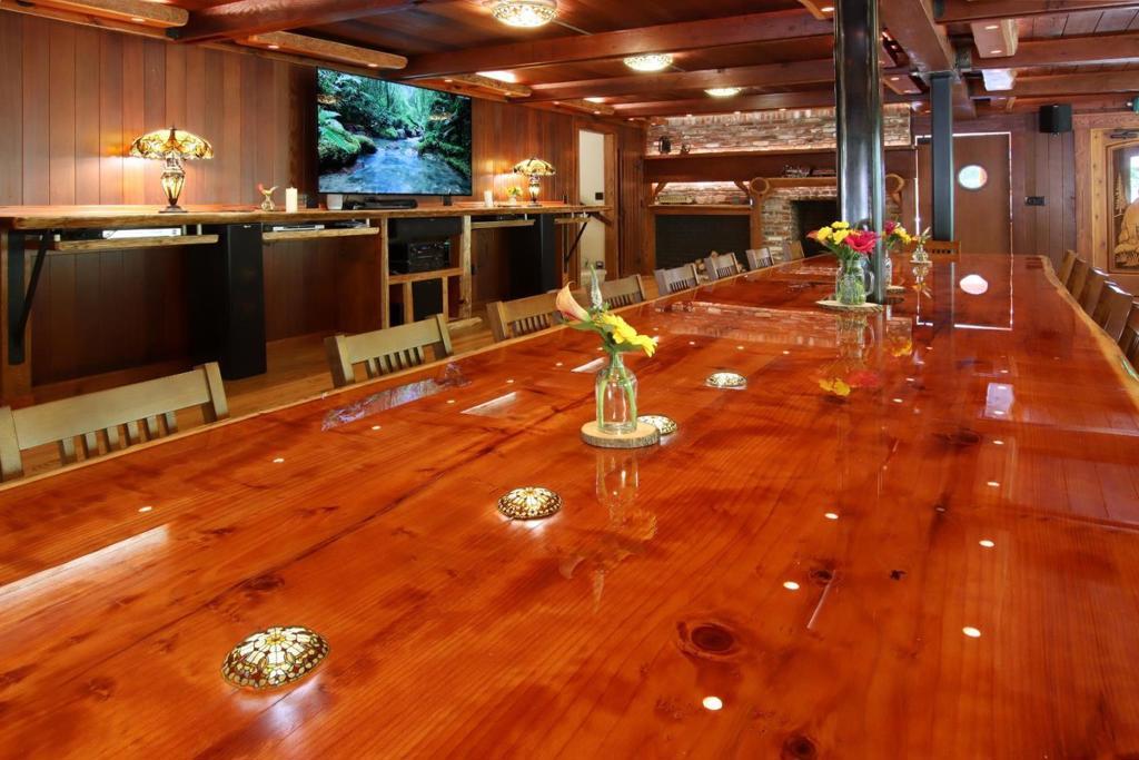 Take advantage of this opportunity to own this private 34-acre property with the ultra rare zoning of Private Campground. Perfect for a private retreat center or high-end family getaway. The Lodge is a spacious 4,413 sq ft main building featuring seven bedrooms, a large Grand room, a commercial kitchen, offices, & more. Additionally, there are eight cozy 192 sq ft half bath cabins equipped with electric fireplaces, kitchenettes, sofa beds, & loft beds for extra guests. Six dorm-style A-frames, totaling 768 sq ft, also provide additional accommodations. A highlight of the property is the Grand room, which showcases a stunning handcrafted redwood table. This artistic centerpiece seats 20 comfortably & can be lifted to the ceiling, offering a flexible space for various activities. Additional work spaces in the Grand room look out over the grounds. Nature lovers will appreciate the open-air amphitheater, a tranquil meadow, a network of winding trails, & majestic Redwoods. A flowing creek with a small dam and a private beach area add to the magic. The campground is equipped with high-speed internet, making it suitable for a family compound, a serene retreat center, or an off-site coding facility. Pricing now includes all four parcels.