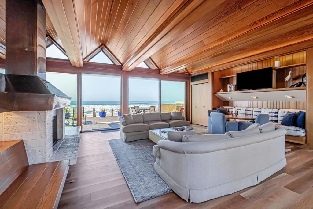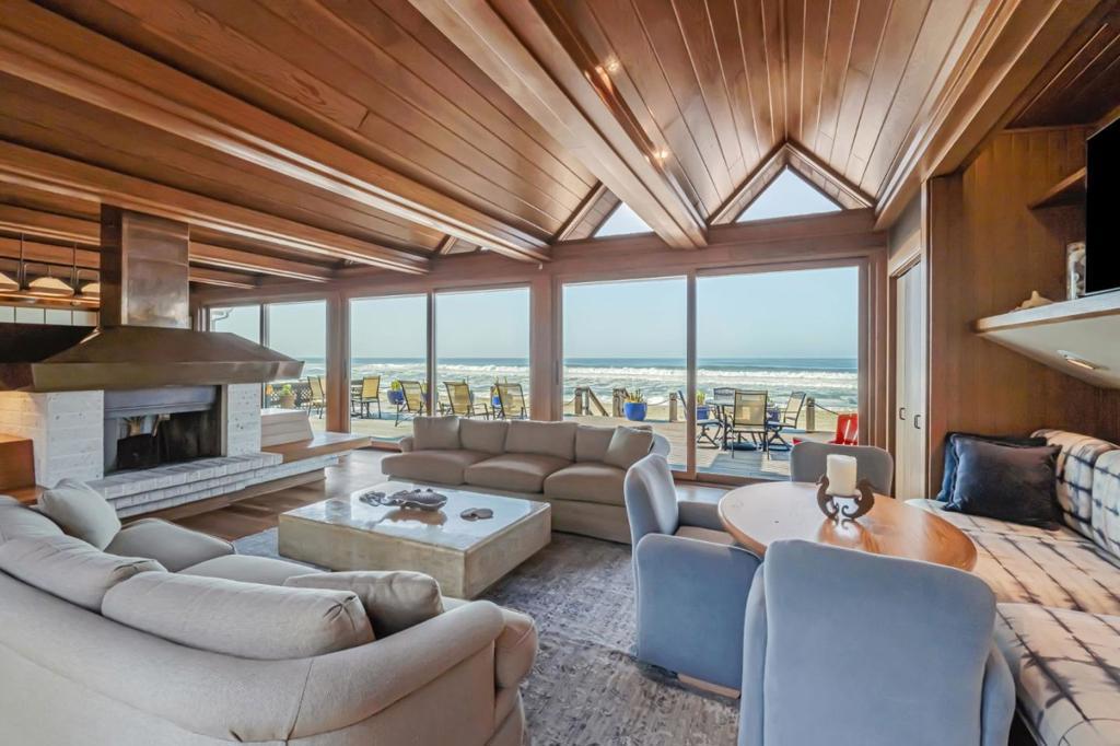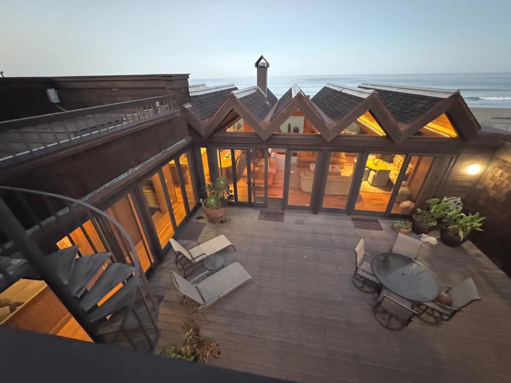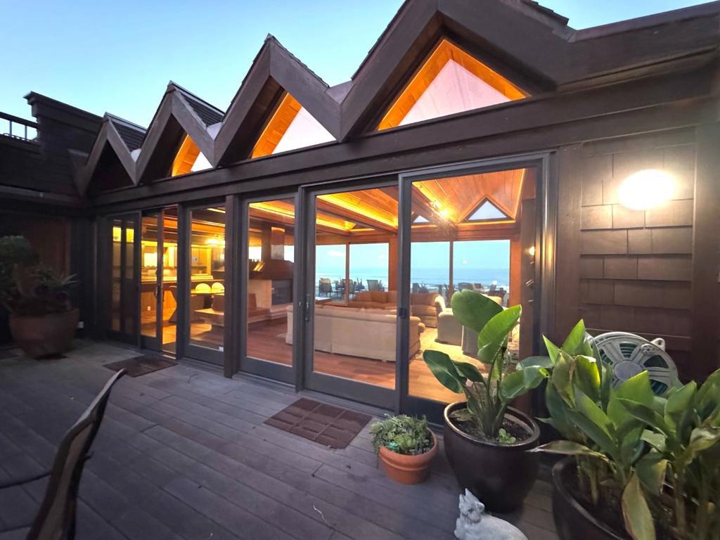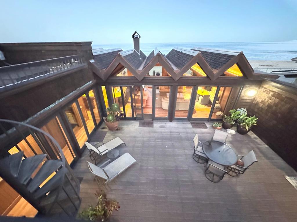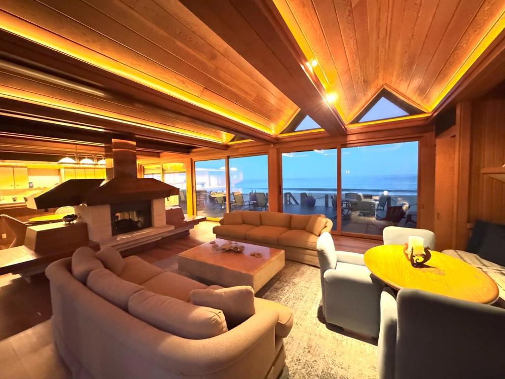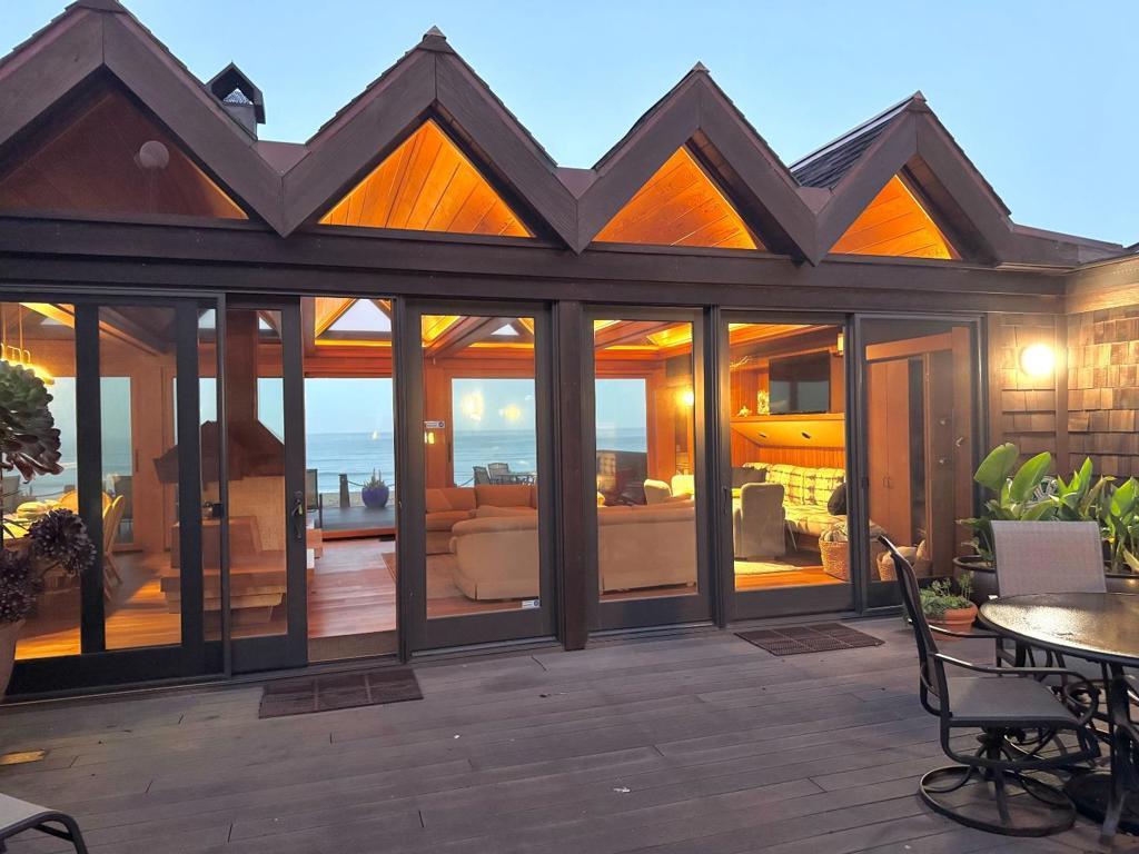 discover your dream coastal escape in this stunning 4+ bedroom 4 bath beach front home on coveted beach drive. This beautifully designed residence seamlessly blends warm, natural wood interiors with breathtaking panoramic ocean views, Features include 50x20 foot ocean front deck with only 10 steps down to beach. The open concept living and dining area boast floor to ceiling wood casement sliding glass doors that flood the space with natural light and unobstructed views. Central eye catching copper clad fireplace adds warmth and charm. Multiple outdoor living areas: In addition to the beach front deck enjoy a private rooftop terrace and a secluded courtyard with access to all first level bedrooms. Special features: Security gates, shutters on the ocean side, retractable remote operated patio screens, New laminate floors on first level. Amazing six gables roofline that creates a dramatic effect especially at night as the recess lighting gives a soft warm glow off the clear heart wood interior ceiling and walls. Separate in law suite with loft that can be used as a sitting area, office or extra sleeping. House has been rented as a vacation rental earning $10,000 per week