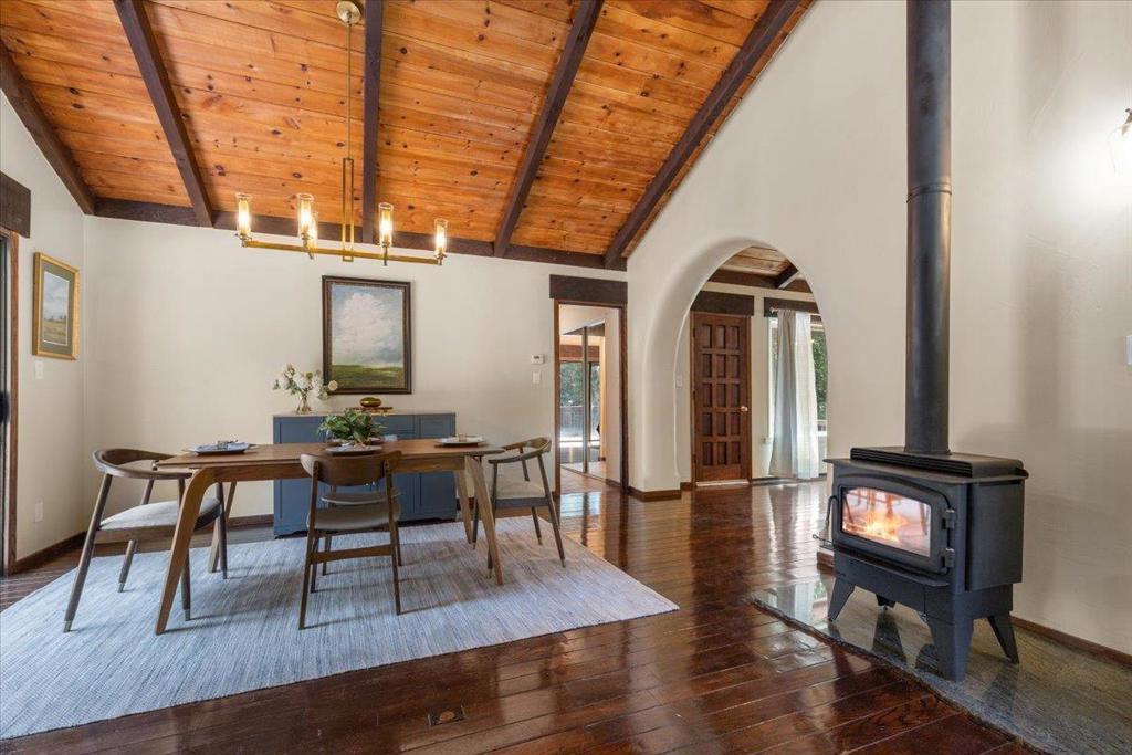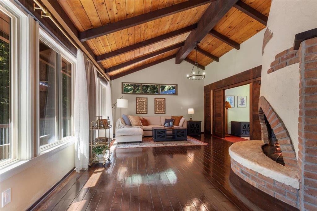 This unique property exudes peace & tranquility, offering versatile living spaces & enchanting outdoor areas designed for relaxation & connection. The main home features 2 bds, 2 ba, plus a bonus room that could serve as a library, home office, or even an additional bedroom. Attached is permitted living space w/ private entrance, including full kitchen & dining area, a lovely courtyard, & back deck, making it perfect for guests, extended family, or rental income. Utilities are shared with main house. The open-concept layout seamlessly connects the kitchen, dining, & living areas, anchored by an oversized stone fireplace. The primary suite is its own sanctuary, complete with a wood-burning fireplace, & a spa-like bathroom featuring a Jacuzzi tub set before a bay window with tranquil forest views. A large wraparound deck invites you to soak in the surrounding nature, while the welcoming courtyards feature pomegranate, lemon & fig trees, cozy conversation pits, & 2 outdoor showers, create magical spaces to gather & unwind. Plenty of parking, offering a large carport with a built-in shed/workshop & room for an oversized vehicle. Whether you're looking for a peaceful getaway or a versatile home with income potential, this gem is a must-see.
