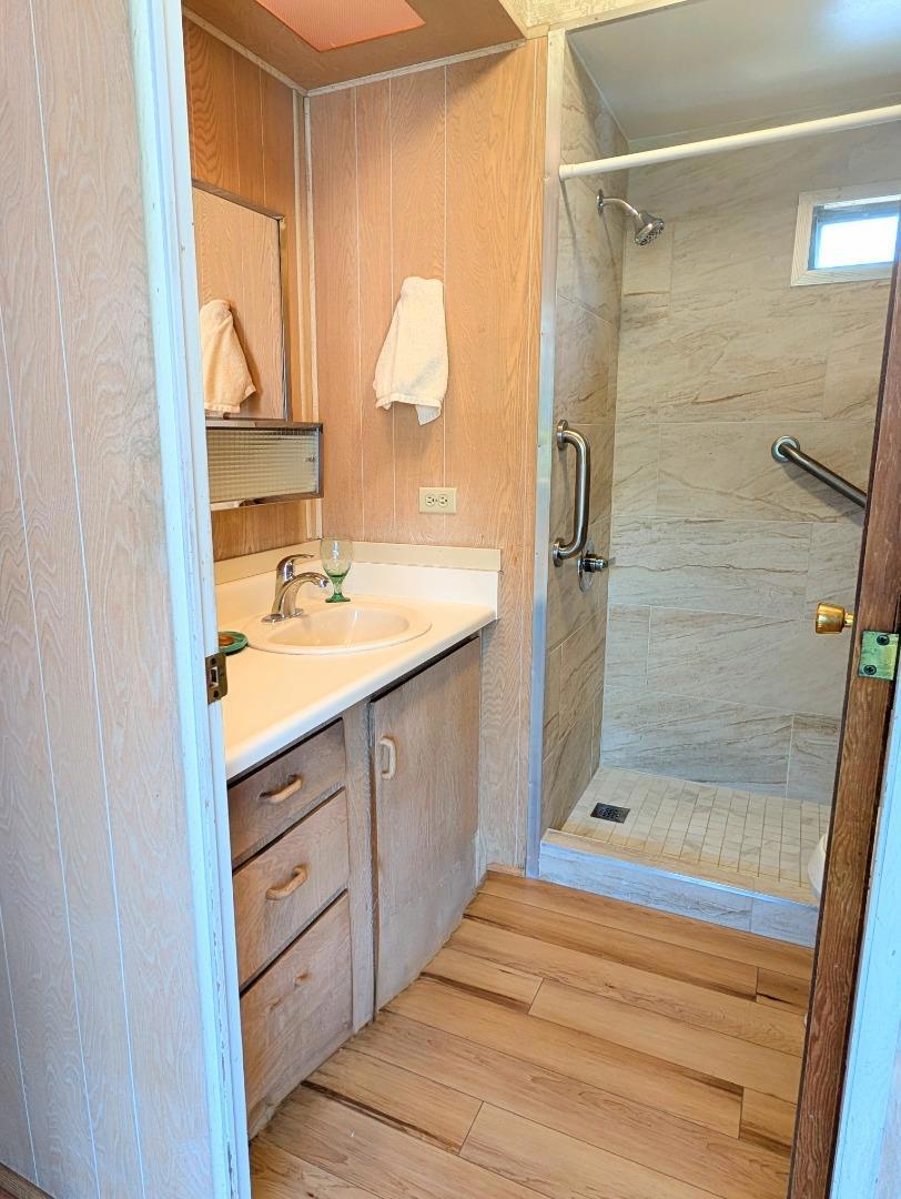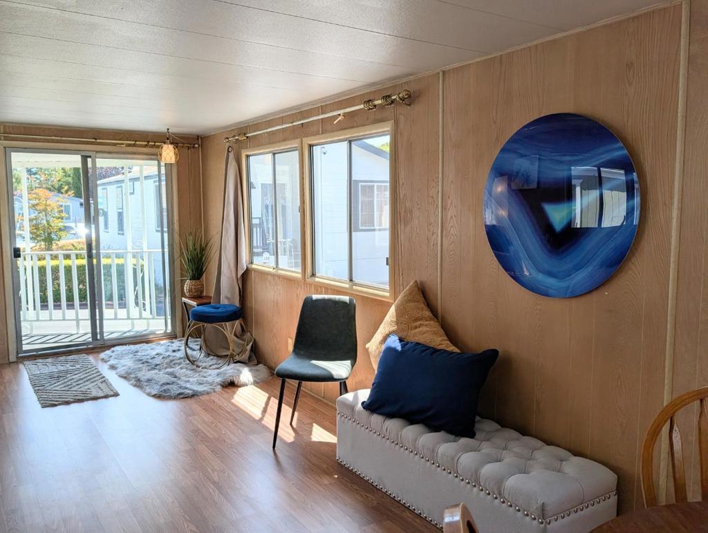 Generous price drop!! Best price in Sunnyvale for this charming 1-bedroom, 1 bath home located in the most desirable Park in Sunnyvale. Move right in, home features upgraded stone tile shower, pride of ownership, and is light and bright. Home has now been passed down through 2 generations. Low space rent!! Cozy, yet open feeling home offers a welcoming and functional kitchen, perfect for preparing meals. Living and dining room are a combined l-shape, allowing for ease of movement and entertaining guests. Step inside to find new LVP flooring adding to the home's warm atmosphere. The living area Is open and perfect for entertaining guests. The laundry room for the complex is in the same row and is easily accessible. Backyard feature side deck with stairs to green grass, camellia bush which is over 30 years old, lemon tree, & more. Brand new laminate flooring throughout with the exception of master bedroom closet. New paint on ceilings, bathroom was fairly recently upgraded to have stall shower with low lip for easy entry & high quality wood look lvp flooring. all inspections are in. All questions are welcome. To qualify to purchase with Park management, Buyer must make 2.5 times space rent and have good credit history.