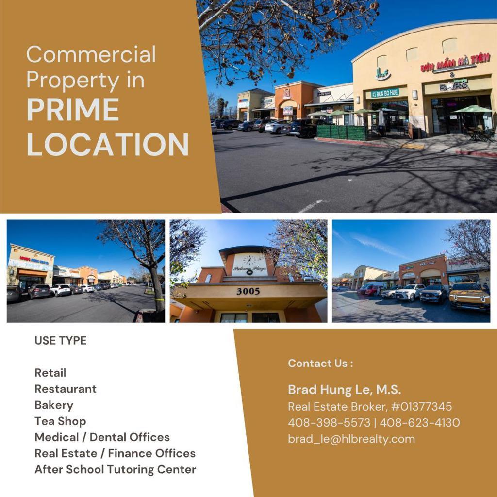 FOR LEASE / SALE: Excellent opportunity to invest / own a Commercial condo in one of the Prime locations of San Jose at Silver Creek Paloma Plaza, surrounded by many popular Asian restaurants and Coffee/Boba milk tea shops. Many possible different businesses include Professional Offices (Medical/Dental/Insurance/Law/Real Estate & Mortgage, etc), Retail (Fast Food/Bakery/Restaurants/Coffee, Boba Milk Tea, Ice Cream/Yogurt, etc). Immediate neighborhood surrounded by high density residential and complimentary retail uses. Front and back facade signage with high visibility. Heavy daytime foot traffic. Nearby major retailers include Target, Chick-fil-A, Costco, Sprouts farmer market, Lion/Maxim/Dai Thanh markets, Bank of America/Chase, Lexann Professional Medical Offices, Starbucks, Happy Lemon, Bambu, Sizzler, L&L Hawaii, Aqui Mex, etc. just to mention a few. Abundant and convenient on-site parking for business owners, employees and customers. Don't miss out this great opportunity! Must come by to see it for yourself! Contact us today to schedule a viewing!