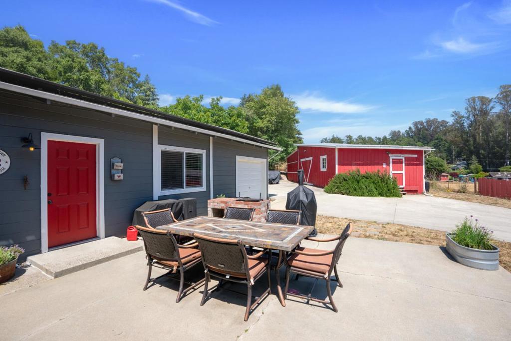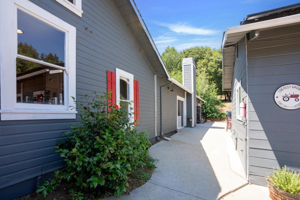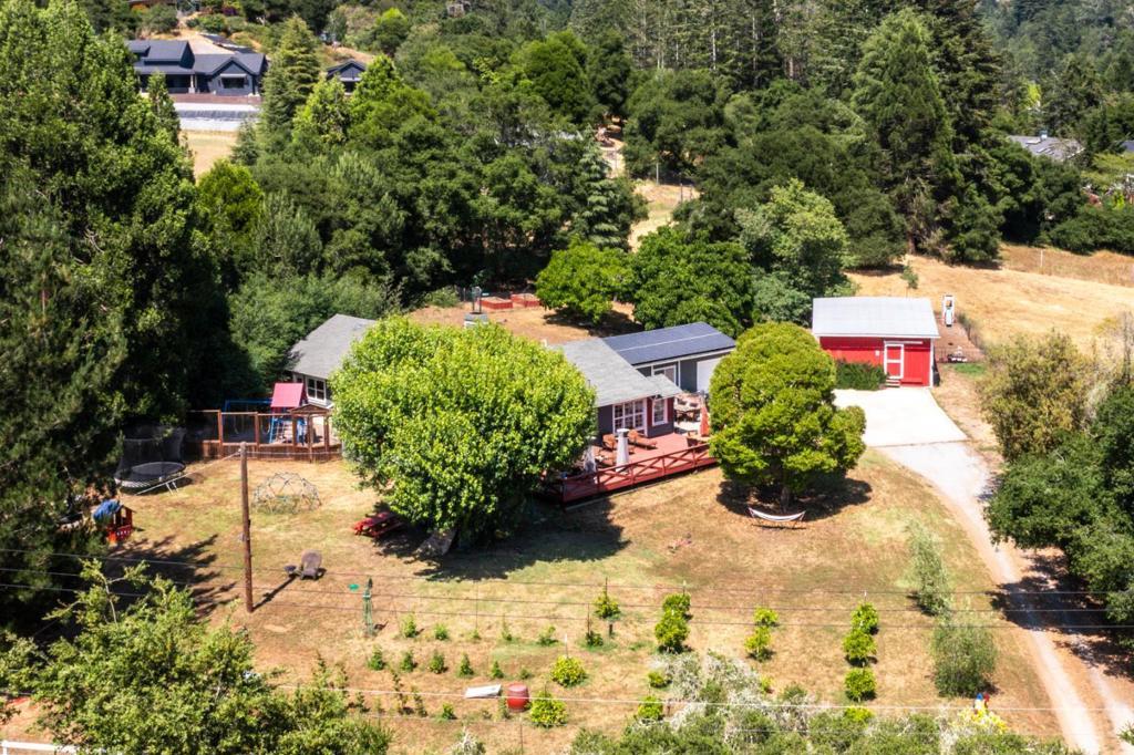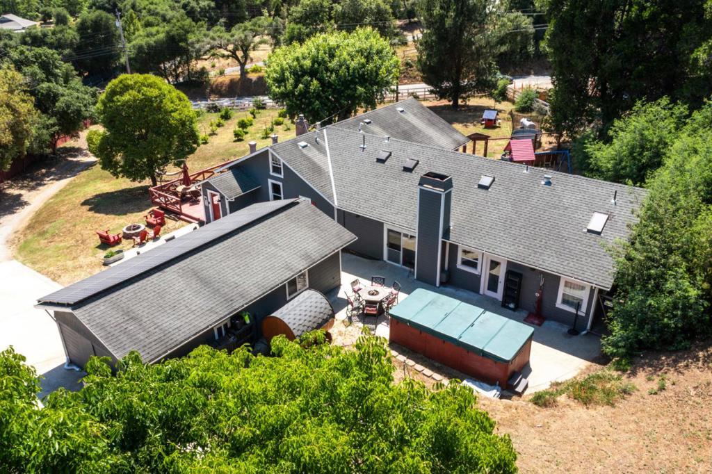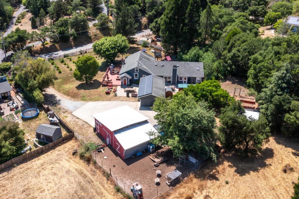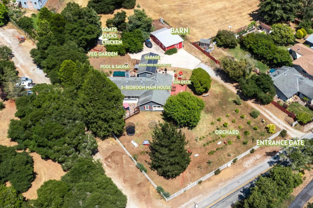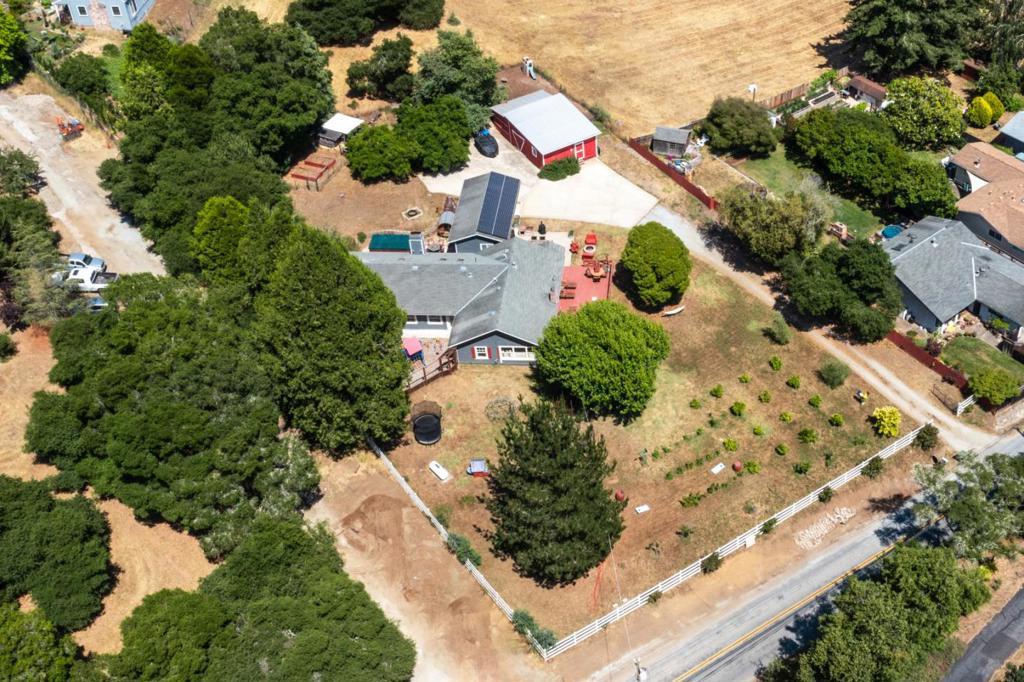 Nearly one usable acre, fully fenced. Contemporary Home, addition done with permits in 2004. High ceilings let in abundance of natural light. Designer chef's kitchen boosting a large quartzite stone island, black walnut custom cabinetry, premium appliances, 5-burner cook-top, walk-in pantry. Spacious dining room complete with fireplace/wood-burning stove, perfect setting for family gatherings. All bedrooms offer direct access to the outdoors. Children's playground and charming reading nooks above the beds. Versatile home office/den is used as a fifth bedroom. Septic. Water supply is Central Water District. Solar is paid & owned, newer tankless water heater, Solar-heated above-ground exercise pool & outdoor sauna. Detached garage. Next to it, don't miss the Separate Room with a kitchenette. Barn can be transformed into additional 3-car garage/workshop. Raised garden beds & mature fruit trees. Everything you dream of, still lots of room to grow.