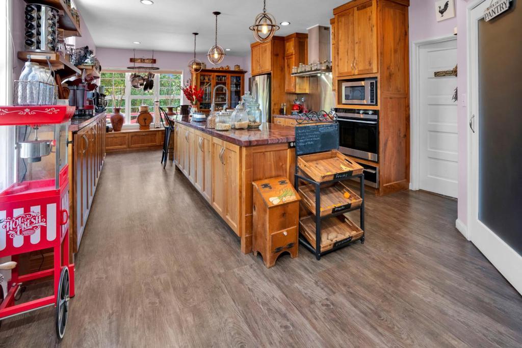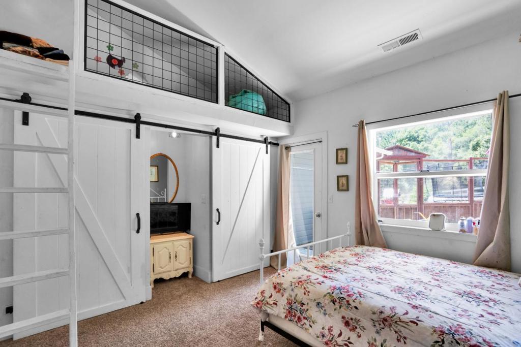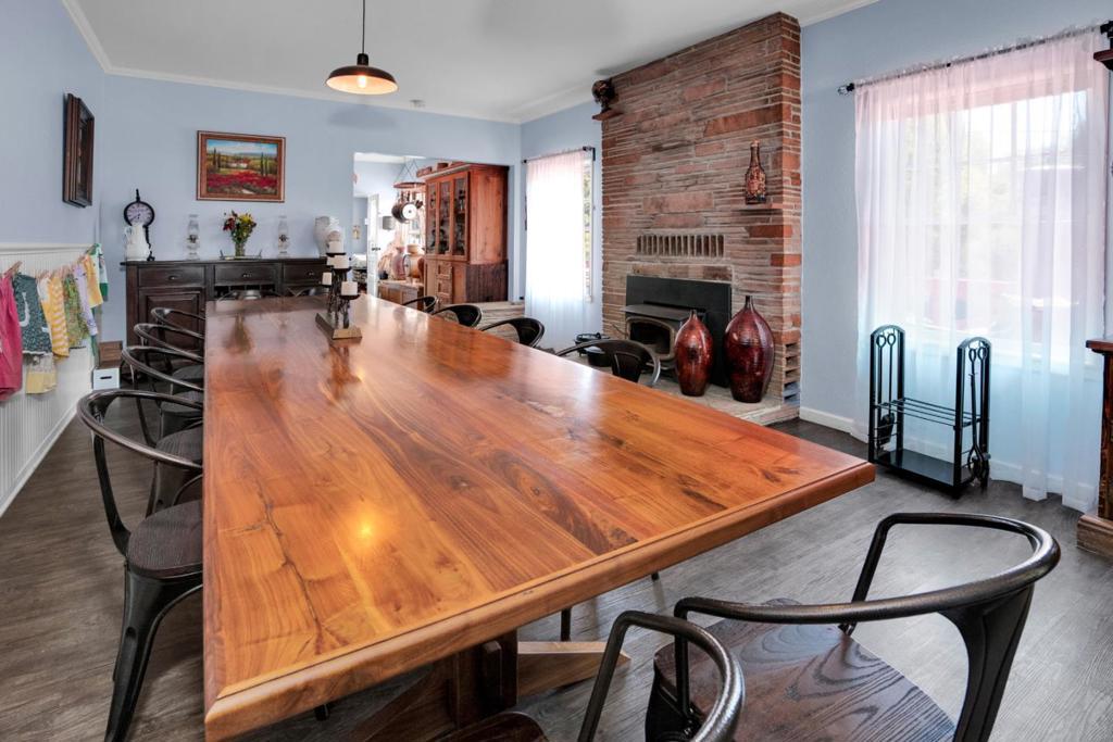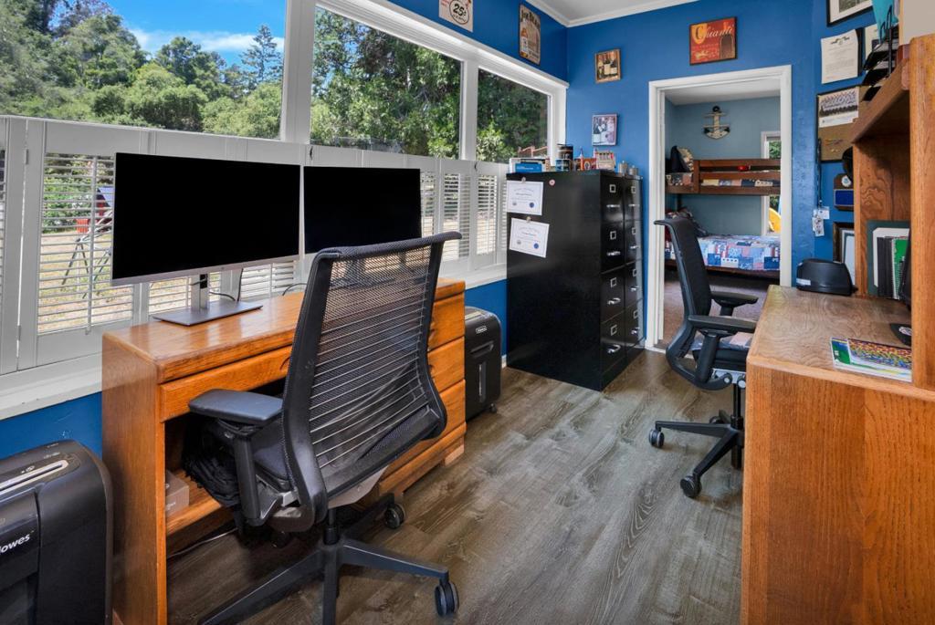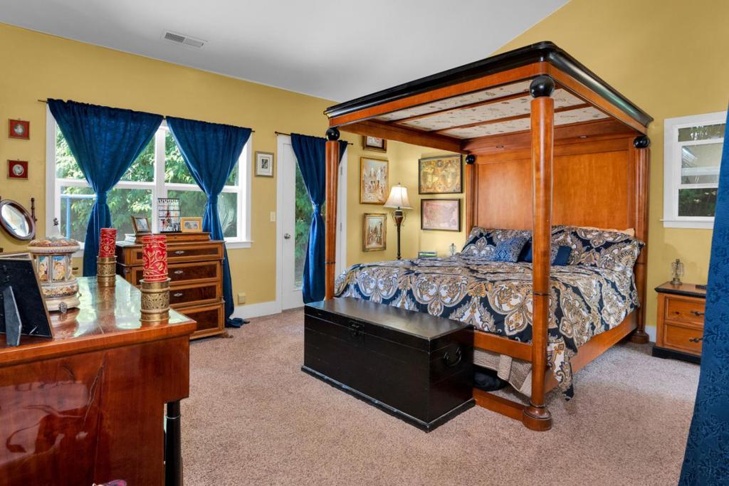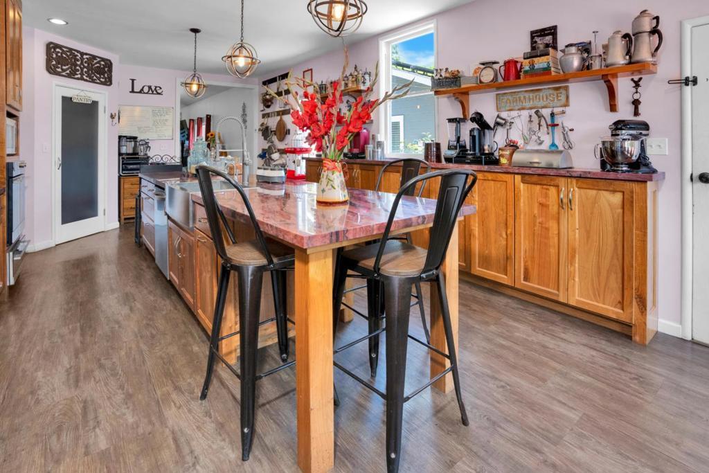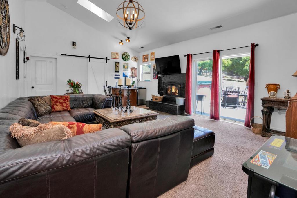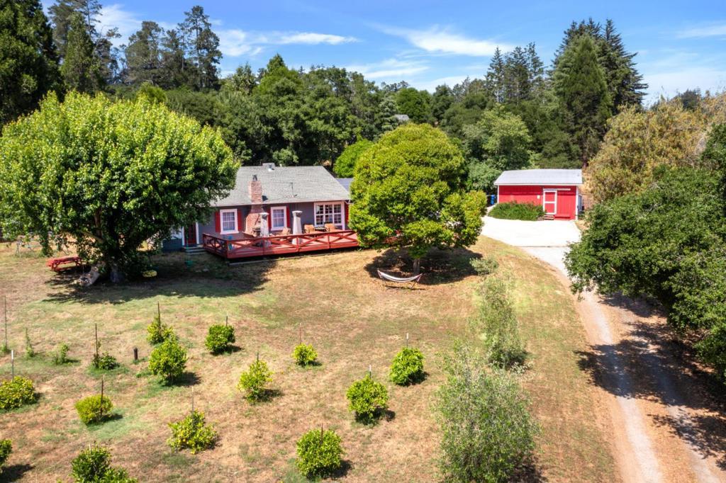Nearly one usable acre, fully fenced. Contemporary Home, addition done with permits in 2004. High ceilings let in abundance of natural light. Designer chef's kitchen boosting a large quartzite stone island, black walnut custom cabinetry, premium appliances, 5-burner cook-top, walk-in pantry. Spacious dining room complete with fireplace/wood-burning stove, perfect setting for family gatherings. All bedrooms offer direct access to the outdoors. Children's playground and charming reading nooks above the beds. Versatile home office/den is used as a fifth bedroom. Septic. Water supply is Central Water District. Solar is paid & owned, newer tankless water heater, Solar-heated above-ground exercise pool & outdoor sauna. Detached garage. Next to it, don't miss the Separate Room with a kitchenette. Barn can be transformed into additional 3-car garage/workshop. Raised garden beds & mature fruit trees. Everything you dream of, still lots of room to grow.