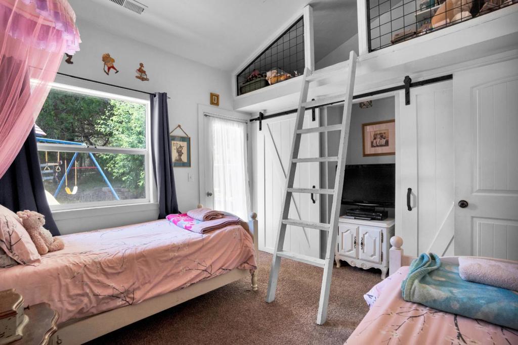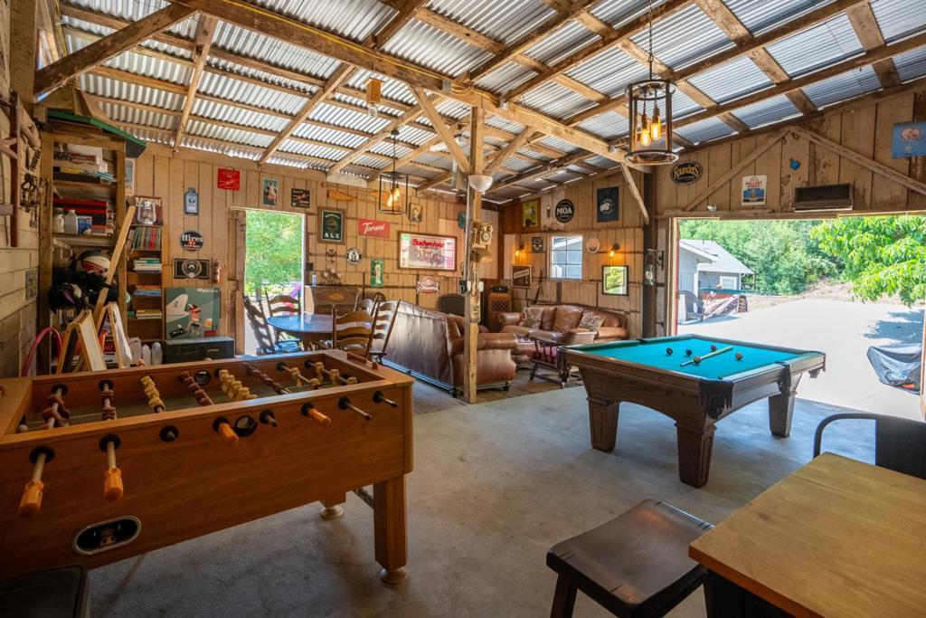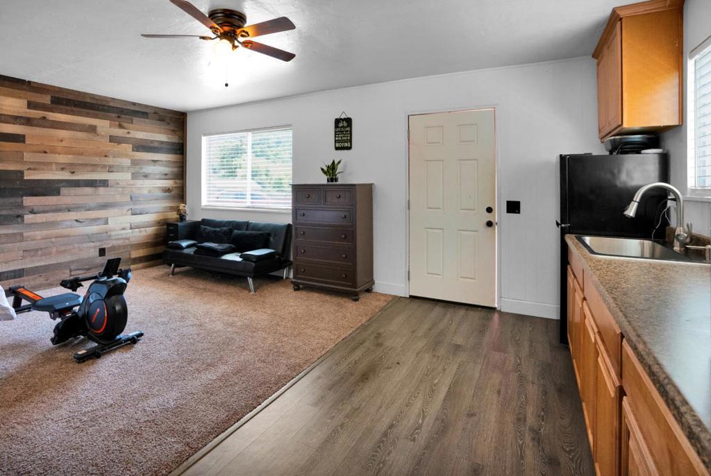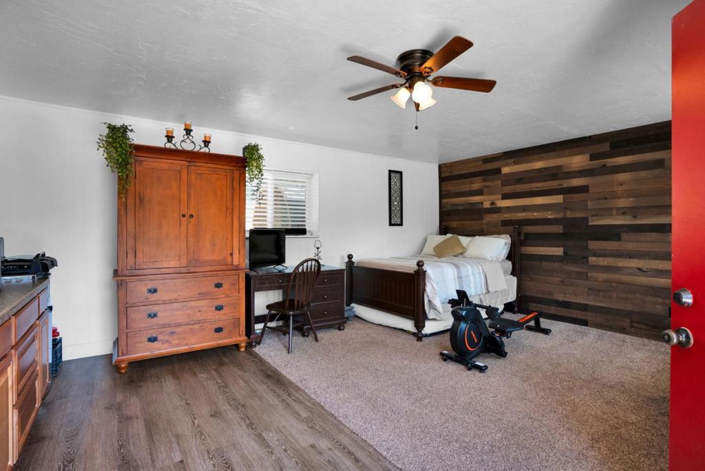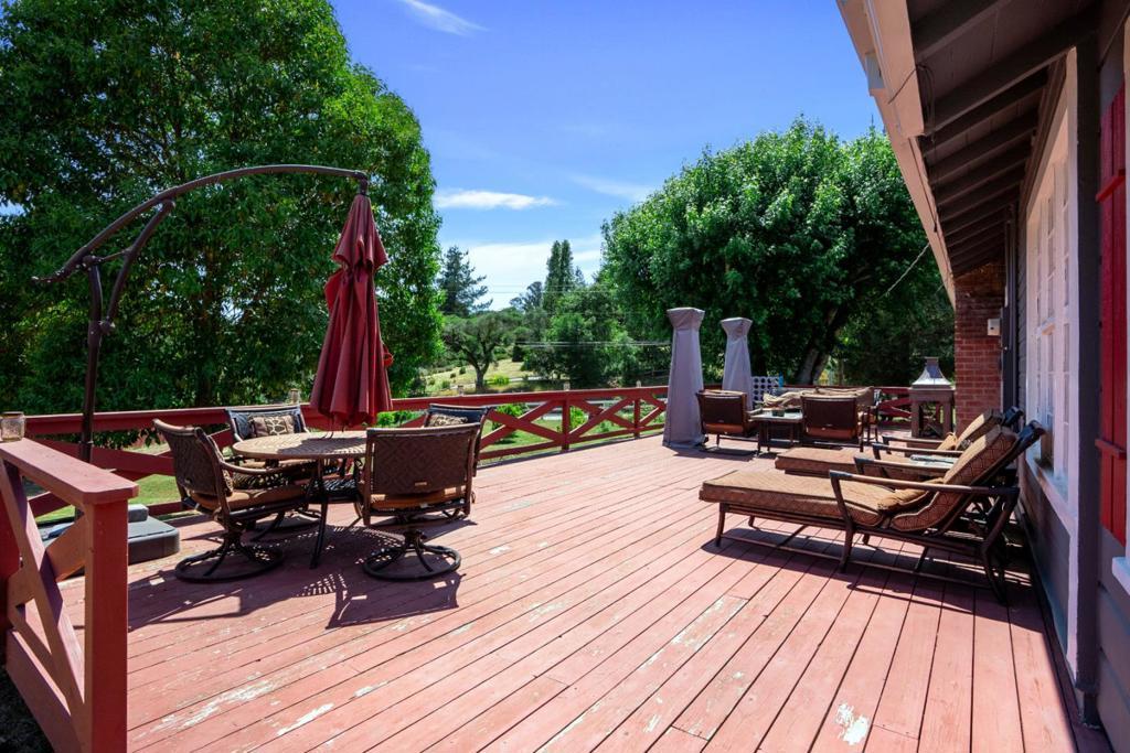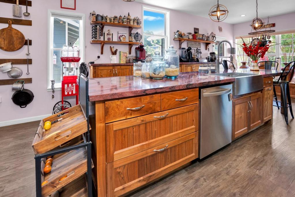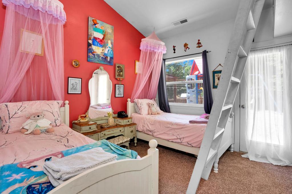 Nearly one usable acre, fully fenced. Contemporary Home, addition done with permits in 2004. High ceilings let in abundance of natural light. Designer chef's kitchen boosting a large quartzite stone island, black walnut custom cabinetry, premium appliances, 5-burner cook-top, walk-in pantry. Spacious dining room complete with fireplace/wood-burning stove, perfect setting for family gatherings. All bedrooms offer direct access to the outdoors. Children's playground and charming reading nooks above the beds. Versatile home office/den is used as a fifth bedroom. Septic. Water supply is Central Water District. Solar is paid & owned, newer tankless water heater, Solar-heated above-ground exercise pool & outdoor sauna. Detached garage. Next to it, don't miss the Separate Room with a kitchenette. Barn can be transformed into additional 3-car garage/workshop. Raised garden beds & mature fruit trees. Everything you dream of, still lots of room to grow.