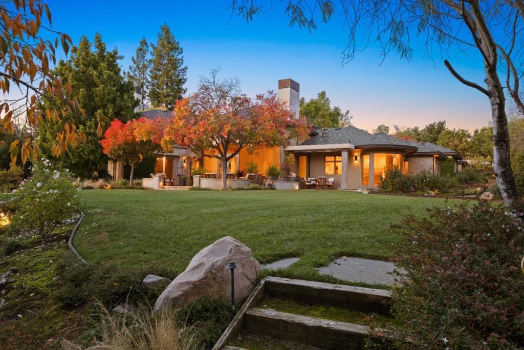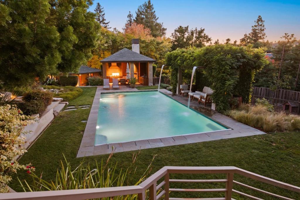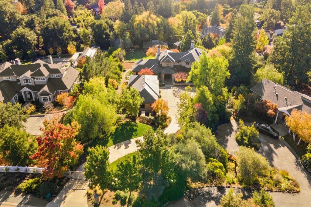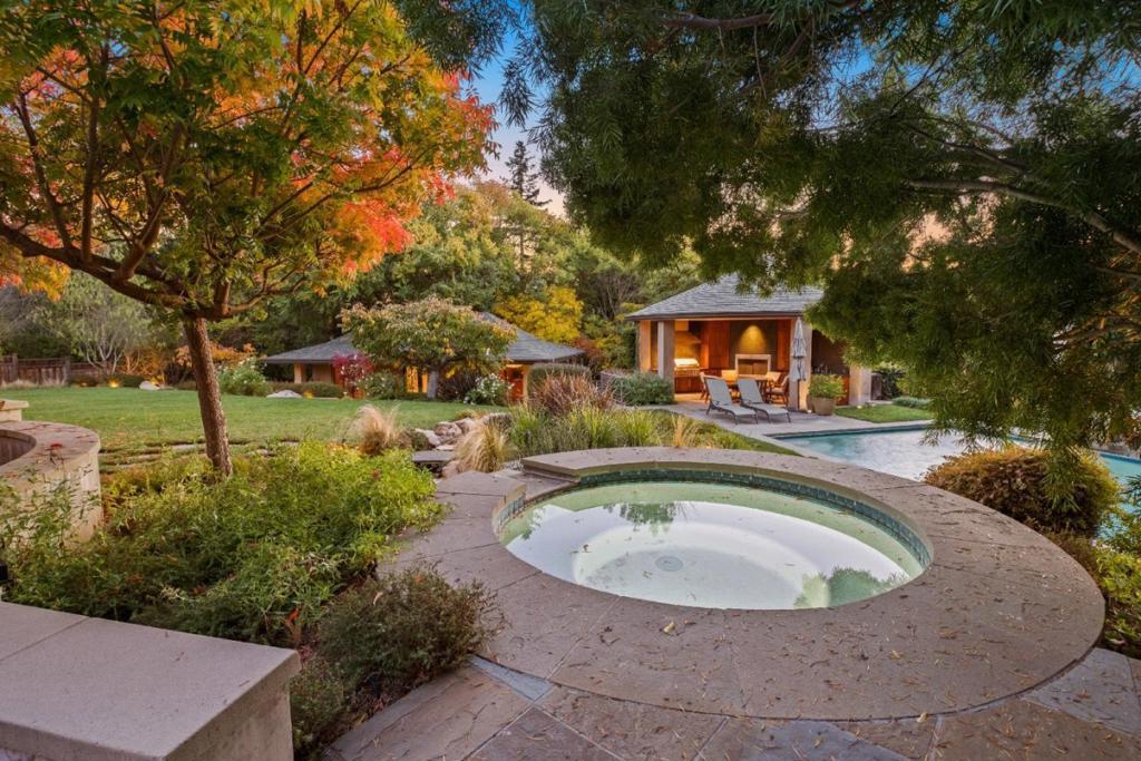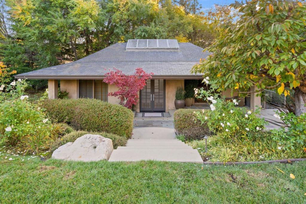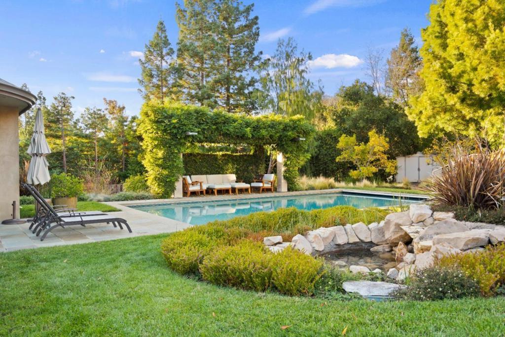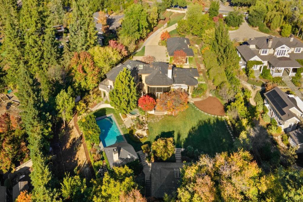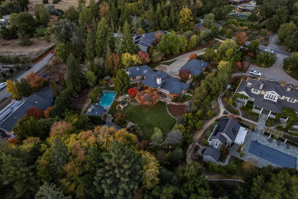Contemporary masterpiece with 2-story guest house, pool pavilion, plus pool and spa on just over 1 acre of manicured gated grounds. Exotic woods of curly maple, pear, and Sapele mahogany complement maple and Halila limestone floors and counters in Brazilian granite and limestone. Graceful curves adorn walls, ceilings, windows, and cabinetry that maximizes storage. 5 bedrooms and 6.5 baths, library, lounge, full bar, 9-seat theatre, 2,000 bottle wine cellar, fitness center with steam & sauna, plus 2 offices one with secret Orient Express train car room with overhead train track that runs through both rooms. The guest house is designed in a Japanese teahouse style and the pavilion has a full kitchen for poolside entertaining. Meticulously landscaped grounds have many water features including streams, ponds, and waterfalls. Behind the scenes is home automation, security, whole-home backup generator, radiant heat & EV charging in the 5 car garage. Desirable cul-de-sac and close-in location. Excellent Los Altos schools.