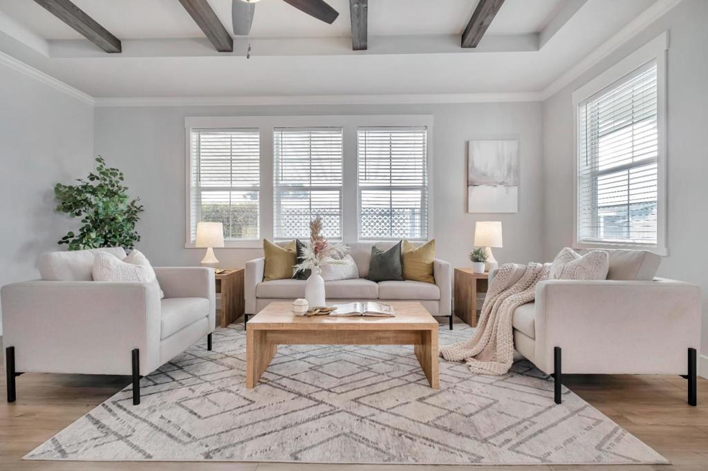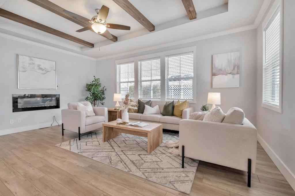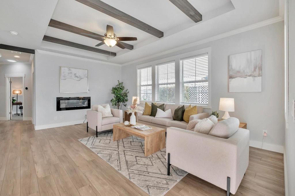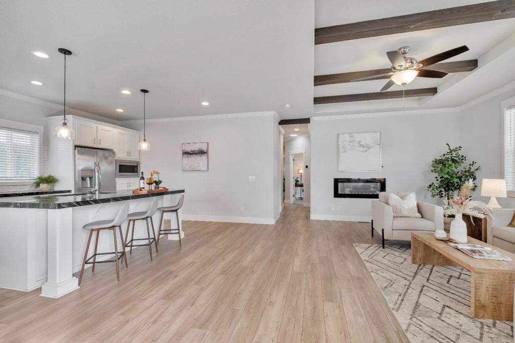 Live vibrantly in this beautifully designed 3 bed, 2-bath home in the welcoming 55 plus community of Monterey Vista! Built just six years ago, it blends modern comfort with relaxed elegance featuring recessed ceilings with exposed beams, an electric fireplace, and sleek marble countertops. The open-concept kitchen is perfect for entertaining, with a spacious island, stainless steel appliances, crisp white cabinetry, and subway tile backsplash. Enjoy a private primary suite with walk-in closet, dual sinks, and a spa-style shower. Discover low-maintenance luxury and social senior living at its best. Note: Current photos do not reflect the actual (updated) staging, but the home still shows beautifully.