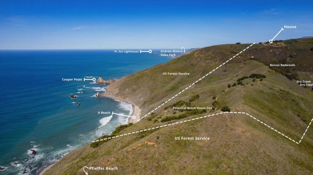 This 100+ acre nature preserve with white sand beach, redwood forest, and 360 degree views is where Big Sur architect Mickey Muennig chose to design his final residential masterpiece. Set within Deer Ridge by way of a sod roof that also provides insulation, Muennig created this luxurious off grid residence on a site with views all the way to San Luis Obispo and Santa Cruz counties. Radiant heat warms the huge concrete foundation which supports the massive north and south facing glass walls that bring the outside in. Exquisite wood craftmanship defines the 3 bdrms and 3 baths in the main house and the detached guest house which provide the base from which to explore the property's micro-climates, habitats, seasonal streams, miles of trails, and white sand beach that may only be reached from this property, or the sea. Just above the un-named beach, a potential building site sits within a natural amphitheater of land which just may be the most private oceanfront site on the entire coast.