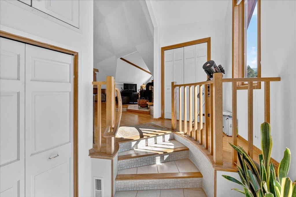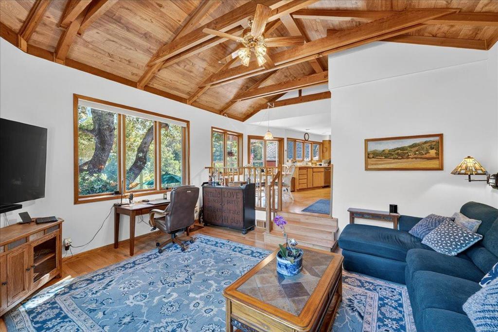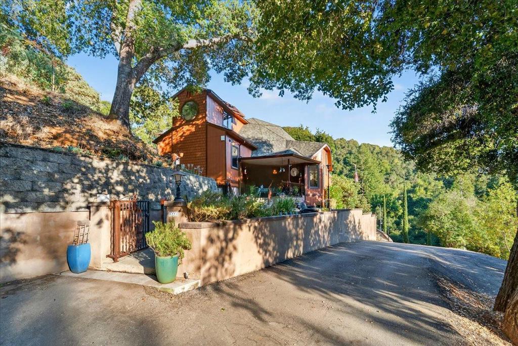 Dreaming of mountain living while working in Silicon Valley? Discover your solution! Nestled on 4.87 acres in a historic hidden valley east of Loma Prieta with breathtaking 180-degree canyon views, this 3,095 sqft home offers sustainable living, high-speed internet, with a fully automated solar power system and backup generator. At nine hundred feet above the valleys fog, haze, and noise, the home is bathed in natural light from expansive windows framing panoramic vistas. It features a detached RV-ready garage, a spacious workshop, and versatile outbuildings for hobbies or storage. Inside, hardwood floors, soaring ceilings, and an open floor plan create an airy, inviting atmosphere, complimented by amazing acoustics, an inspiring art studio, and an office/library. The kitchen features a gas range, double oven, stainless steel appliances, and generous counter space. Relax by the wood-burning fireplace or step onto the expansive patios under a beautiful oak tree to savor coffee or wine as the sun sets over the hills. This rare blend of privacy, craftsmanship, and natural beauty offers more than a home, its a lifestyle. Experience mountain serenity every day. All within easy reach of Silicon Valley.