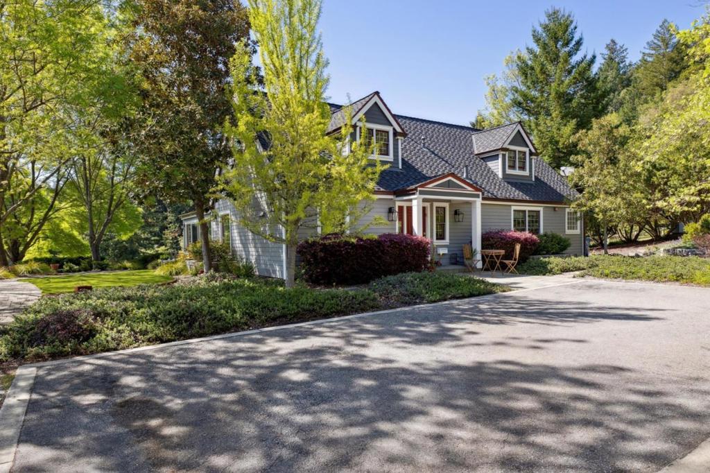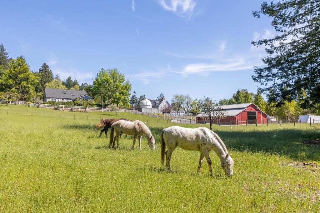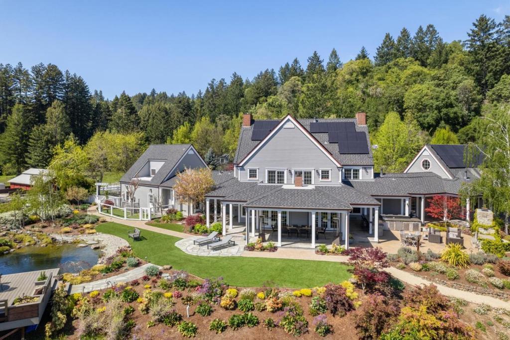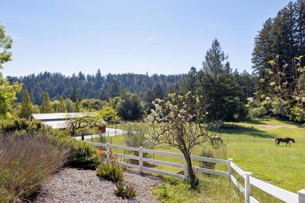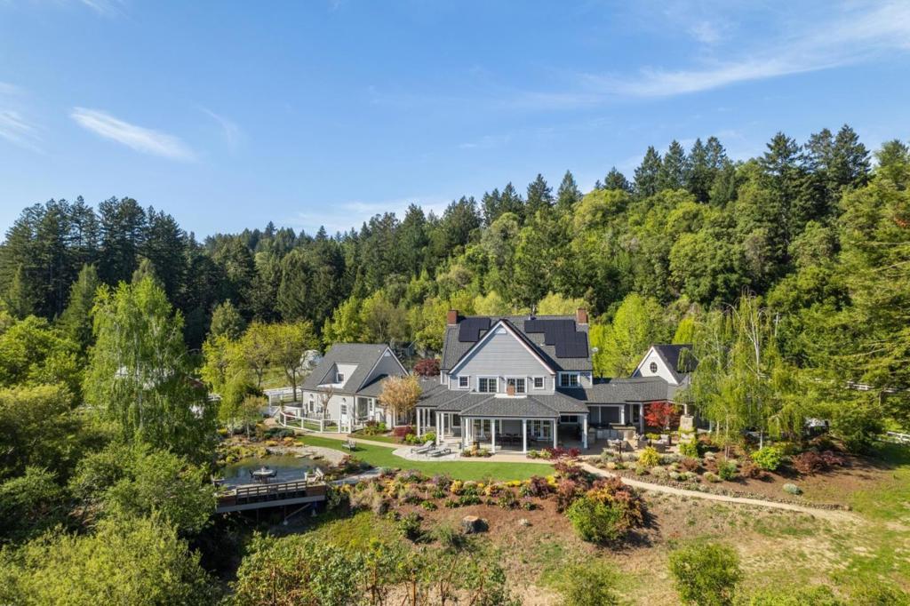 One-of-a-kind luxury estate set on ~30 acres with sunny pastures, redwood forest, & distant bay views. Impressive colonial style home with grand entry hall, formal living & dining rooms, family room, billiards room/library, wine tasting room with wine cellar, sumptuous primary suite with loft, 3rd floor recreation room & unfinished attic space, planned as home theater, has plumbing for half bath. All bedrooms have ensuite baths, 5th bed with wet bar over att. 3 car garage, and huge laundry room (potential 2nd kitchen). Detached guest house/legal ADU with own address: 3 beds/2.5 baths, sun room, private patio. Outdoor kitchen/living area with stone fireplace, European style pond with waterfall, beach entry & deck. Fenced gardens with custom pergola, mature orchard, bocce court. Fiberglass dome observatory with telescope, floodlit all-weather sports court, 60'x36' MD Barnmaster barn (inc. car lift, houses sellers' car collection), barn door raised for RV. Level/gently sloped fenced pastures, ample space to add a riding arena. Private trails through the redwood forest. Potential equestrian use, winery, organic farm, retreat/sanctuary. New roof, 22.5W solar system, auto generators for both houses. Only 1.5miles from Hwy 17, 8 miles/10-12 mins to downtown Los Gatos