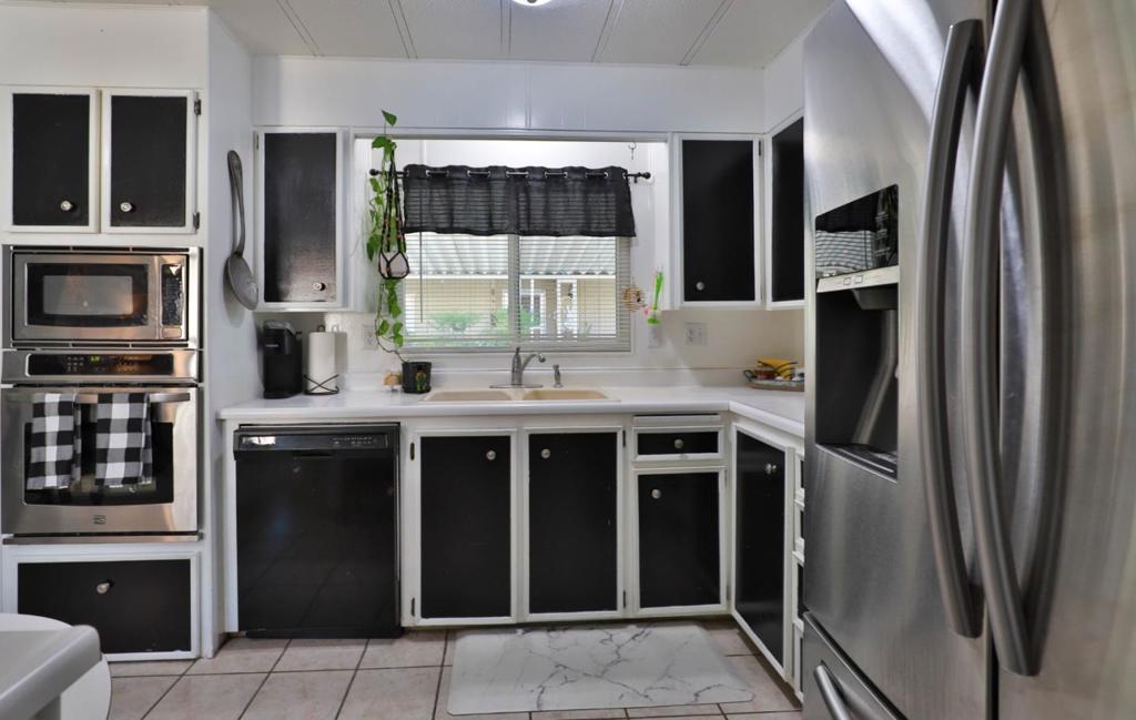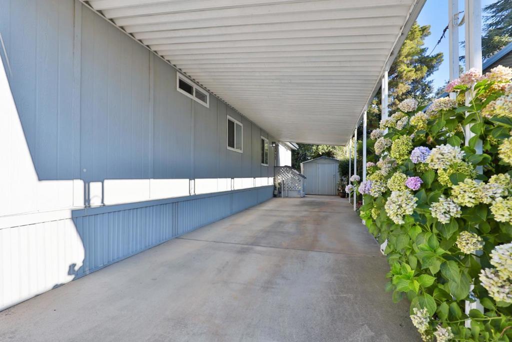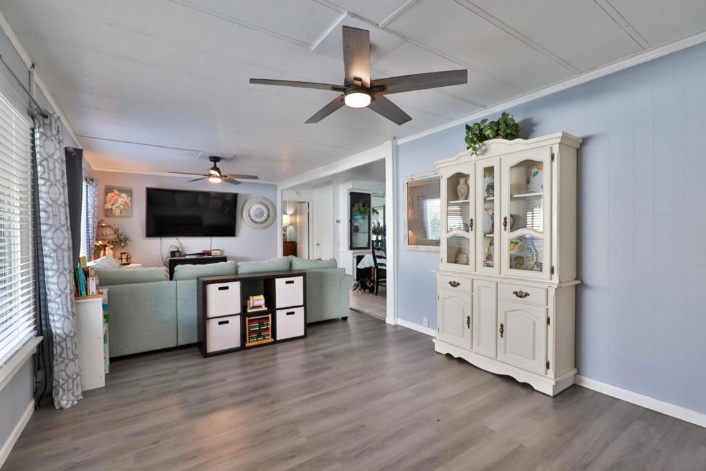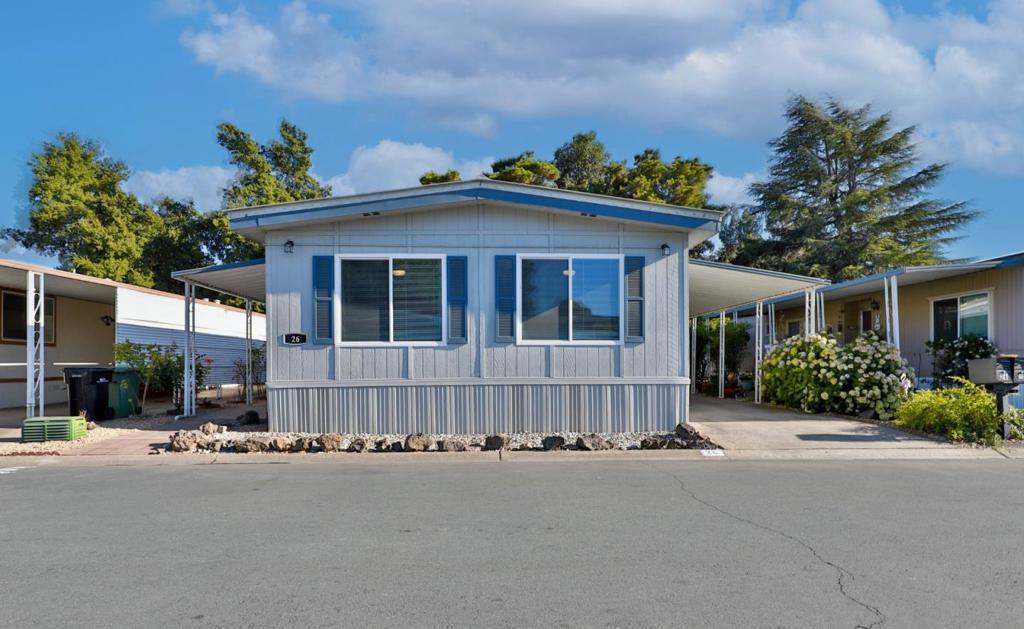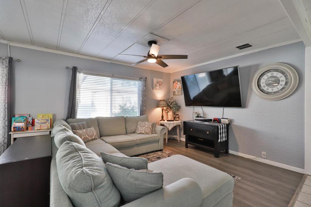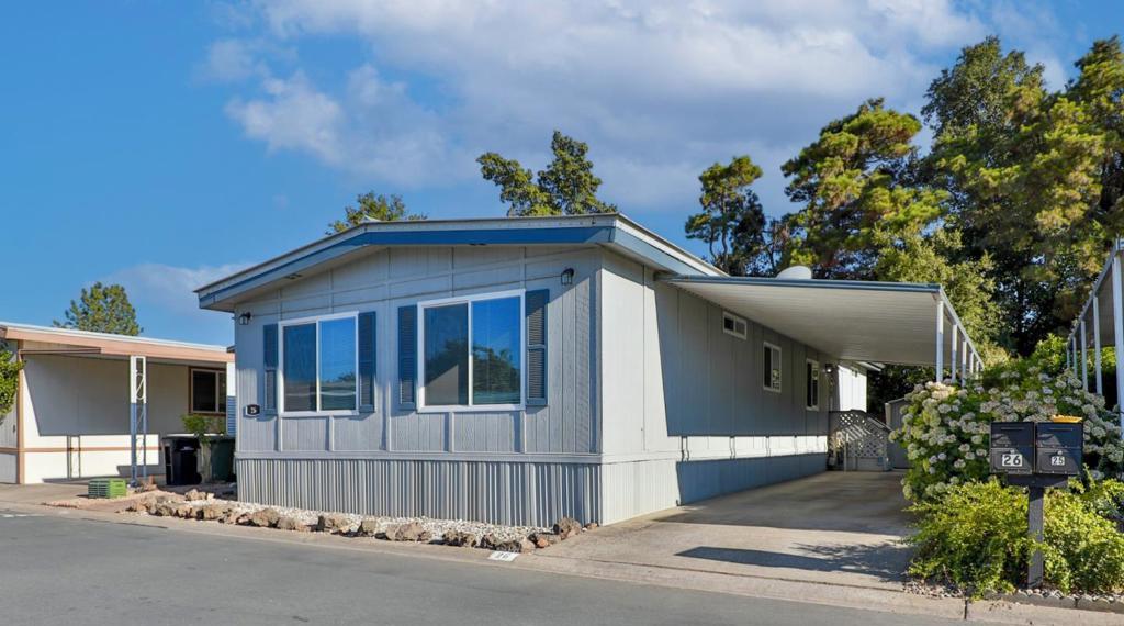 $250 Off Space Rent per month for the first year! Get moved in and through the holidays with a little help from the sellers! Move-In Ready bright and cheerful home tucked inside a well maintained all ages park, Surrounded by the vineyards of Lodi's celebrated wine country. From the moment you step up to the charming entry, you'll feel right at home. Inside, the spacious layout is designed with both comfort and privacy in mind. The primary suite is positioned at the rear of the home, featuring a large ensuite bathroom and shower over tub. A newly installed sliding door leads to your own private garden, recently landscaped with in-ground lemon tree and no rear neighbors! Up front you'll find two additional bedrooms and a stylishly updated full bath. The living room is filled with natural light pouring in through the oversized dual pane windows and rustic-modern ceiling fans add character and comfort. The heart of the home is the black & white themed updated kitchen boasting stainless steel appliances which opens to the dining area and its built-in hutch for storage & display. Adjacent cozy laundry room leads you out to the covered two-car carport and 2 8x6x7 storage sheds that both have power. Plus, the washer, dryer and refrigerator are included! Your Home Sweet Home!