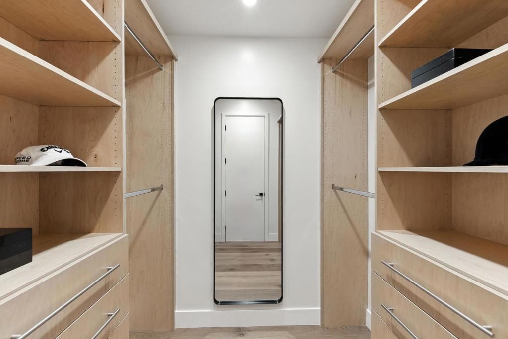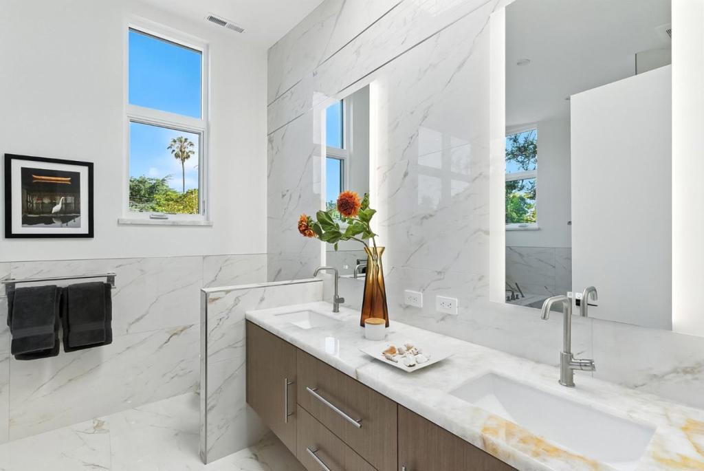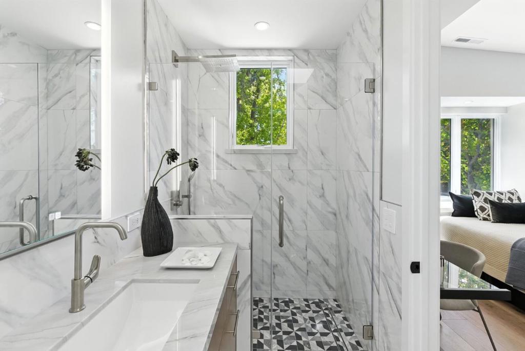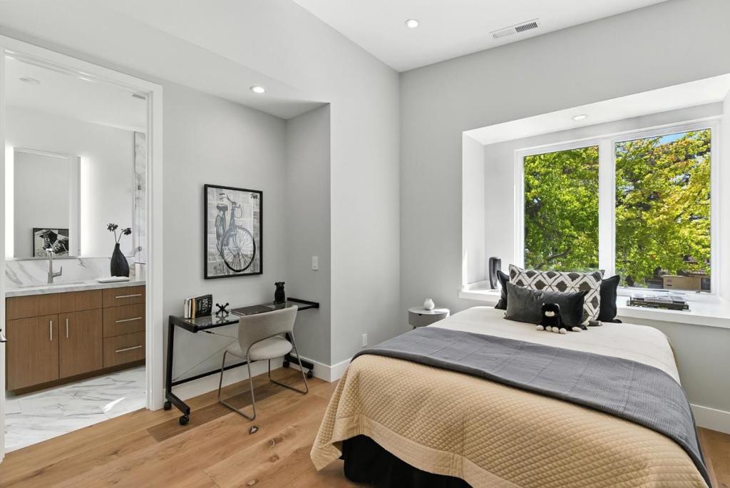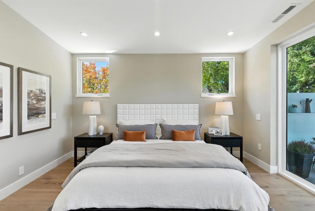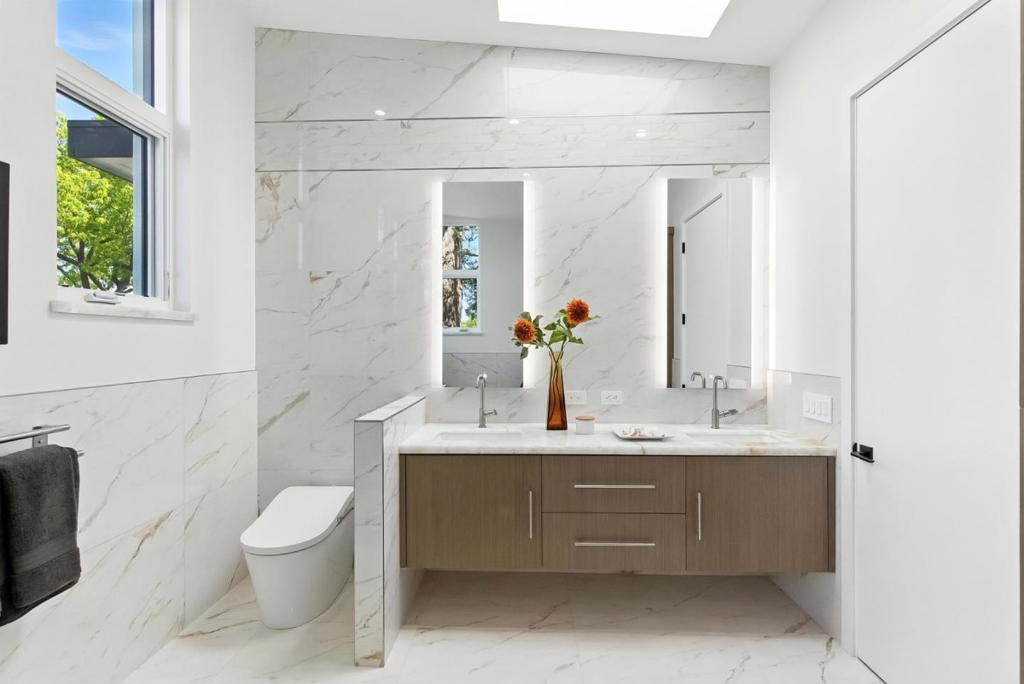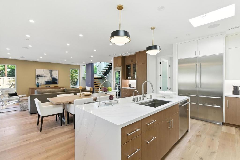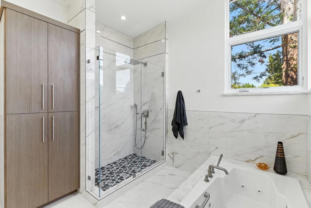 Completely new completed in June 2025. Beauty is more than skin deep 5 ft. deep foundation, steel framing, 10 in. thick exterior walls - be sure to see the features list in the property disclosures. Living space 2420 sq. ft. home, plus 434 sq. ft. garage & 221 sq. ft. patios & balcony. No remnants of the old structure remain, this stunning contemporary blends thoughtful design with luxurious finishes crafted for modern living & refined entertaining. The gallery-style foyer leads to a dramatic open-concept space, anchored by a striking modern staircase. The kitchen is a true showpiece, outfitted with Thermador appliances. A custom wine tower adds elegance, perfect for entertaining. Ample cabinetry provides generous storage, while a fresh air exchange system ensures cooking odors are continuously replaced with clean, filtered air. All four bedrooms feature ensuite bathrooms with Grohe fixtures and Toto bidets, combining comfort and modern luxury for residents & guests. The expansive primary suite opens to a private balcony with views of mature trees while the spa-inspired bathroom includes a soaking tub, oversized shower, & a serene atmosphere to begin or end your day. Engineered for both beauty & performance, the home also includes advanced insulation, dual HVAC systems, & solar.