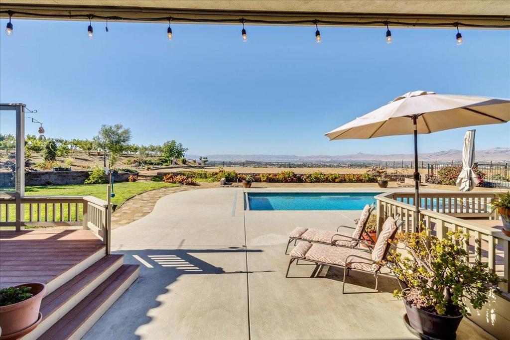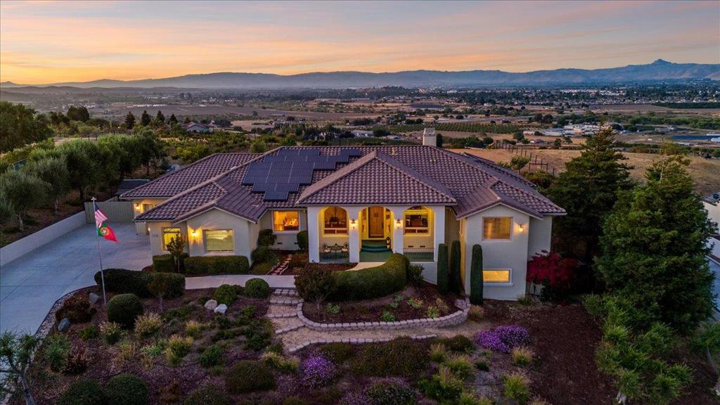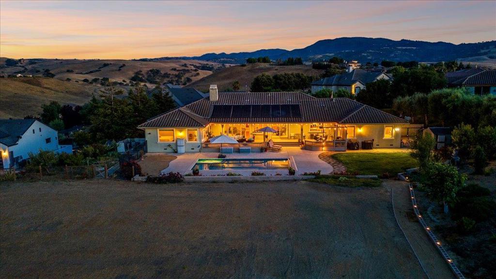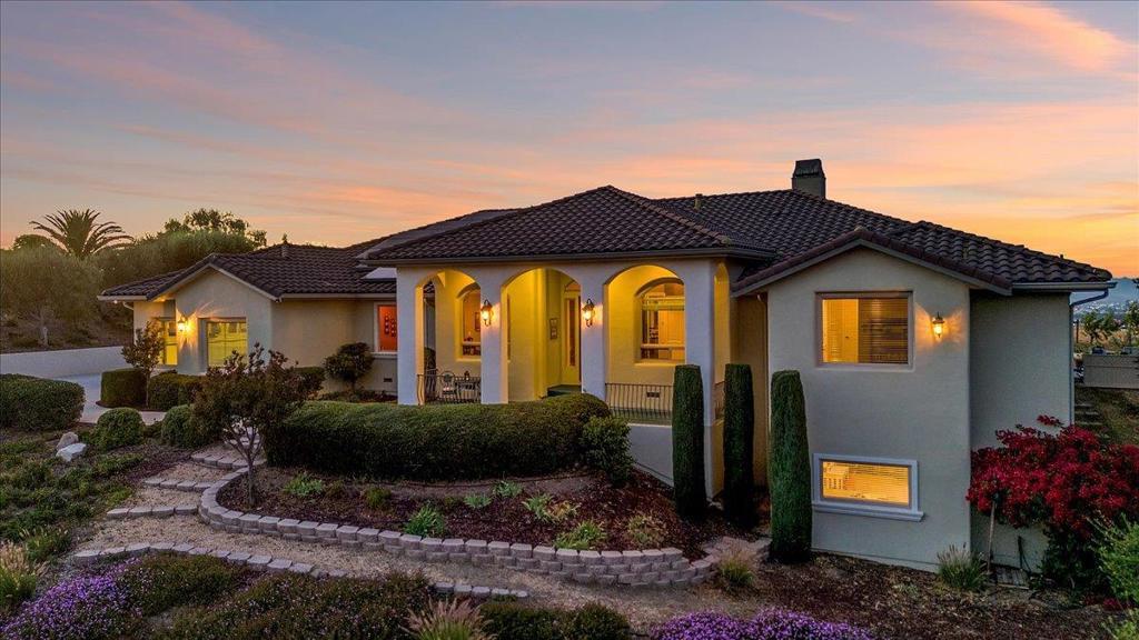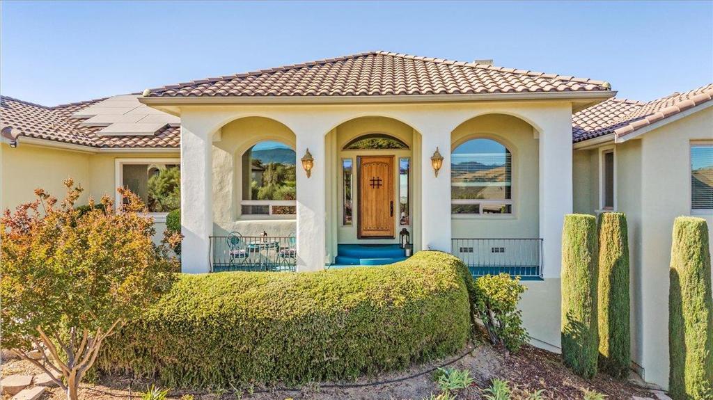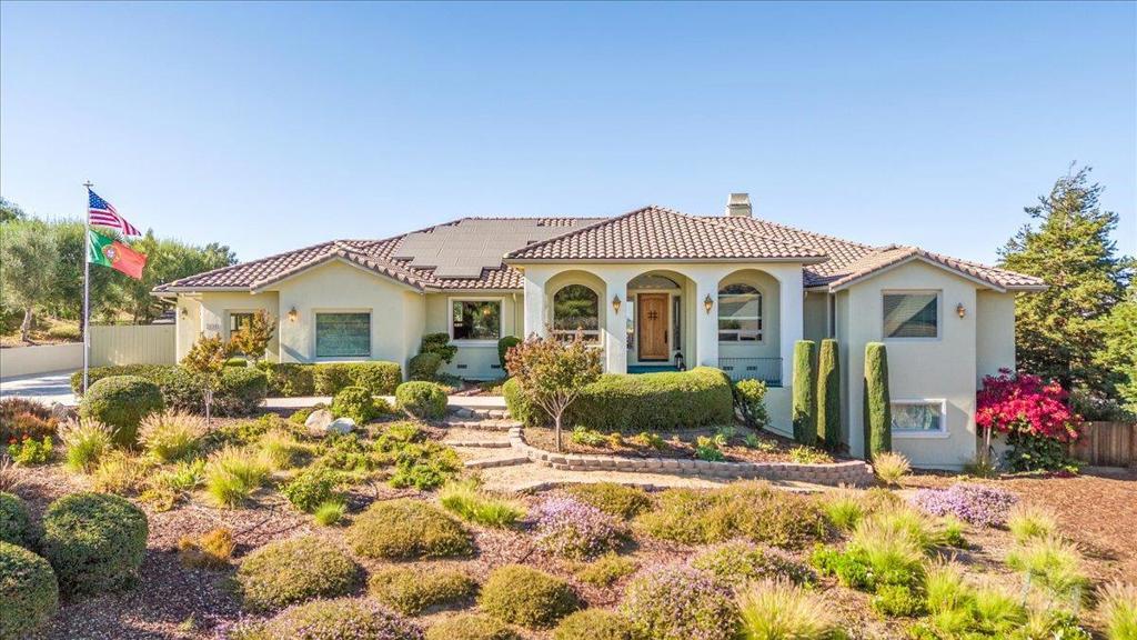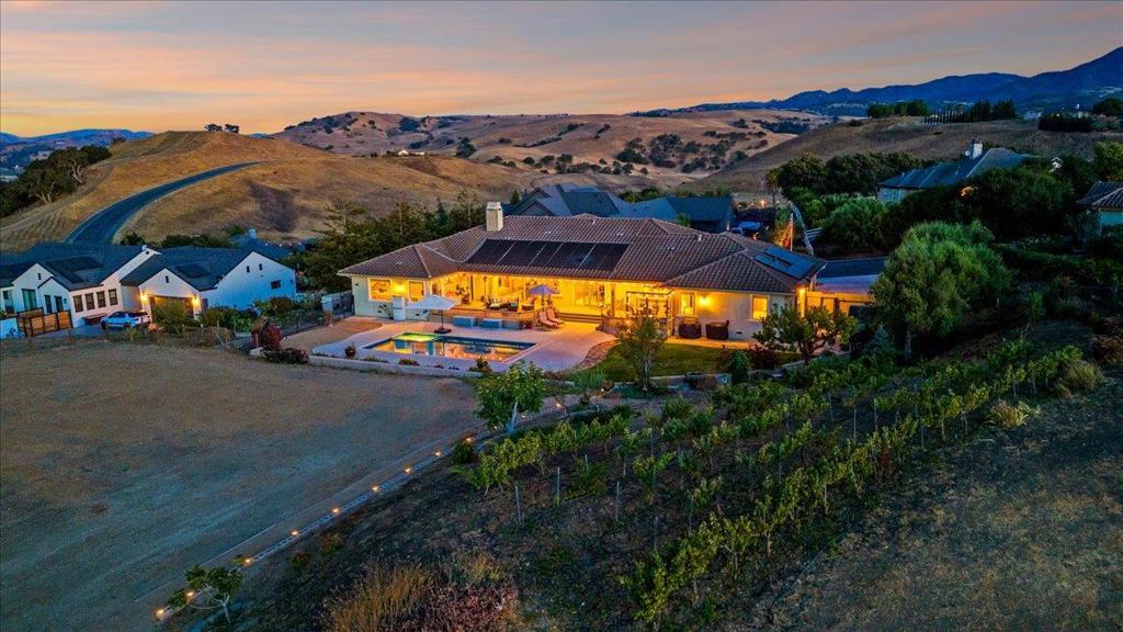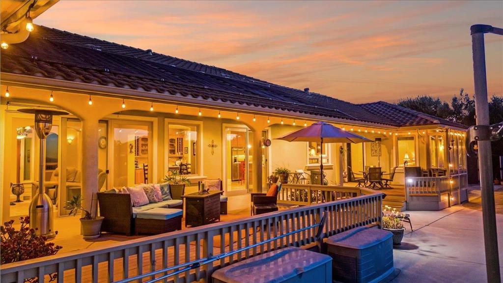 Well-Appointed Home in Gated Foothill Community with Panoramic Views.Over 4,000 Sq Ft + 700 Sq Ft Finished Bonus Room | 1+ Acre | 4 Beds 3.5 baths+ Office in Gated Community. Enter through a barrel-ceiling foyer into this stylish custom home with 4 beds, 3.5 baths, an office, and a large bonus room with a private entrance. Formal living/dining rooms feature crown molding and rich finishes. The open family room offers built-ins, surround sound, custom gas fireplace that flows into a chef's kitchen with granite island and countertops, custom cabinetry, double ovens, a 5-burner range, dual drawer dishwashers, a walk-in pantry with wire shelving, and a separate butler's pantry with barrel ceiling. Travertine and hardwood floors, high ceilings, dual-zone HVAC, solar panels, and solid 8-ft doors throughout. Expansive laundry/utility room with granite counters, deep sink and desk. The Primary suite has a spa-like bath, jetted tub, triple-head shower, and deck access. The private guest/in-law suite features a separate entrance, sitting area, and full bath. Jack & Jill bedrooms share a full bath. Enjoy city lights views from a spacious deck and patio with gas & solar-heated pool, spa, vineyard, fruit trees, 3-car garage, and storage in the subarea. HOA includes clubhouse and park.