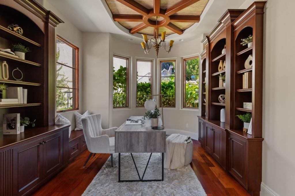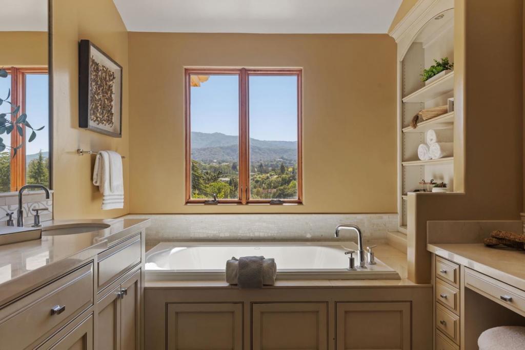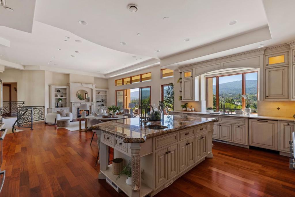 Custom-built Mediterranean-inspired estate (2011) offering panoramic Monte Bello views from each level. Nestled on a quiet cul-de-sac, this 5,693 sq ft residence combines timeless charm with modern luxury. Features include a chefs kitchen with Thermador appliances and RO filtration, a home theatre/game room with acoustic wall panels, and indoor/outdoor surround sound throughout. The home starts with serene entry with colorful garden beds, greenery and water fountain. An open family room and kitchen that opens to expansive decks with sweeping vistas. Thoughtfully designed for wellness and multi-generational living, the main floor hosts three en-suite bedrooms, while the lower level includes two additional bedrooms, a family/media room with its own large patio, and dedicated wine-closet space awaiting your personal touch. Eco-friendly amenities abound including owned solar panels, dual EV chargers, soft-water and carbon filtration systems, whole-home HRV for fresh air, and interior fire sprinklers. Incredible Views and only minutes from downtown Los Altos, premier schools, and I-280 access.