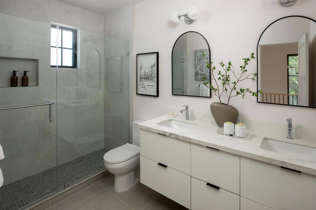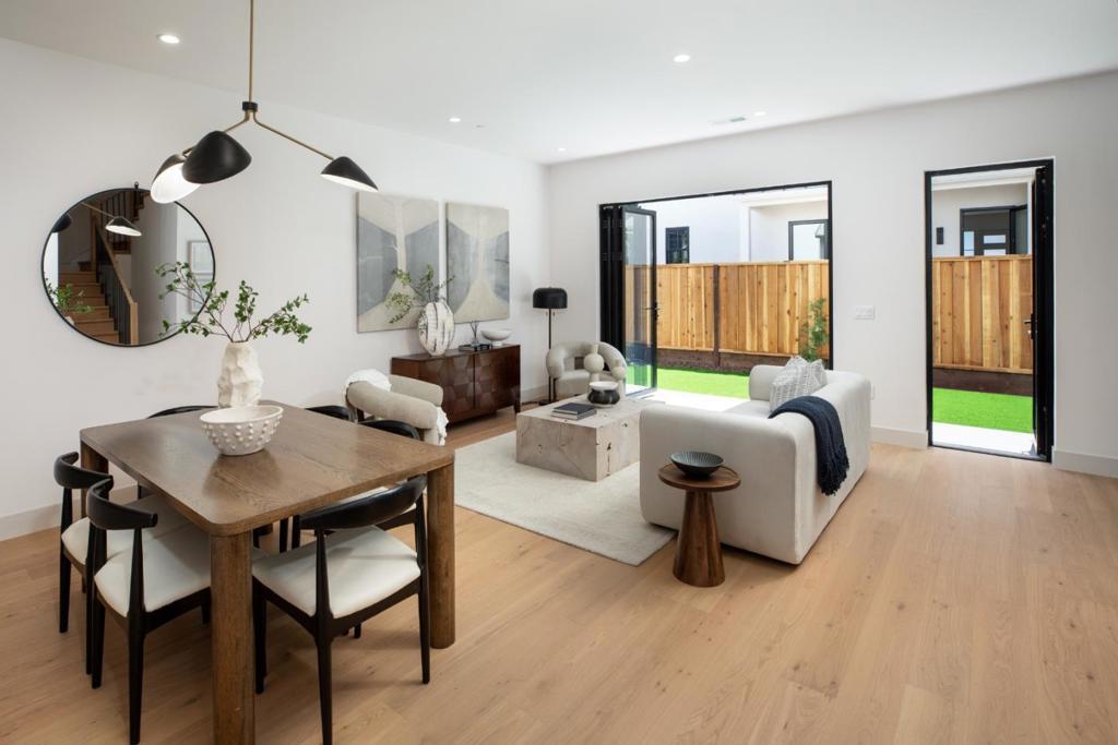 This stunning new construction presents a modern farmhouse design with beautiful finishes in a sought-after Menlo Park location. The two-story floor plan has 4 bedrooms (all 4 bedrooms upstairs) and 3 full baths, stunning hardwood floors, Andersen windows and doors, and abundant natural light. Indoor outdoor living at its best as the living and dining area opens to the rear yard through stacking glass doors. The kitchen features sleek cabinetry, quartz countertops, and premium Thermador and Bosch appliances. The upstairs primary suite has a cathedral ceiling, private balcony, walk-in closet, and luxury bath with freestanding tub and rain shower. Three additional bedrooms share a stylish hallway bath, and a laundry room is also upstairs. Added highlights include attached garage parking for 2 cars, an EV outlet, landscaped yards, Enphase solar energy, and keyless entry. The location is ideal minutes from Meta headquarters, downtown Palo Alto and Menlo Park, and acclaimed Menlo Park schools.