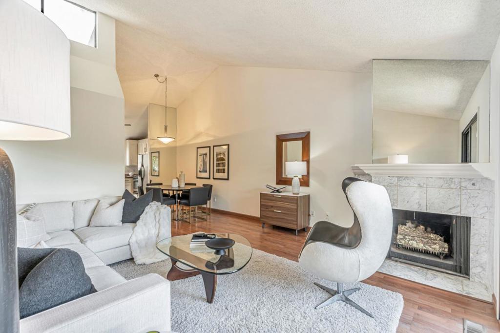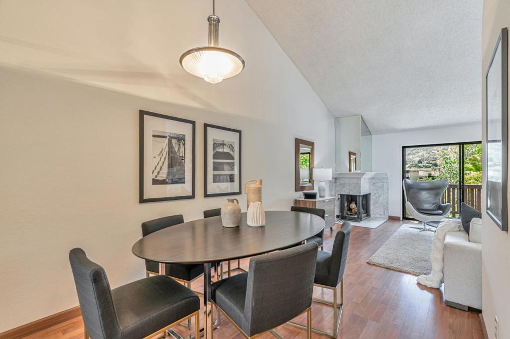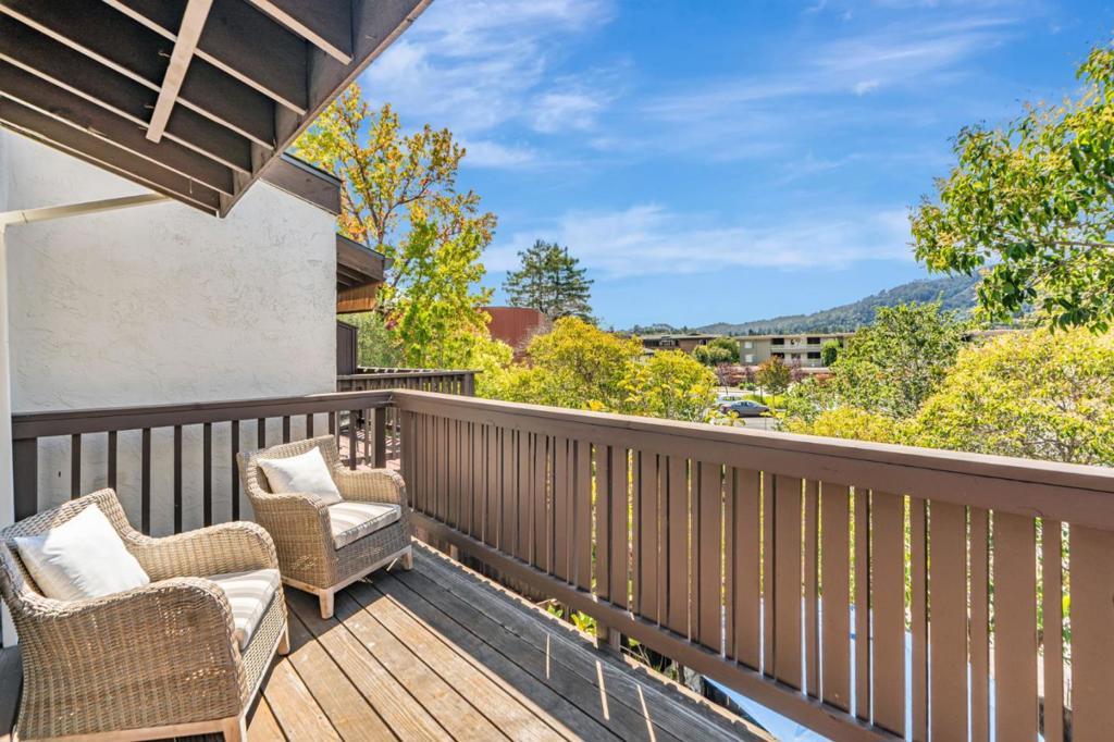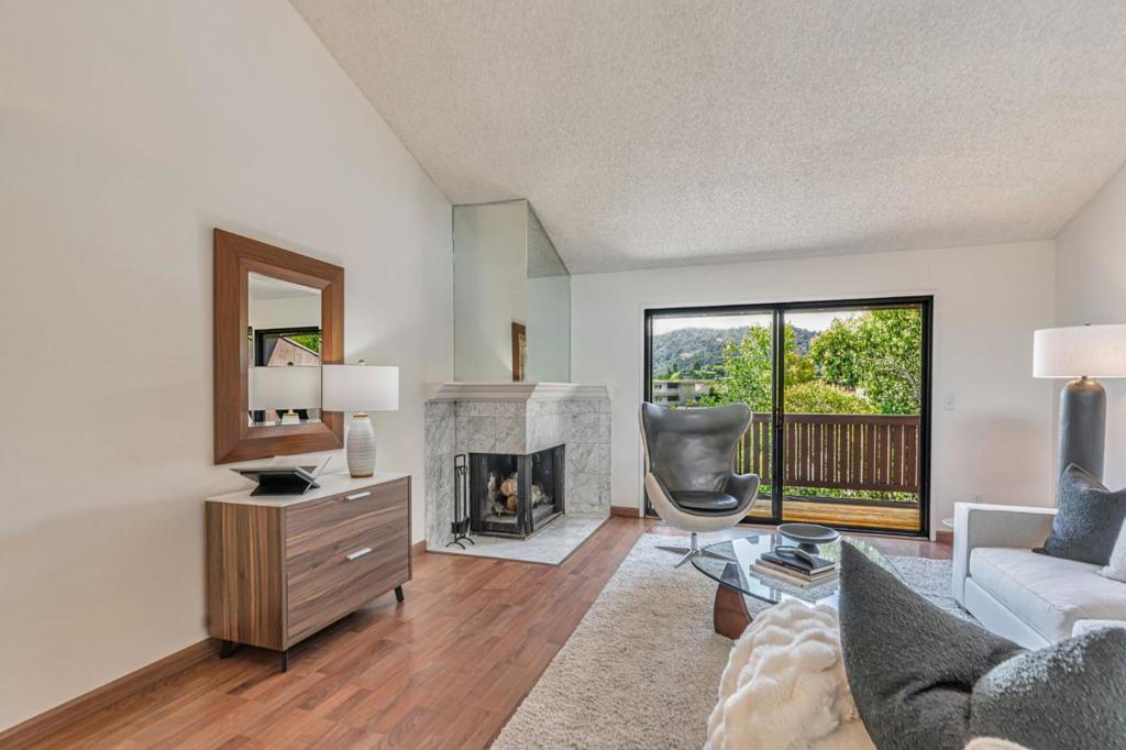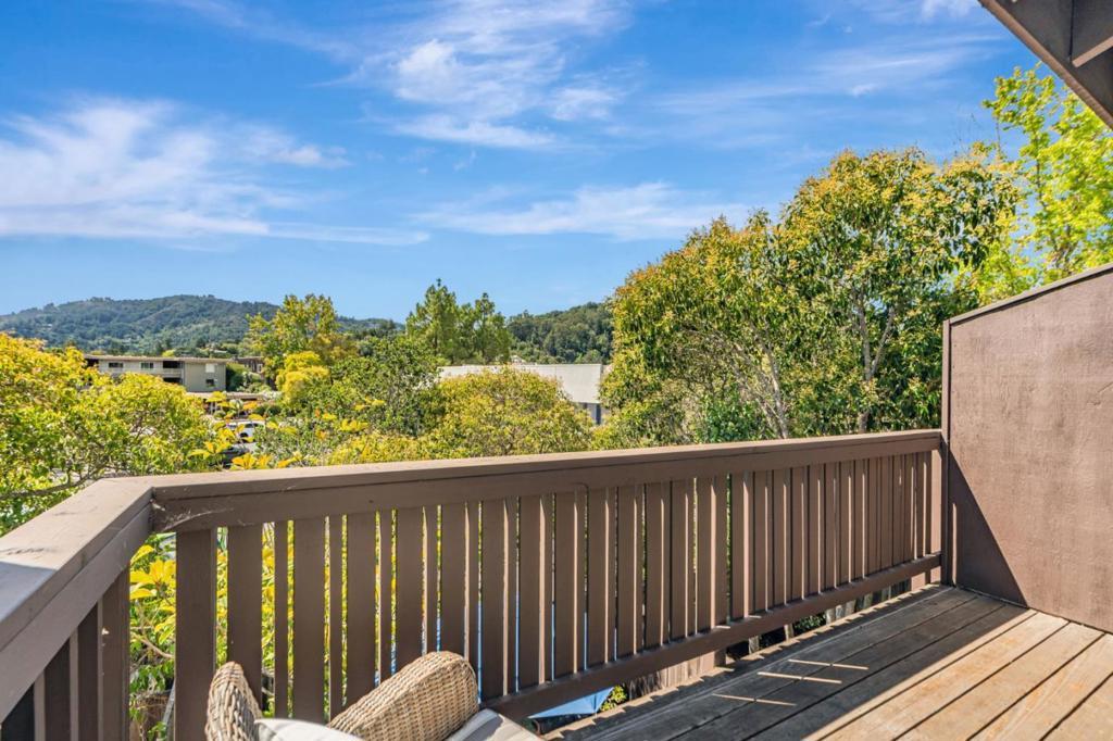 Sited in a prime location in the heart-of-Greenbrae. This 2-bedroom, 1.5 bathroom condominium offers a perfect blend of comfort and community in Central Marin. The building is in a quiet neighborhood, set back off the street. The light-filled, split level floor plan includes a spacious living/dining area with soaring cathedral ceilings, large art walls, a wood burning fireplace and opens to a private west-facing sunny deck. The kitchen has ample cabinetry storage and counter space, stainless steel appliances, granite countertops and flows easily into the dining area. Convenient half bathroom on the main floor. The lower-level features two well-sized bedrooms and a full bathroom with shower over tub. Laundry closet with full size in-unit washer and dryer. Storage area under stairs. The primary bedroom sliding door opens to a fenced patio and deck. Covered parking spot steps away from the unit. Enjoy the best of Marin living with amenities including a pool, easy access to top-rated Kentfield schools, Bon Air Shopping Center, the Larkspur Ferry, and miles of scenic hiking and biking trails. Embrace the balance of serene living right outside your front door.