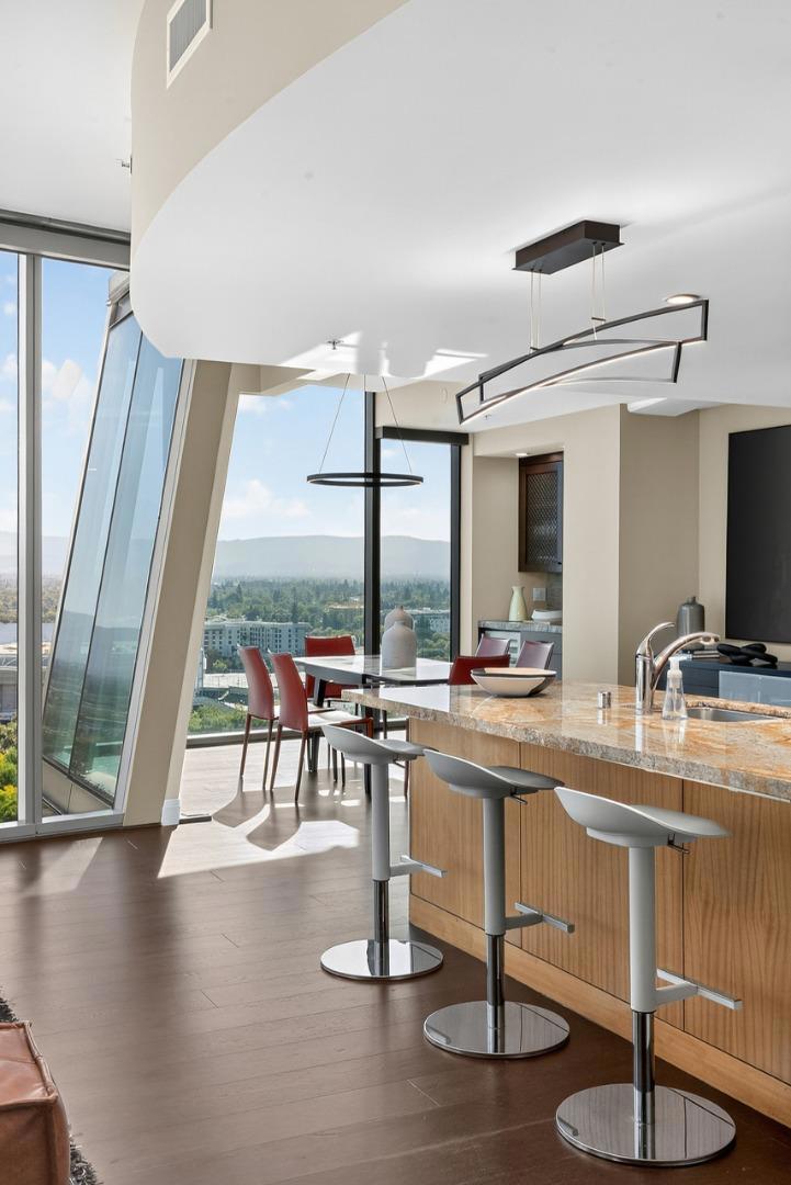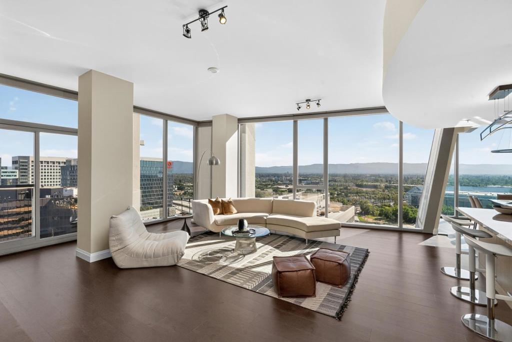 This stunning corner residence soars above the city on the 20th floor, wrapped in floor-to-ceiling windows that capture jaw-dropping, unobstructed views in every direction. The dramatic entry foyer sets the stage, drawing your eye straight to the skyline. Sophisticated details include automatic one-touch shades, granite countertops, a built-in Sub-Zero refrigerator, a dedicated dining area framed by breathtaking vistas, and a dry bar accented with an elegant chandelier. The living room features a custom-built TV wall with shelving and a Juliet balcony window for fresh air and light. The primary suite showcases west-facing sunset views, soaring ceilings, a stall shower, and a soaking tub, while the second bedroom offers flexibility for guests or a home office. This rare unit also includes highly coveted private storage. Live in luxury with 24-hour concierge service, a fully equipped fitness center, residents lounge for entertaining, poolside lounge areas with an outdoor fireplace, bbq stations and a 2 relaxing jacuzzis. Situated in the heart of downtown San Jose, you're just steps from San Pedro Square, the SAP Center, local farmers markets, light rail, and Diridon Station. Experience the ultimate in elevated urban living-welcome to the AXIS lifestyle.