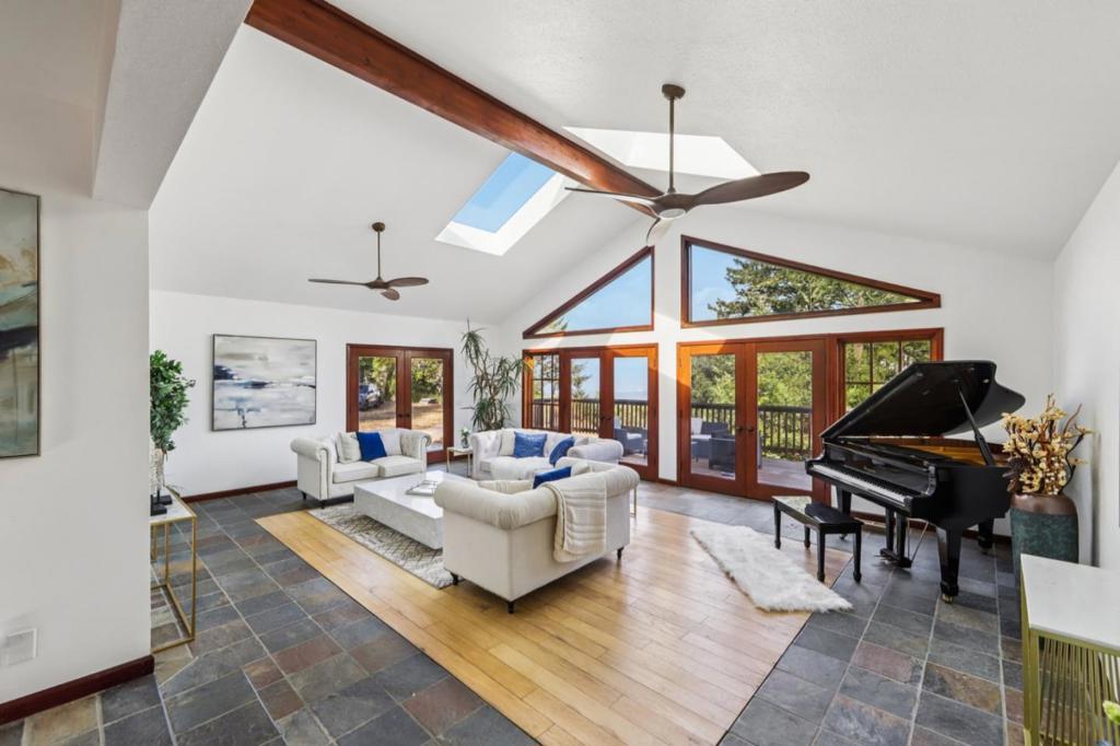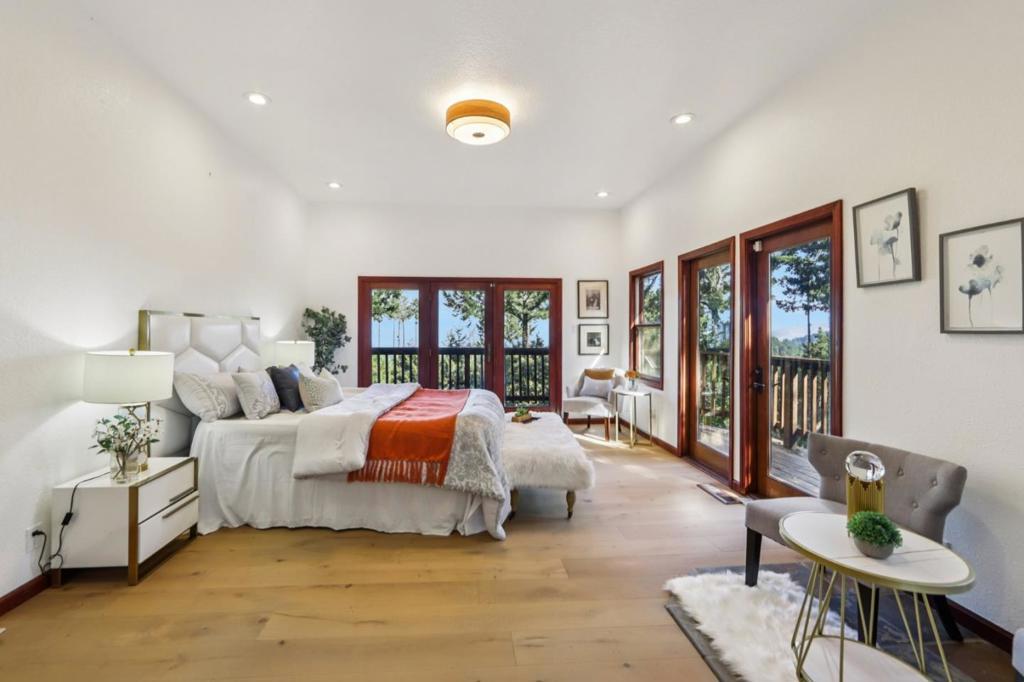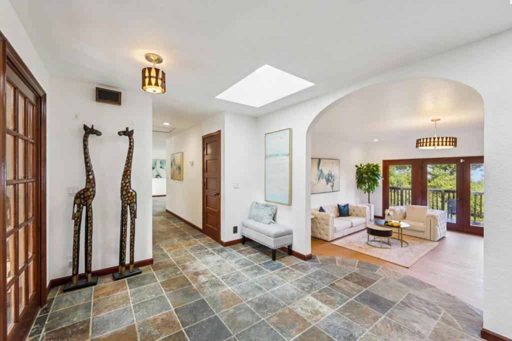 Perched a top of Skyline Ridge, this gated custom estate offers spectacular views of the San Francisco South Bay, including Mt. Diablo, Stanford, and San Jose. Nestled on a private 5+ acre east-facing parcel near the 942-acre Wunderlich Park, the home features 5 bedrooms, 4.5 bathrooms, 4 large decks, and a 2-car garage. The gourmet kitchen with center island, dining room, and large pantry opens to the great room with vaulted ceiling, skylights, and 3 French doors. Upstairs showcases imported slate floors, a central family/activity room, a guest half bath, a library/office, and a spacious primary suite with a walk-in shower, a 2-person jetted spa, a private deck, double sinks, a bidet, and a walk-in closet. A nearby flexible room could serve as a bedroom, nursery, or den. The laundry area opens to a flat yard suitable for a future pool, tennis court, or stables. Downstairs includes 2 bedrooms, a large bath, a sitting room, and a fully self-contained ADU with private entry and a deck. In the coveted Portola Valley/Woodside School District, the estate feels private yet is minutes from Alice's Restaurant, Fogarty Winery, central Woodside, Stanford, and the Coast.