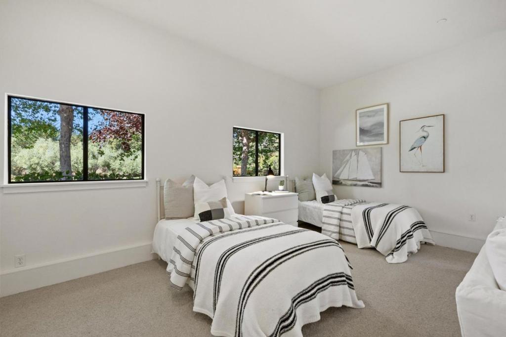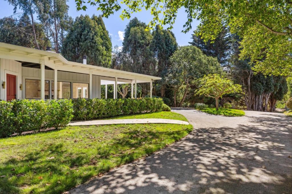 Nestled just two miles from Carmel, this property offers a serene escape on 1.8 acres of lush landscape. Surrounded by the soothing sounds of the Carmel River and whispers of the leaves this haven reveals a charming residence with expansive lawns and vistas. The single-story main home features a beautifully appointed three-bedroom, two-and-a-half-bath layout with light-filled spaces and an inviting eat-in kitchen. A stone fireplace, custom bookshelves, and refinished oak floors are enhanced by a skylight that illuminates marble counters and high-end appliances. With ample windows and doors leading outside, the living area extends to outdoor spaces, ideal for entertaining. The primary suite, a tranquil retreat, features a bay window overlooking a private fenced yard and deck. The spacious bath offers a spa-like experience with granite and stone finishes. A standalone one-bedroom, one bath guest house provides versatile space for guests or an office. Enjoy breathtaking southwest mountain views, framed by lawns and olive trees. The grounds include a two-stall barn with paddocks, a workshop, and a tack room. The property is supported by its own irrigation well and CalAm water service. This is more than a home; it's a place to celebrate life in Carmel Valley with friends and family.