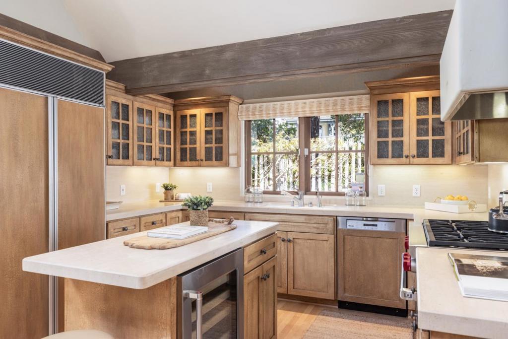 This charming Carmel cottage blends timeless character with modern luxury. Built by Chris Tescher Construction, the home showcases exceptional craftsmanship with vaulted ceilings, custom wood beams, and a Carmel stone fireplace anchoring the inviting living spaces. The chefs kitchen features solid surface countertops, a Sub-Zero refrigerator, Wolf range, and a center island with wine fridge. With three bedrooms and two bathrooms, the home includes a serene primary suite offering ocean peeks, a custom walk-in closet, and a spa-like bath with a jetted tub. Enjoy fireplaces in the living room, dining room, and outdoors, providing a cozy yet elegant ambiance. Set on a corner lot, the property provides beautiful Carmel stone patios and walkways, along with private outdoor areas for dining and entertaining. A whole-house generator adds convenience and peace of mind. Just a short stroll to Carmel Beach, shops, and restaurants, this storybook home captures the essence of Carmel-by-the-Sea living.