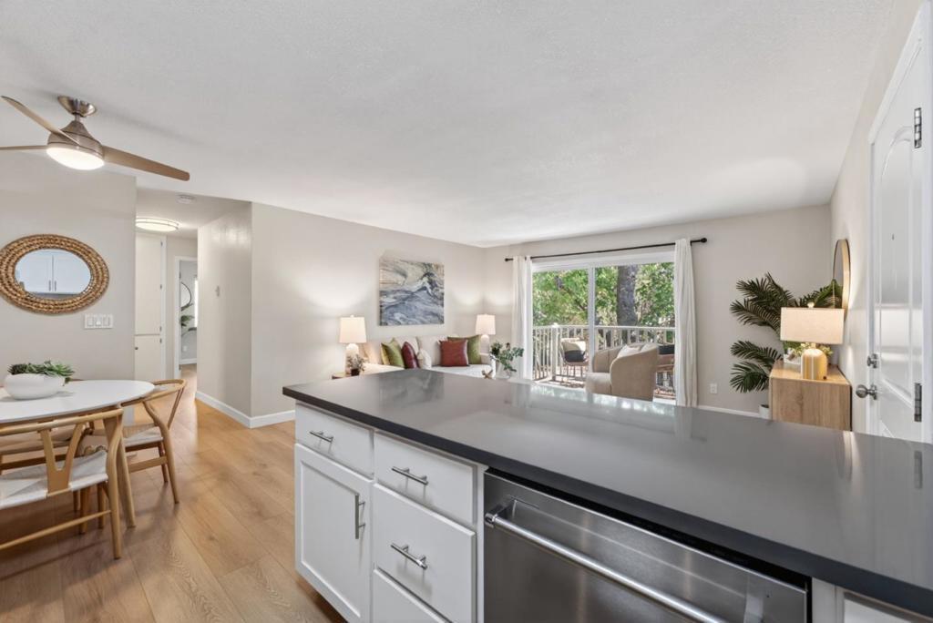 Move right in and start living the ultimate Santa Cruz beach life! This beautifully updated, top-floor, end-unit condo is perfectly situated just a few blocks from the sand, the Harbor, and some of the areas best restaurants, coffee shops, beaches and breweries. Step inside to find a bright, open living area that flows effortlessly into a modern kitchen featuring quartz countertops, stainless steel appliances, shaker cabinets, and a stylish tile backsplash. Enjoy morning coffee or evening breezes on your sunny private deck surrounded by mature trees and landscaped grounds. The primary bedroom overlooks Schwan Lagoon, has multiple windows and includes a large walk-in closet. The community offers resort-style amenities including a pool, gym, clubhouse, multiple BBQ areas and open green spaces. Whether you're looking for a primary home or a weekend coastal retreat, this one has it all; style, comfort, and that signature Santa Cruz vibe. Welcome home!