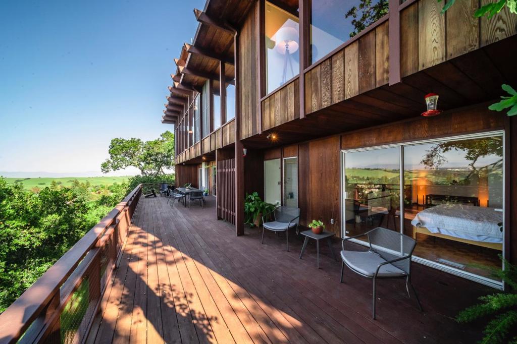 Mid-Century Modern enthusiasts will delight in this one of a kind architectural gem. Designed by architect Alan Blair, this home boasts three levels of blissful views reaching from San Francisco to Santa Clara. A host's dream! Tucked away from the flats, this stunning retreat is quiet and private. The home boasts three large decks, a hot tub, two gas fireplaces, an expansive remodeled lower level and two Tesla chargers in the garage, five bedrooms and three and a half bathrooms, an office upstairs and two living areas. The dining room contains Herman Miller light fixtures and high ceilings meet walls of expansive glass to thrill and entertain guests. Come claim this magical home that some have said has the best views in the Silicon Valley and experience all that this great community of Ladera offers.
