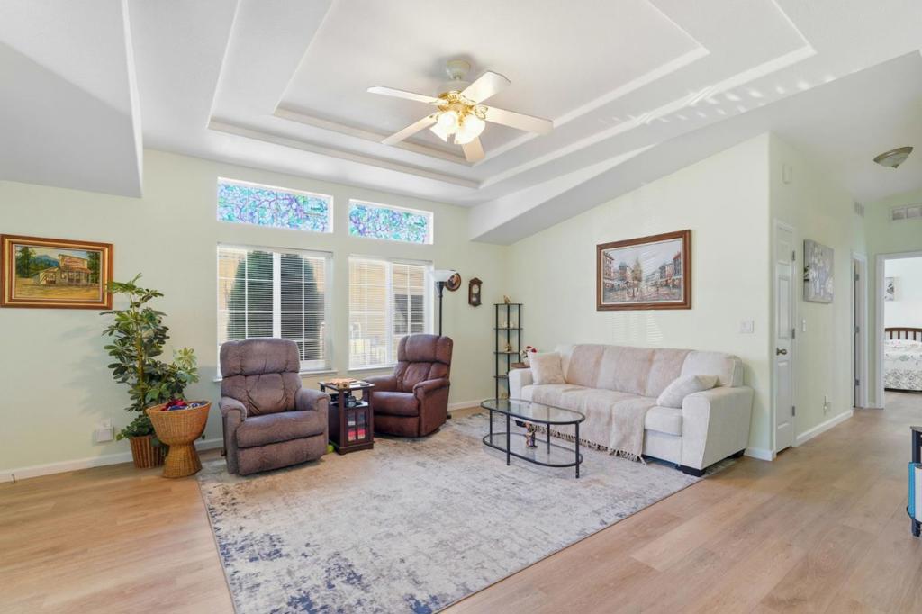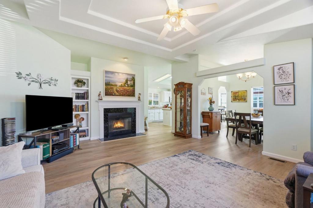 Welcome to Villa Teresa #845, a place where Luxury, Location, and Style collide in a place that you will sure to call home. Come look at this stunning and highly upgraded 2004 Silvercrest 3bed 2bath beauty. Located in the heart of Silicon Valley and just 5min away from The Oakridge Mall, makes this location very desirable. Enjoy approximately 1,731 sq-ft of living space nestled in the community of Villa Teresa for Older Adults. To start this home features a wonderful outdoor front porch for relaxing in the sun. As you enter you are greeted by a freshly painted interior and decorated with newly installed laminate flooring. Living room is coated with light created by the soaring tower dormer. Just off the living room sits a formal dining room with access to the kitchen. A large open kitchen awaits you with stainless steel appliances, center island, breakfast nook bay window, skylight and newly painted cabinets. Home features a large master bedroom with a tower dormer for extra light, 2 walk-in closets, a spacious master bathroom with double sinks and extra storage cabinet above toilet. From ceiling fans, stacked windows, upgraded cabinets, fireplace, shed, AC, washer/dryer, and 3 car parking, all make this home very desirable and move-in ready.