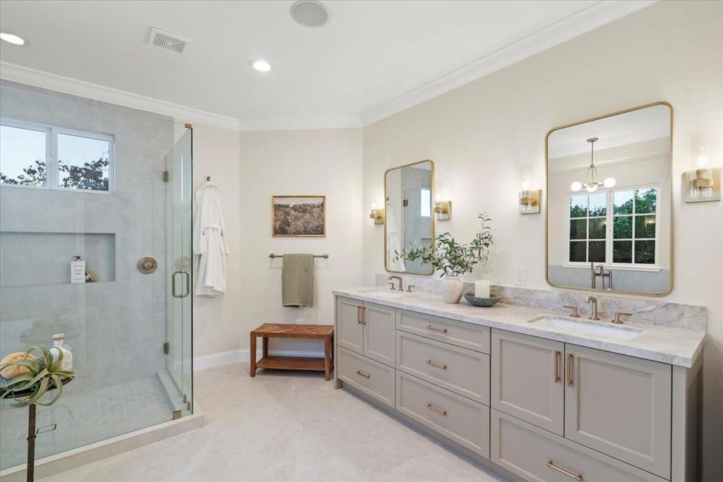 Don't miss this stunning custom home in The Forest, a gated intimate community, with beautiful city light and mountain views. The private lot showcases a gorgeous remodeled main home and a charming cottage that could be a guest suite. The large lot provides an expansive paver driveway with lots of parking and an oversized 4 car garage. The living room, family room and downstairs primary suite all focus on the views. Upstairs a second family room, office and balcony all have beautiful views. Fresh interior paint, new wood floors throughout the downstairs, all new LED lighting and fixtures are some of the features in this elegant home. The kitchen has been updated including quartzite counters and the primary bath has been completely remodeled with quartzite counters, radiant heated floors, freestanding tub and frameless shower. The primary suite has his and hers walk in closets. A sweeping staircase accesses the 2nd family room or recreation room with wet bar and fireplace, across from a large built in office. Incredible storage and additional upstairs bedrooms provide lots of family space. The delightful cottage with fireplace and deck set against the backdrop of a lovely forest could be a guest retreat or artist space. Owned solar with battery back up and a generator!
