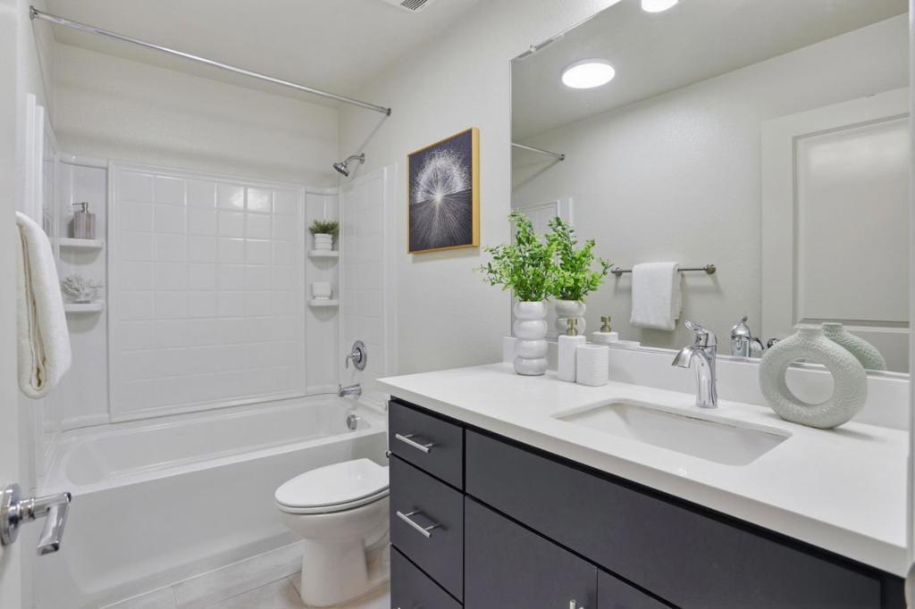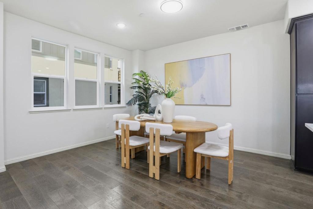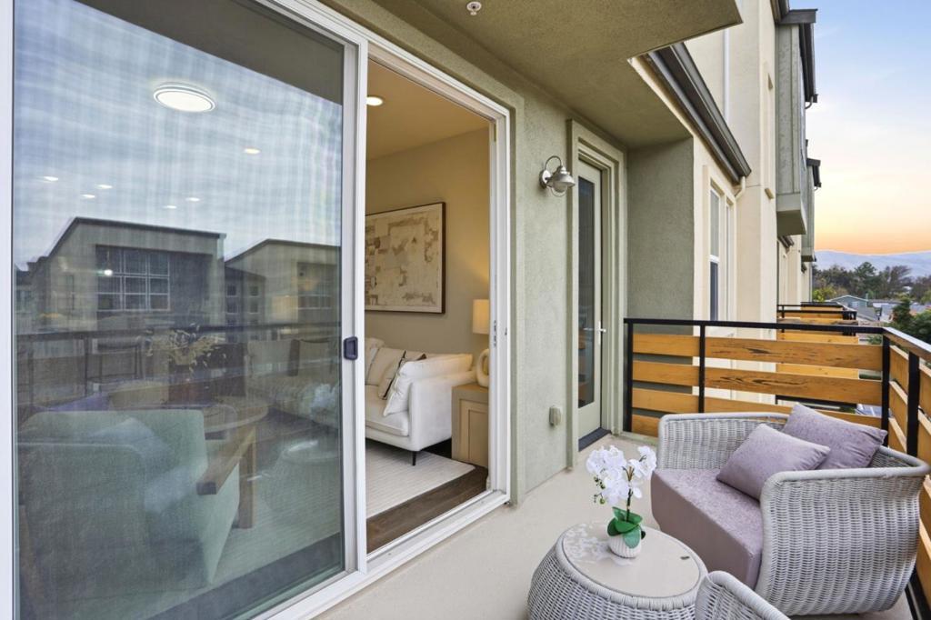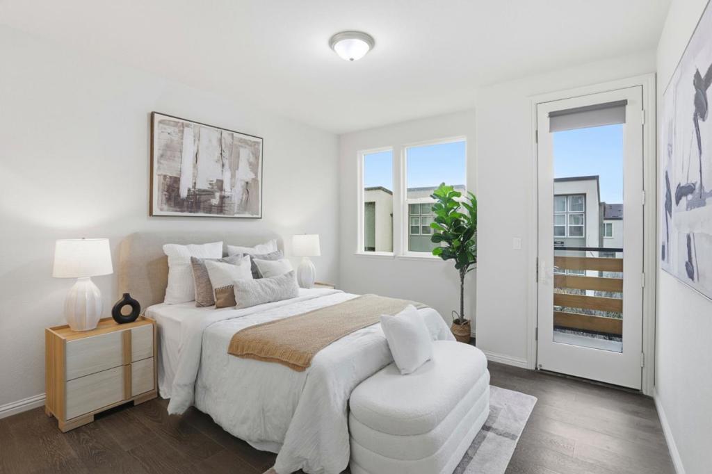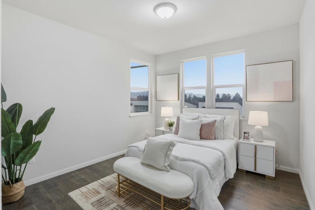 Immaculate and impeccably maintained, this 4-bedroom corner unit townhome boasts a premium location and stunning open views. It features abundant large picture windows offering lush greenbelt views from most rooms and opulent soothing natural light. The open floor plan is decorated in contemporary neutral colors and quality engineered wood floors throughout. The spacious and functional kitchen is equipped with ample dark Shaker cabinets, SS appliances, expansive marble counters, and a large central island with a convenient breakfast bar. Step out onto the intimate deck from the living room, seamlessly blending indoor and outdoor living. The generous master suite includes a lavish ensuite bath with a large shower, dual-sink vanity, and a spacious walk-in closet while the elevated ceiling creates airy atmosphere. The secluded main floor guest/in-law bedroom is adjacent to a full bath, providing privacy and convenience. Enjoy outdoor activities in the nearby Newbury Park. Community amenities include a BBQ/picnic area and a dog-friendly park. Convenient location: short commute to downtown San Jose, Japantown, and shopping centers like Costco, Ranch 99, and H-Mart, easy access to BART, VTA, freeways 101/680, and within walking distance to Google and Meta shuttle stops.