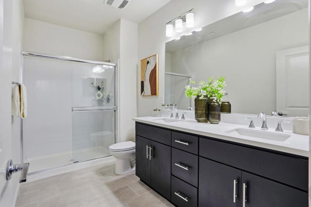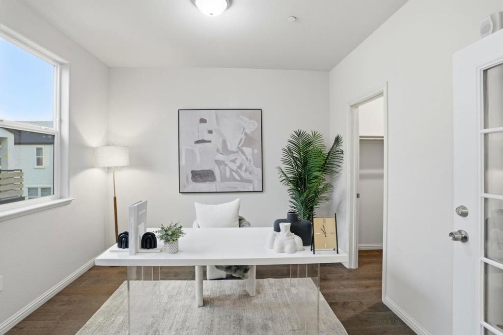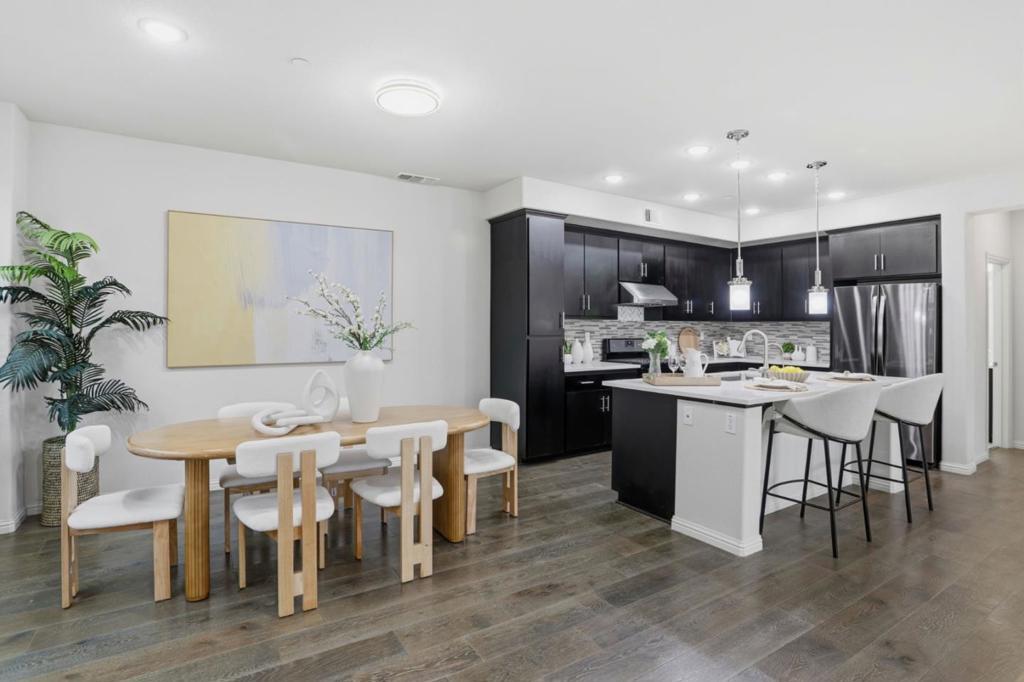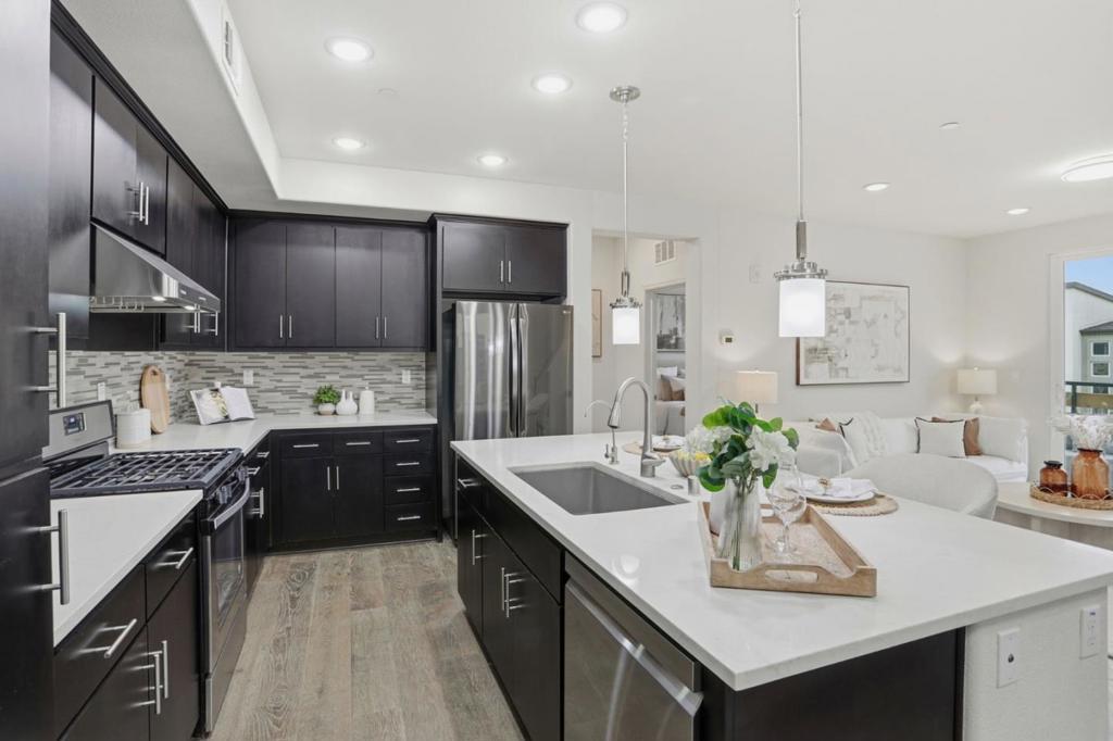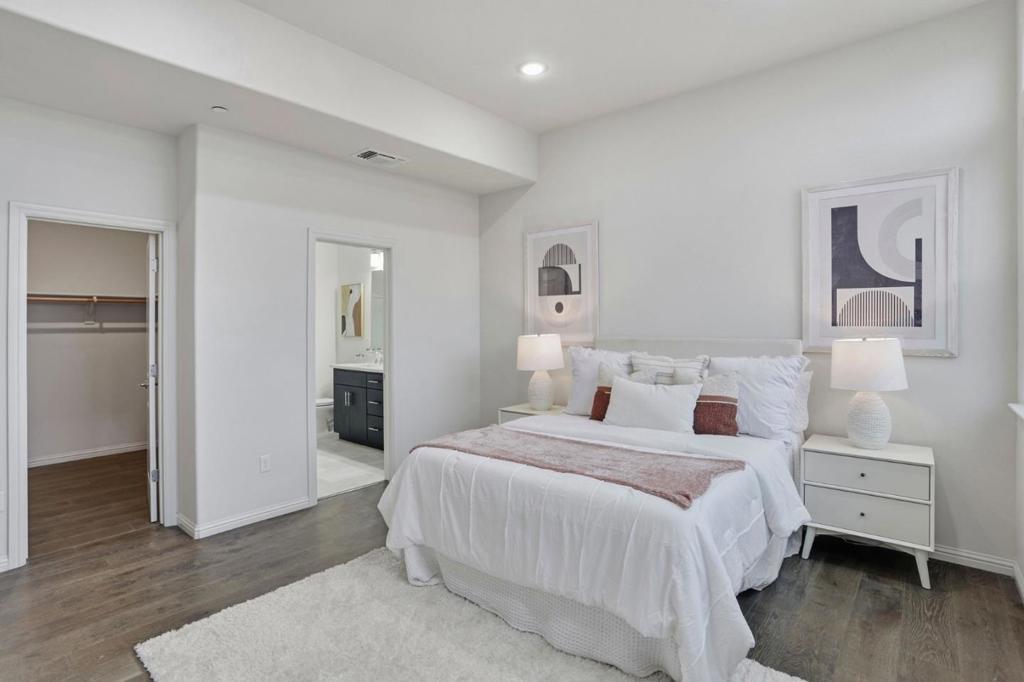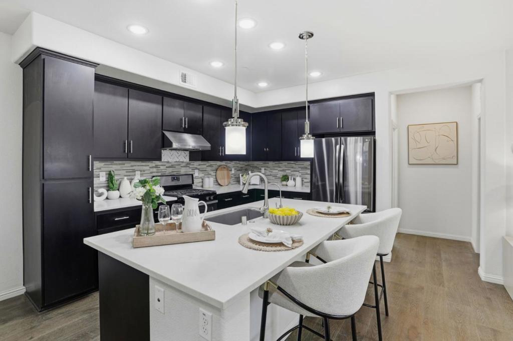 Immaculate and impeccably maintained, this 4-bedroom corner unit townhome boasts a premium location and stunning open views. It features abundant large picture windows offering lush greenbelt views from most rooms and opulent soothing natural light. The open floor plan is decorated in contemporary neutral colors and quality engineered wood floors throughout. The spacious and functional kitchen is equipped with ample dark Shaker cabinets, SS appliances, expansive marble counters, and a large central island with a convenient breakfast bar. Step out onto the intimate deck from the living room, seamlessly blending indoor and outdoor living. The generous master suite includes a lavish ensuite bath with a large shower, dual-sink vanity, and a spacious walk-in closet while the elevated ceiling creates airy atmosphere. The secluded main floor guest/in-law bedroom is adjacent to a full bath, providing privacy and convenience. Enjoy outdoor activities in the nearby Newbury Park. Community amenities include a BBQ/picnic area and a dog-friendly park. Convenient location: short commute to downtown San Jose, Japantown, and shopping centers like Costco, Ranch 99, and H-Mart, easy access to BART, VTA, freeways 101/680, and within walking distance to Google and Meta shuttle stops.
