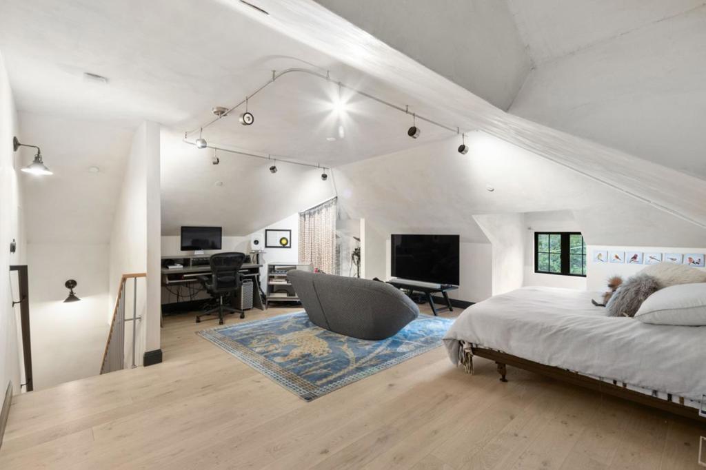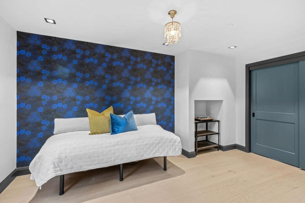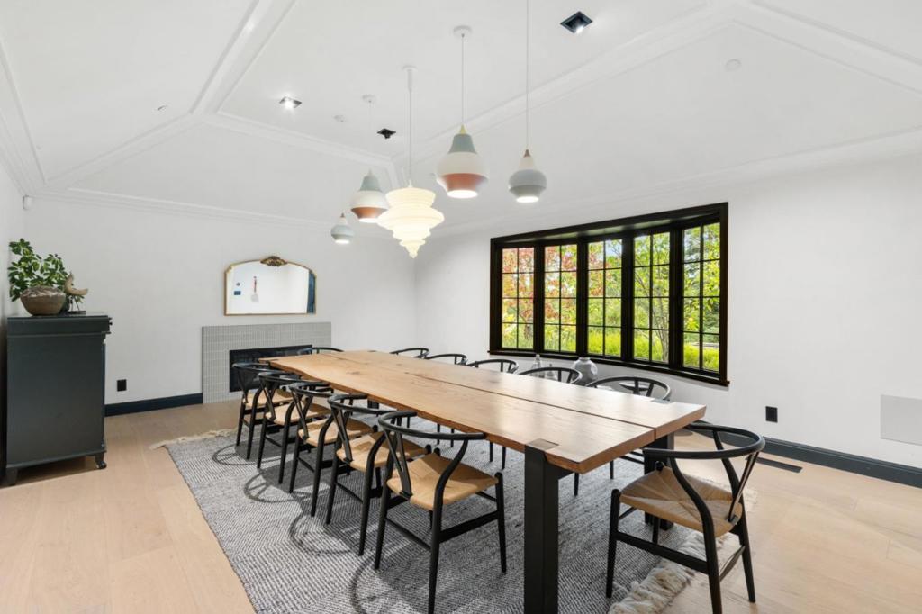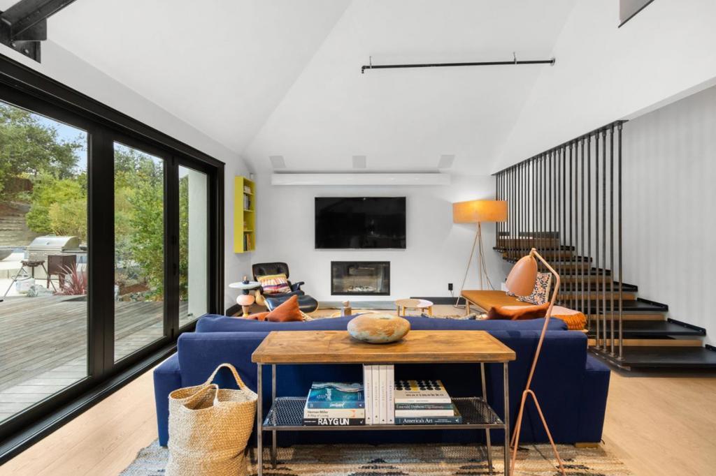 A whole-home renovation has transformed this European-inspired contemporary residence on approx. 1.49 acres with landscaped grounds and multiple outdoor entertaining areas. The home offers 6 bedrooms, 3.5 baths, a finished loft, and a detached studio, plus an iconic kitchen/family great room and dedicated housekeeping room. Imported Finnish oak floors, hand-troweled plaster walls, and vaulted ceilings highlight refined craftsmanship throughout. The open kitchen features high-end Finnish cabinetry, honed quartz counters, striking full-height tile, two islands, a wine cooler, and Wolf/Subzero appliances. A housekeeping room doubles as a prep kitchen for events. The adjoining family room includes a contemporary fireplace, retractable glass doors, and concealed 120-inch screen with 5.1 surround sound. The primary suite offers a Danish gas fireplace, spa-like bath, and large walk-in closet. Four additional bedrooms on the lower level open to the outdoors for easy pool and garden access. Outdoor spaces include a beach-shelf pool, elevated spa, fire pit terrace, and a gazebo with Bay views. The home has comfortably hosted 120+ guest events. Modern amenities include Control4 automation, extensive audio, security systems, and a 4-car garage with two Tesla chargers.
