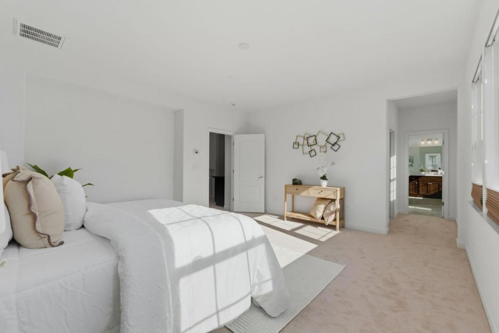 Nestled on a private street in a community adjacent to Greenwood Park. North facing with no rear neighbors, this bright and airy home offers privacy and a peaceful setting. The open floor plan features high ceilings, a modern kitchen with granite countertops, island with stainless steel sink, gas range, high-powered hood, full backsplash, and designer Mocha cabinets with metal handles, along with upgraded carpet and premium padding. The interior has been professionally painted and includes an interior sprinkler system for added safety and potential insurance savings. Enjoy year-round efficiency with double-pane windows, a tankless water heater, and dual-zone heating and AC. The low-maintenance backyard features stamped concrete and a professionally installed pergola, ideal for outdoor relaxation. The home includes a first-floor bedroom and full bath, plus an upstairs primary suite with a large walk-in closet and master bath with a make-up desk. A spacious laundry room with utility sink, 2-car garage, and private driveway provide convenience, while the HOA maintains the front yard. Walking distance to Chabot College and Southland Mall, with easy access to the San Mateo Bridge and Hwy 880, this move-in-ready home blends comfort, style, and practicality.