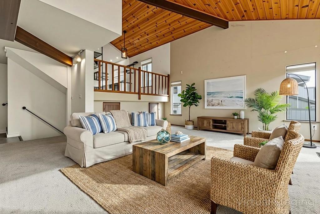 Beautifully updated and thoughtfully designed, this 2-bed, 2-bath end-unit townhome with a loft/office offers 1,287 sq. ft. of bright, inviting living space. This architecturally interesting unit features vaulted, wood-clad ceilings & large windows filling it with natural light, while luxury vinyl flooring flows through most. The updated kitchen features white cabinetry, open shelving, tile backsplash, quartz counters, & stainless appliances, opening seamlessly to the dining area & living room for effortless entertaining. The living rooms tiled wood-burning fireplace adds warmth & charm. The spacious primary suite on main level includes multiple closets & an updated ensuite with walk-in shower, dual vanities, & modern tile finishes. A generous second bedroom, in-unit laundry & utility rooms complete the layout. Enjoy outdoor living with three decks & a private fenced backyard (approx. 325 sq. ft.) a rare find in townhome living! Additional highlights include attached two-car garage, ample guest parking, and great storage throughout. Ideally located near Skypark, the Farmers Market, restaurants, and shopping, this townhome offers the perfect blend of comfort, convenience, and style just minutes from the beach. Also a quick drive to famed Santa Cruz beaches and the Redwoods.