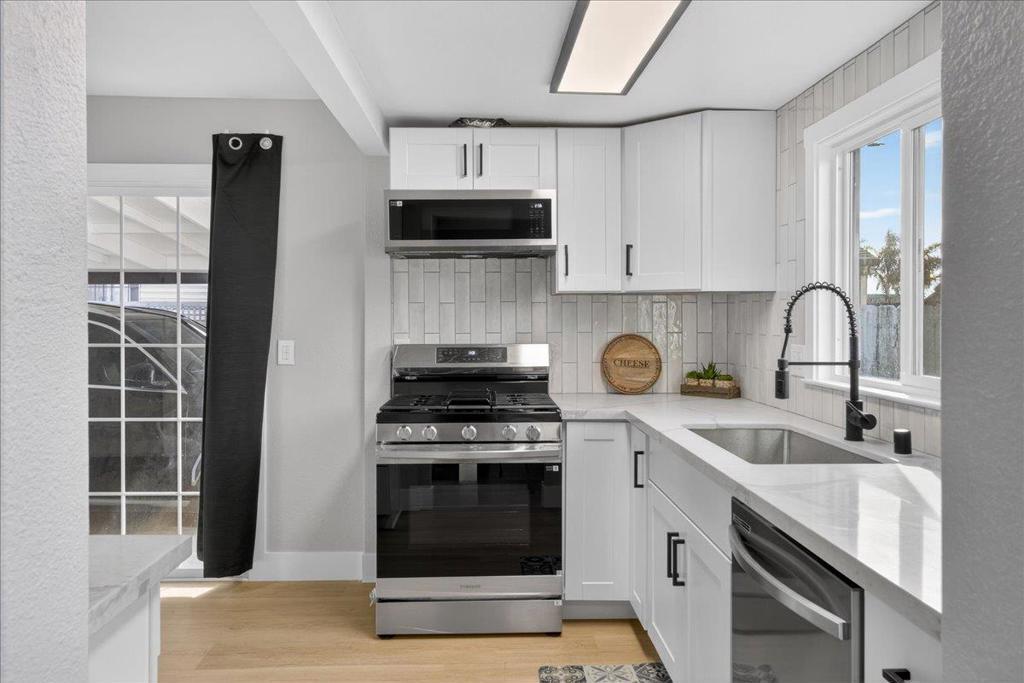 WOW!! WOW!! WOW!! Welcome to this completely updated and charming 2-bedroom, 1-bathroom home nestled in the heart of Salinas. This lovely residence offers 948 sq ft of comfortable living space, perfect for first-time buyers or those looking to downsize. The updated kitchen features sleek quartz countertops, a gas oven range, dishwasher, microwave, and garbage disposal, making it a delight for any home chef. Paint and new laminate flooring throughout makes the home feel fresh. The home boasts tile flooring in the bathroom, which is equipped with a shower and tub combination. Enjoy the cozy ambiance of the living area, which is open to the dining and kitchen making it feel bright and airy. The convenience of inside laundry adds to the home's practicality. This home sits on a spacious 6,000 sqft lot, with a big driveway and a large entry gate to the backyard. This makes it ideal for an entryway to a potential ADU! Don't miss the opportunity to make this delightful Salinas home your own.