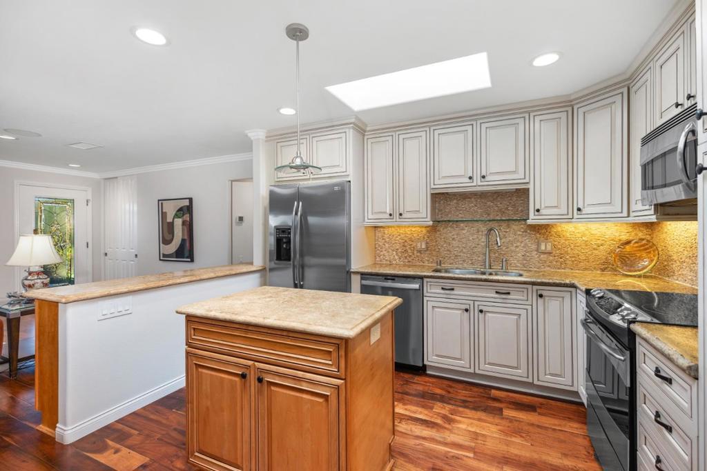 Stunning remodel features fabulous sunny floor plan and exceptional quality. Beautiful view, private location. Open kitchen w/french cream cabinets, granite & limestone countertops, tumbled backsplash, stainless GE Profile appliances, skylight, recessed lighting, added cabinet & counter space-including a limestone-topped island.Glass-front lighted cabinets in dining area & entry.Dining area features built-in china cabinet area & custom recessed lighting over the table.Living room features built-in entertainment unit w/electric fireplace, custom french doors access private patio w open view+skylight and recessed lighting.Amenities throughout feature wood and tile floors,custom cabinets(some with glass fronts for display),recessed lighting,fans in all bedrooms,surround sound,central air+plantation shutters.Exquisite bathrooms feature onyx countertops,light tunnels,shower over jetted tub in hall bath and dual headed shower in Primary Bathroom.Third bedroom is currently fitted as an office with built-in desk featuring granite counters and backsplash+custom cabinets.Inside laundry with additional storage closets and washer and dryer+hallway linen custom cabinets+additional display shelves.Charming private view patio with access from Living Room provides seamless indoor/outdoor living.