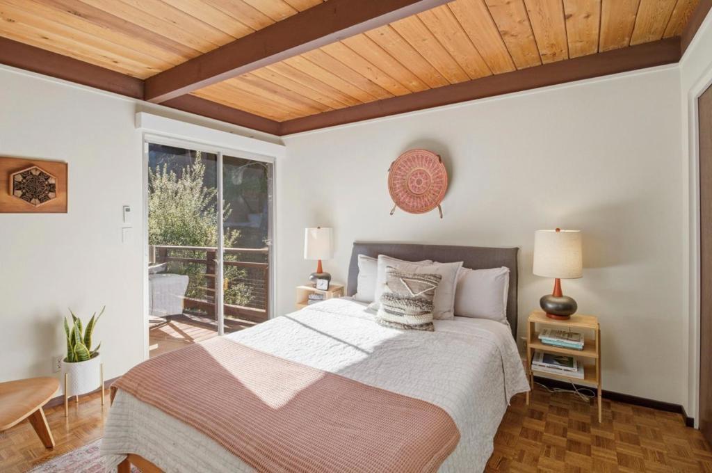 Mid-Century Modern enthusiasts will delight in this one of a kind architectural gem. Designed by architect Alan Blair, this home boasts three levels of blissful views reaching from San Francisco to Santa Clara. A host's dream! Tucked away from the flats, this stunning retreat is quiet and private. The home boasts three large decks, a hot tub, two gas fireplaces, an expansive remodeled lower level and two Tesla chargers in the garage, five bedrooms and three and a half bathrooms, an office upstairs and two living areas. The dining room contains Herman Miller light fixtures and high ceilings meet walls of expansive glass to thrill and entertain guests. Come claim this magical home that some have said has the best views in the Silicon Valley and experience all that this great community of Ladera offers.